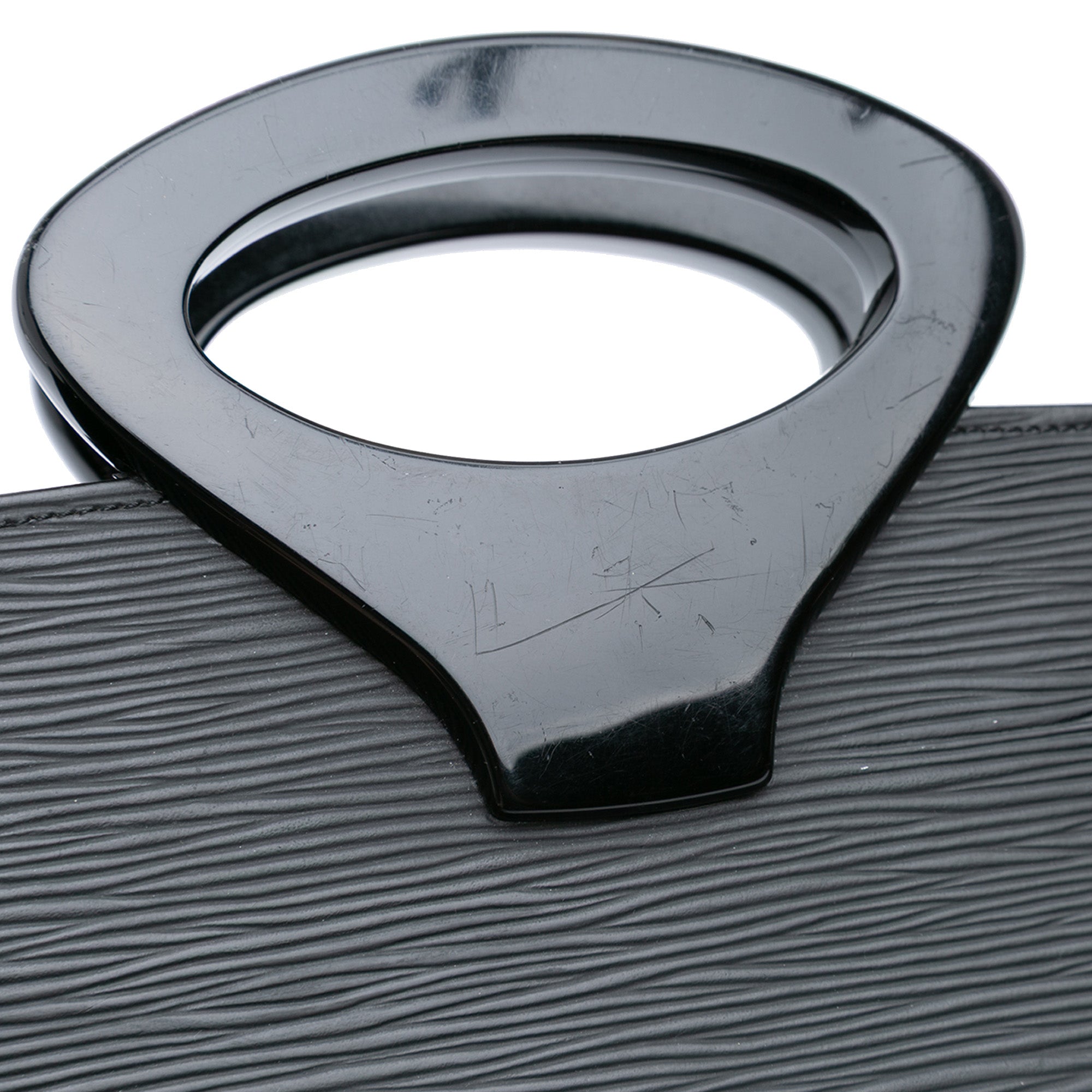 Product Details: Black Louis Vuitton Epi Ombre Tote Bag. The Ombre features an epi leather body, resin top handles, an open top, and an interior slip pocket. 11" L x 11" W x 2.8" D, 2" drop. Serial number MI0041.