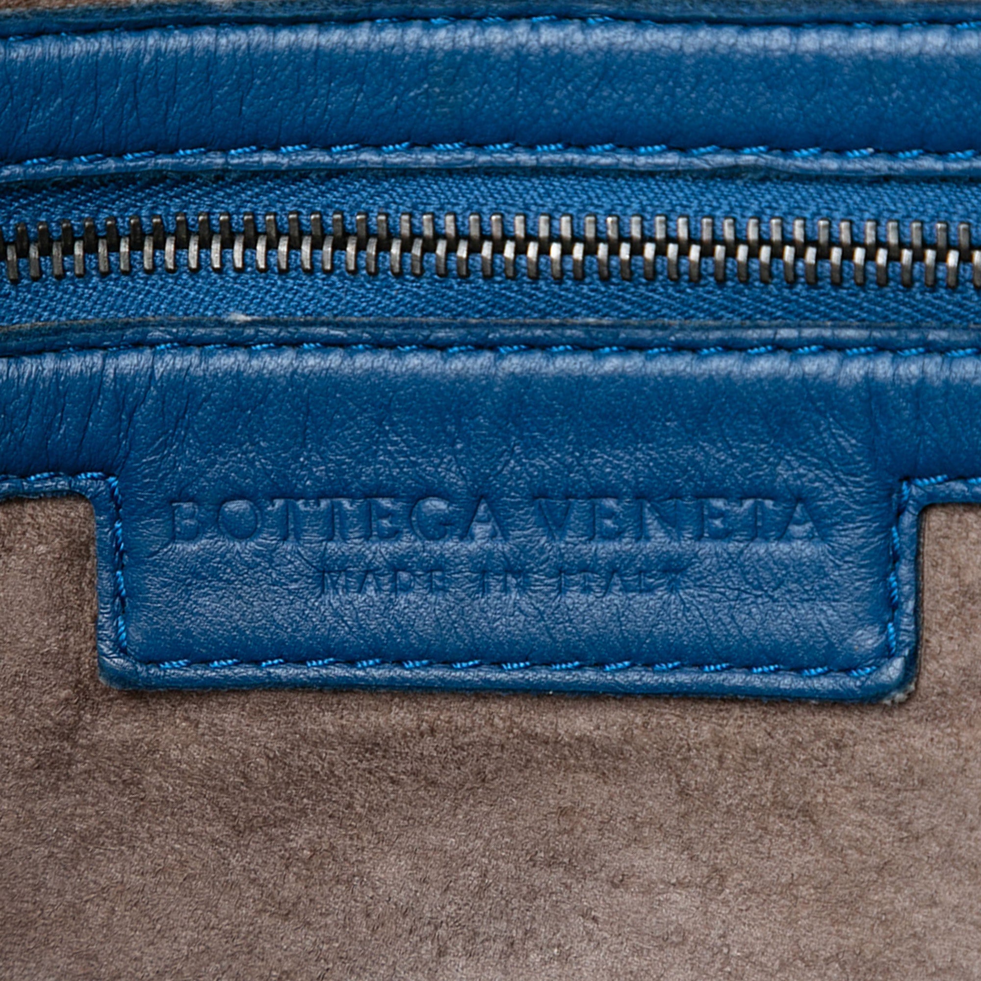 Product Details: Blue Bottega Veneta Large Nappa Intrecciato Nodini Crossbody. The Nodini features a woven leather body, an adjustable flat leather shoulder strap, a top zip closure, and interior zip and slip pockets. Strap has been repainted. 10.2" L x 13.8" W x 2.4" D. Serial number B02977610D.