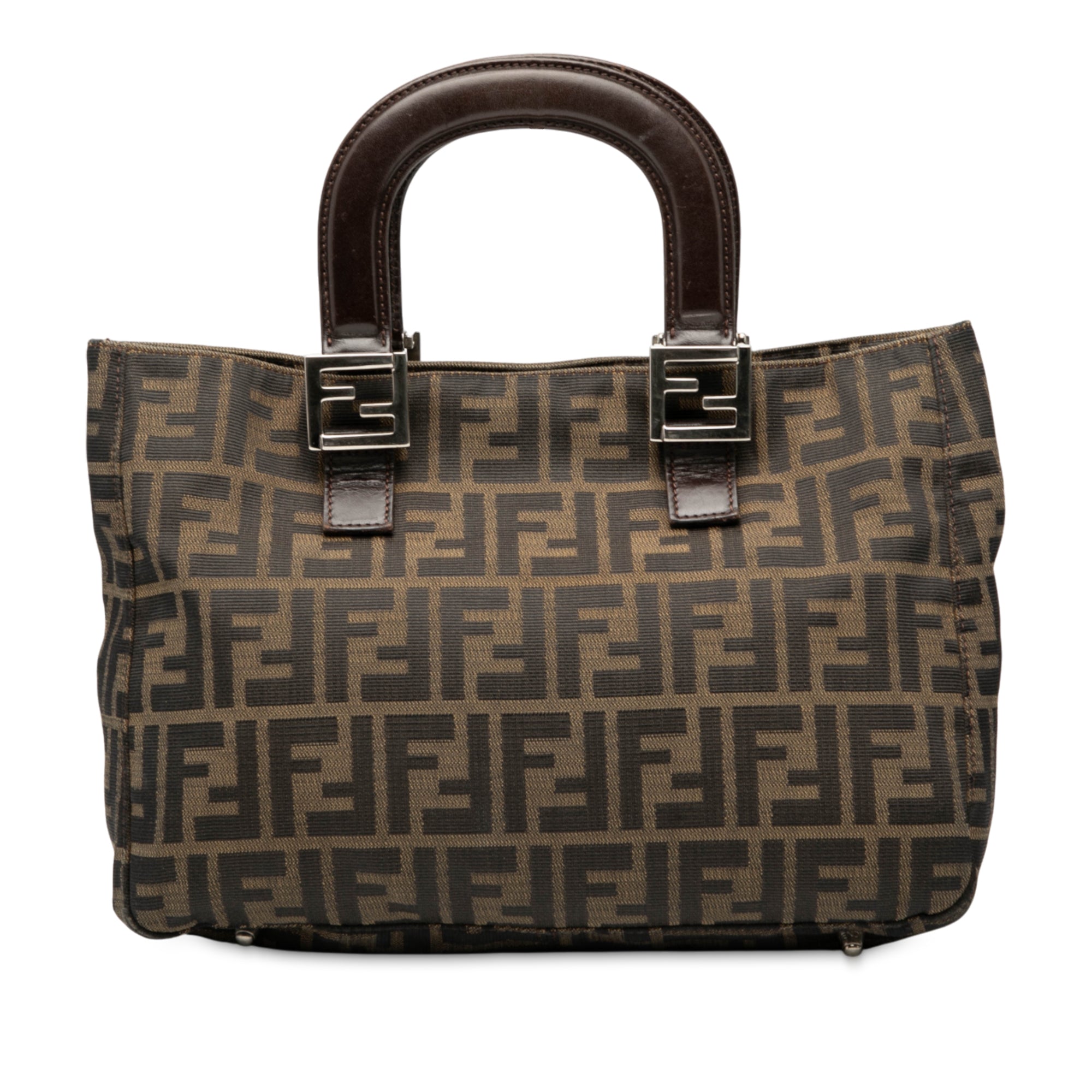 Product Details: Brown Fendi Small Zucca Canvas Twins Tote. This tote features a canvas body, flat leather top handles, an open top with magnetic snap closure, and an interior zip pocket. 8.5" L x 11.4" W x 4.1" D, 3.3" drop.
