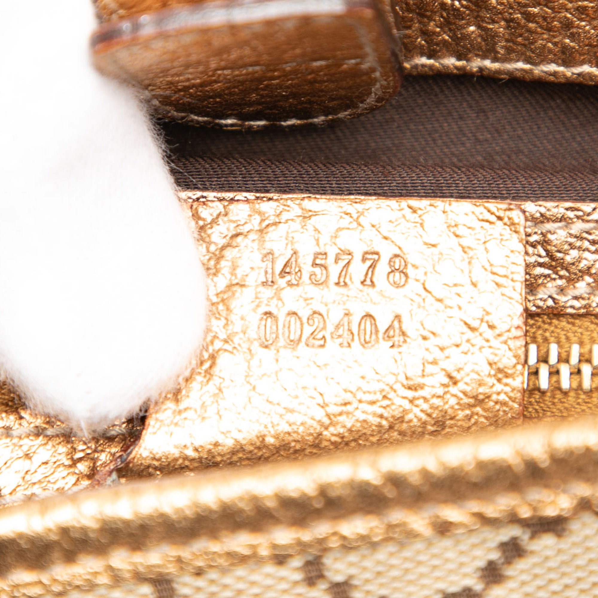 Product Details: Brown Gucci GG Canvas Punch Shoulder Bag . This Punch shoulder bag features a canvas body with leather trim, a flat strap, an open top with magnetic closure, and an interior zip pocket. 7.9" L x 13" W x 0.8" D, 9.1" drop. Serial number 145778 002404.