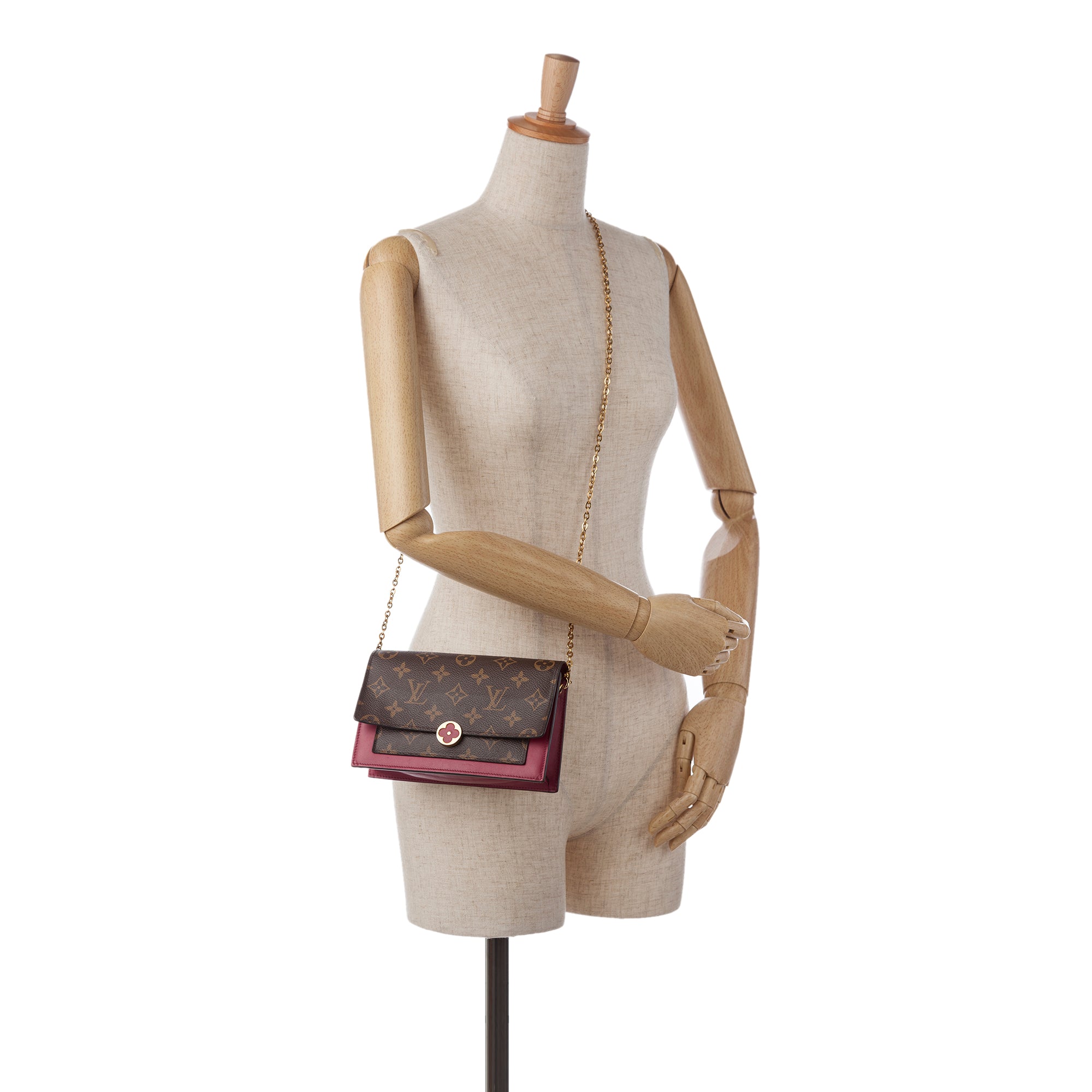 Product Details: Brown Louis Vuitton Monogram Flore Wallet On Chain Crossbody Bag. The Flore crossbody bag features a coated canvas body, a chain shoulder strap, a front snap closure, and interior zip and slip pockets. 4.7" L x 7.7" W x 1.6" D. Serial number SP3189.