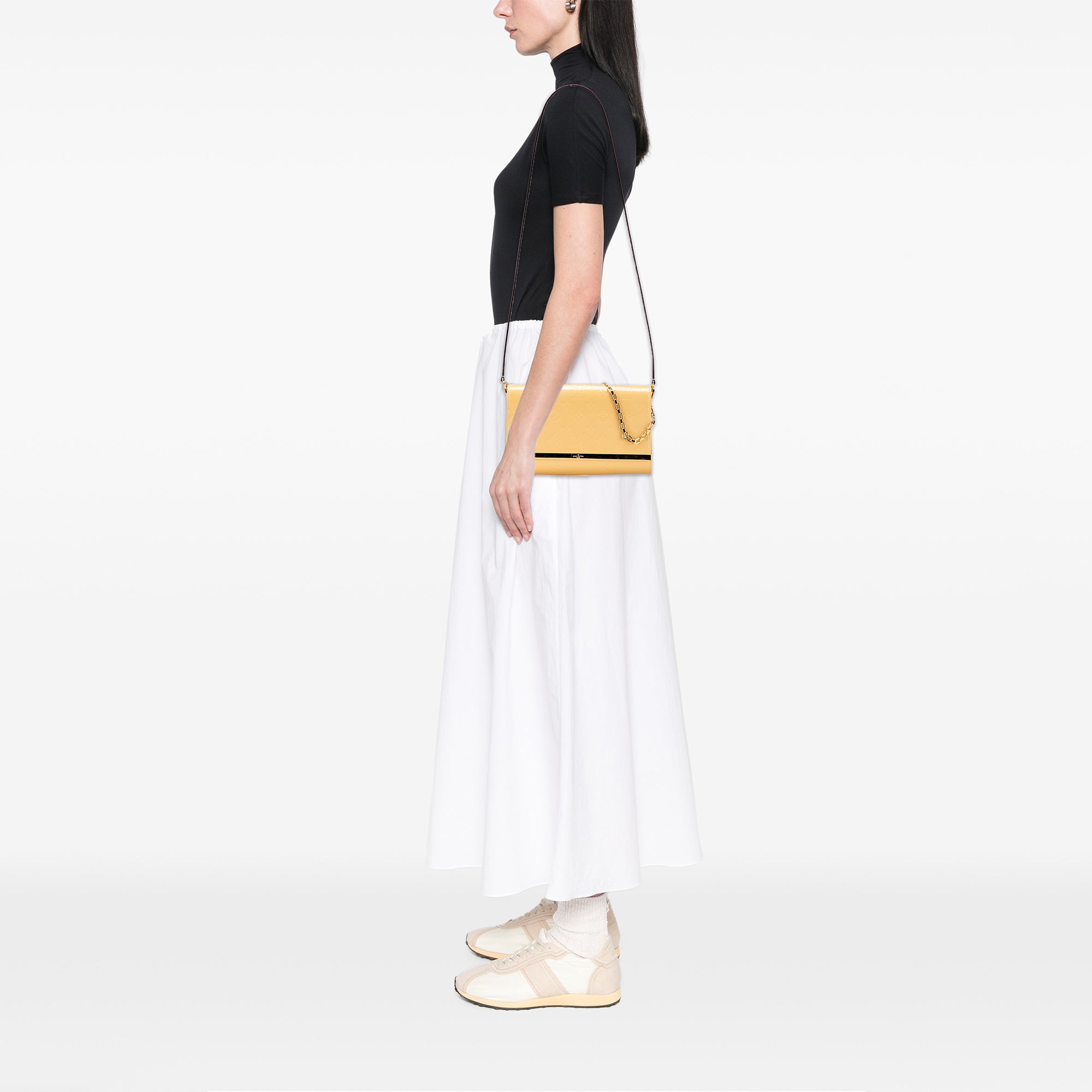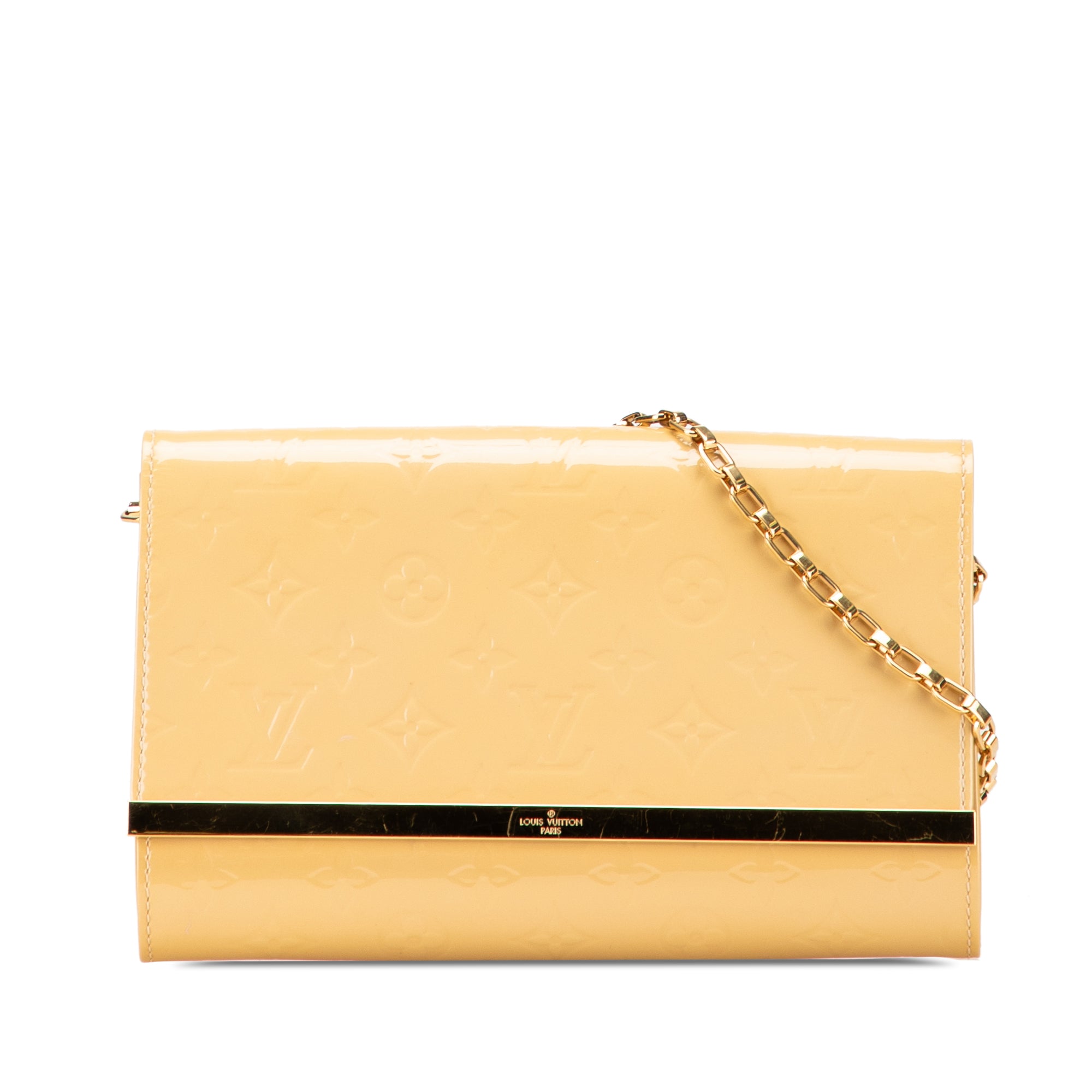 Product Details: Yellow Louis Vuitton Monogram Vernis Ana Satchel. The Ana features a monogram vernis leather body, a chain link strap, a detachable flat leather strap, a front flap with magnetic snap closure, an interior zip compartment, and interior card slots. 5.5" L x 9.4" W x 1.6" D, 9.4" drop. Serial number TR0145.