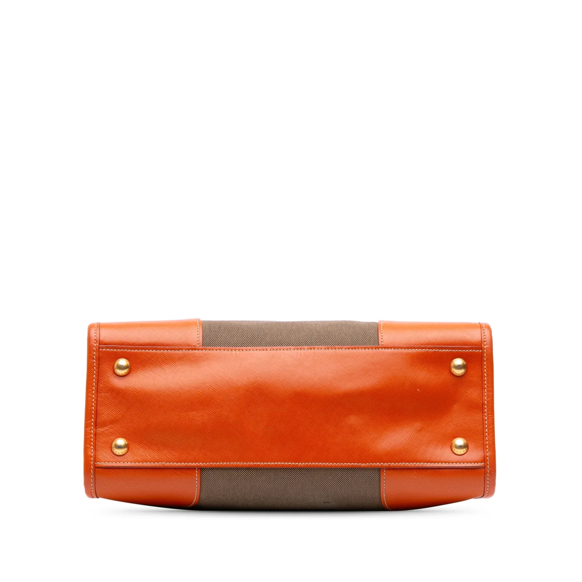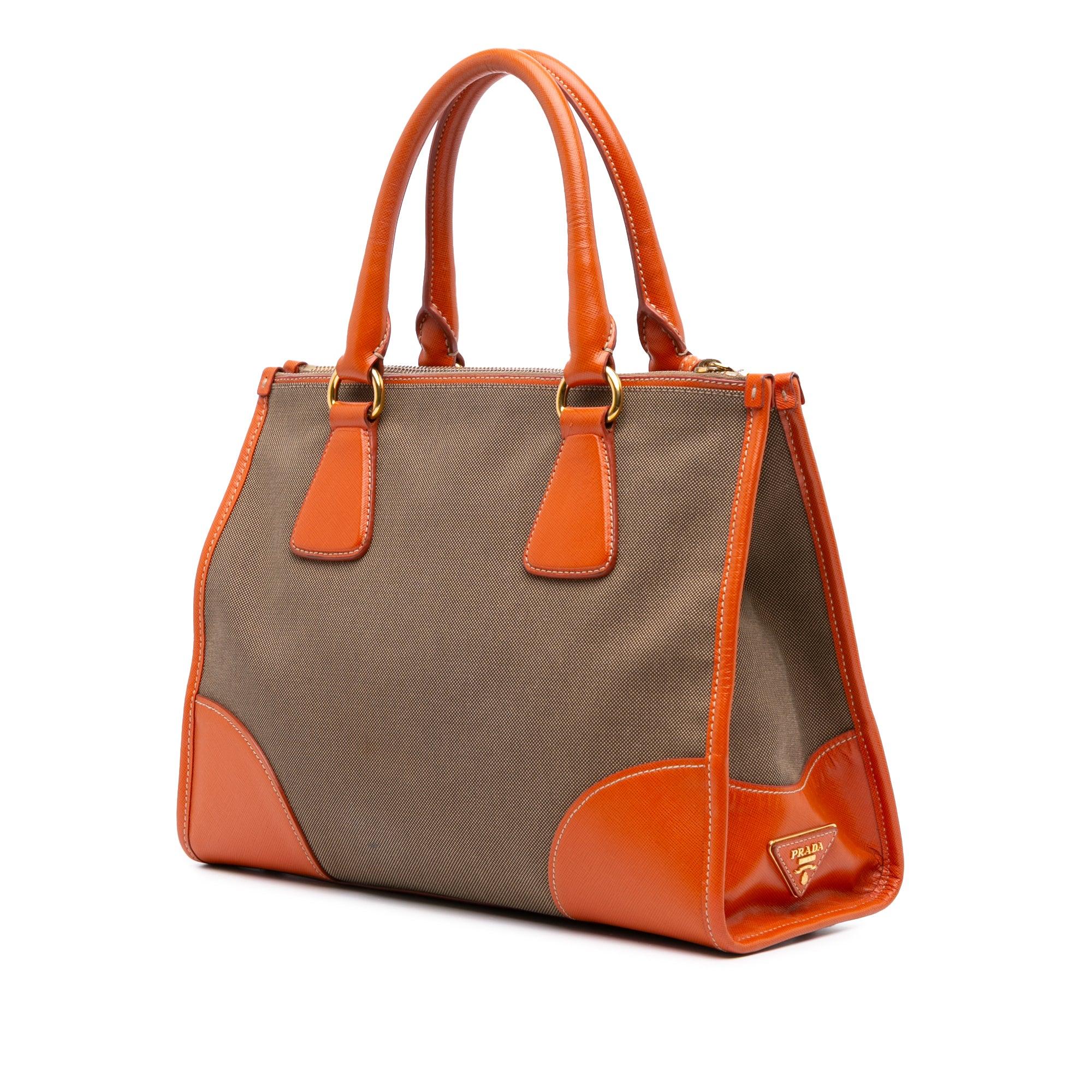 Brown Prada Saffiano Trimmed Canvas Canapa Logo Double Zip Satchel - Designer Revival Brown Prada Saffiano Trimmed Canvas Canapa Logo Double Zip Satchel - Designer Revival