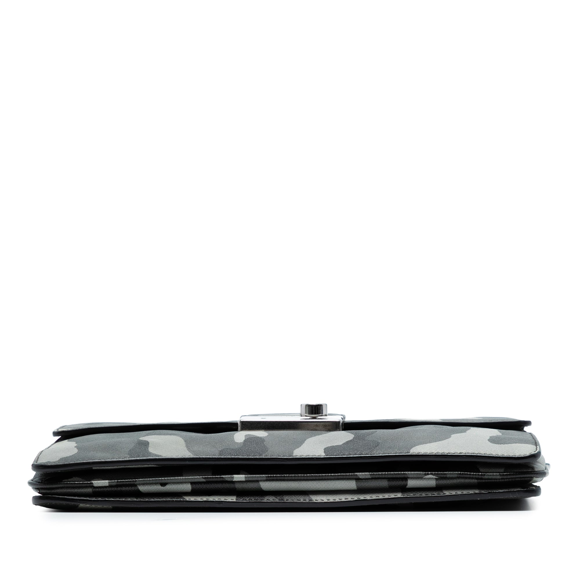 Product Details: Gray Prada Saffiano Camouflage Sound Lock Shoulder Bag. This shoulder bag features a printed saffiano leather body, a detachable flat leather shoulder strap, a front flap with magnetic snap closure, and an interior zip pocket. 7.1" L x 11" W x 1" D.