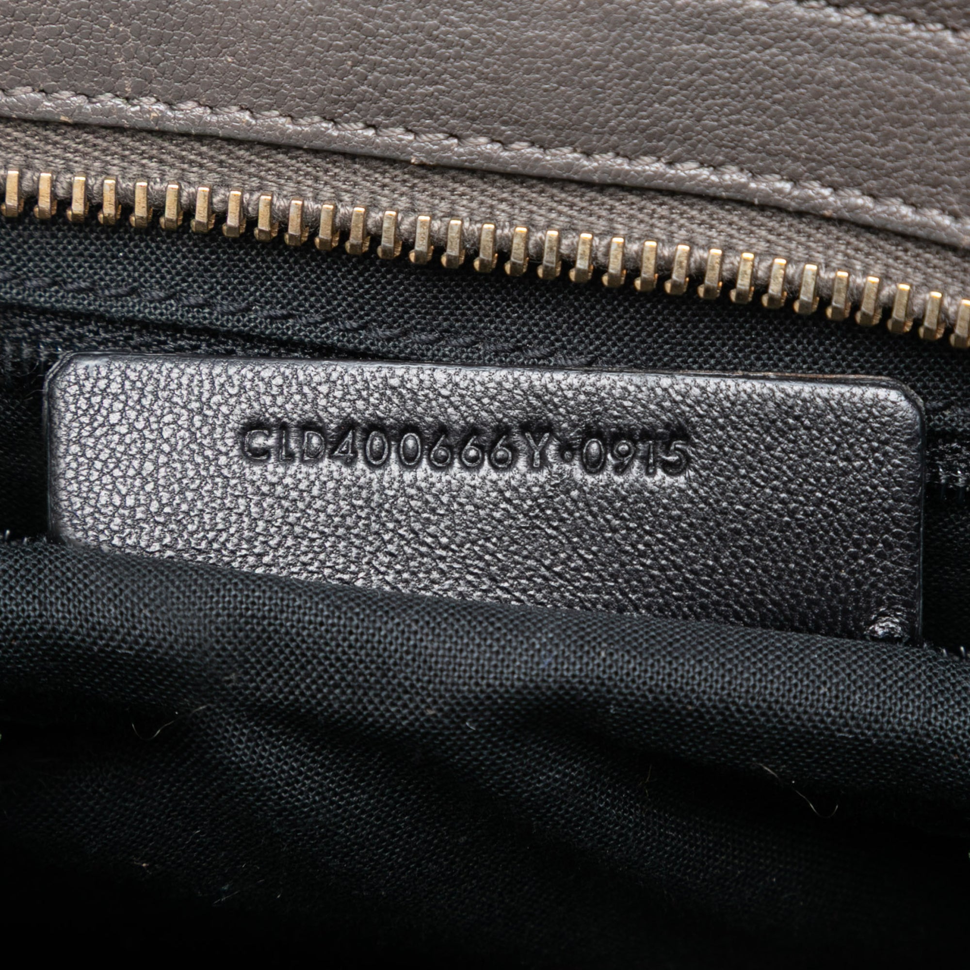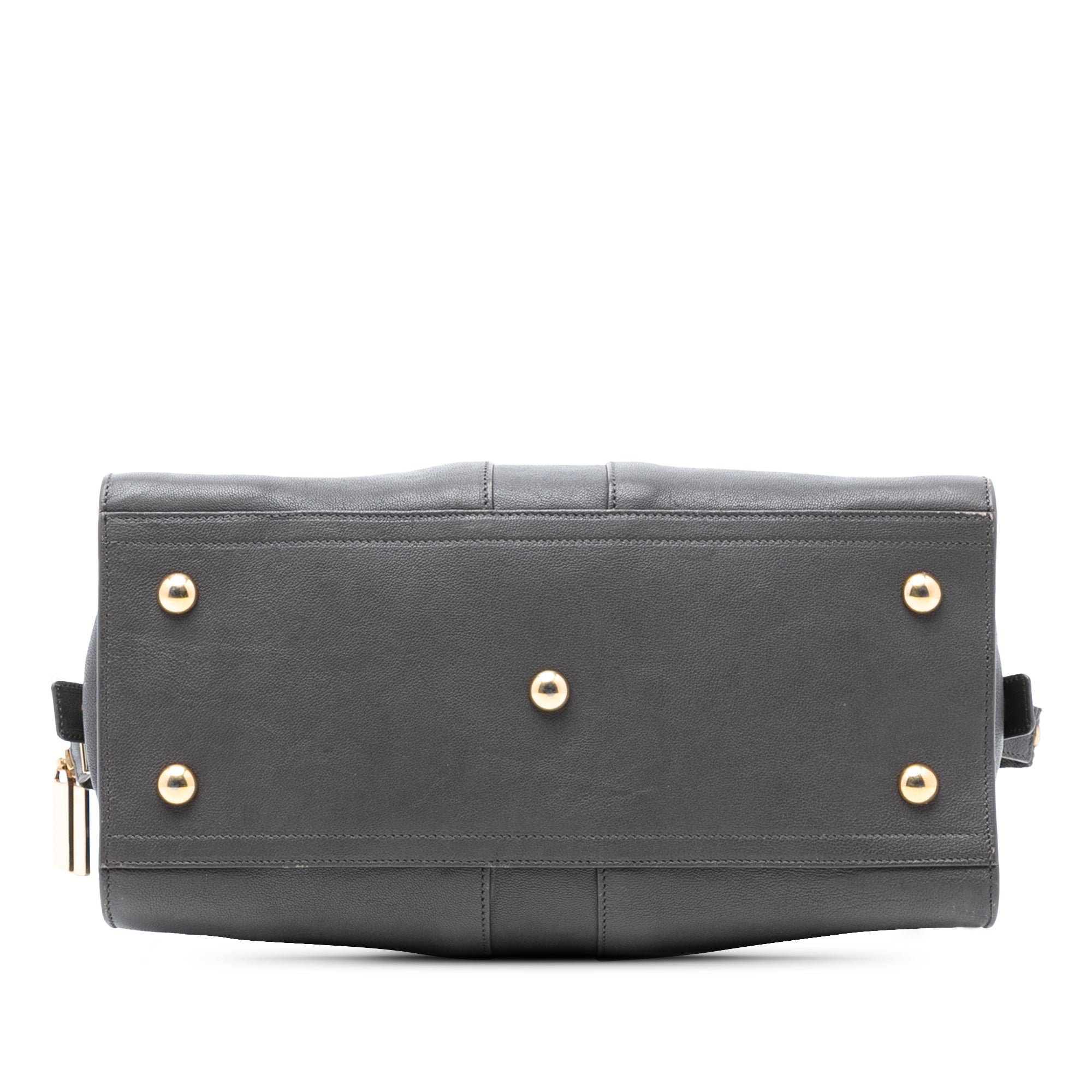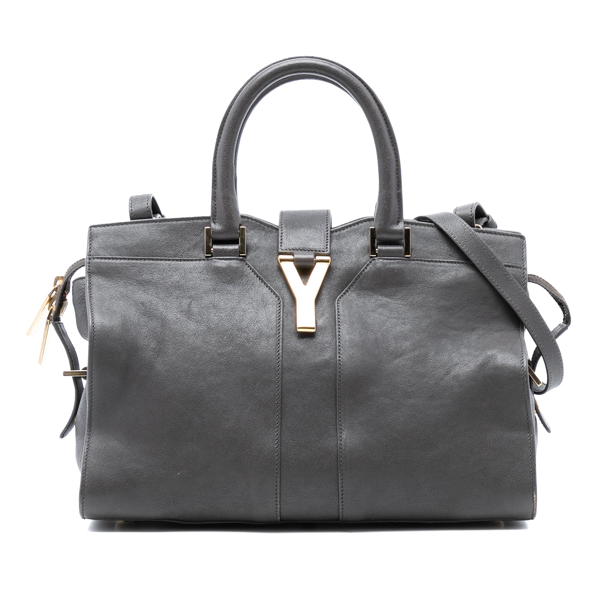 Product Details: Gray Saint Laurent Small Sheepskin Cabas Chyc Satchel. The Cabas Chyc satchel features a leather body, rolled leather handles, a detachable flat leather strap, a top strap with magnetic snap closure, a top zip closure, and an interior zip pocket. 8.9" L x 11.8" W x 5.9" D, 4.3" drop. Serial number CLD400666Y·0915.