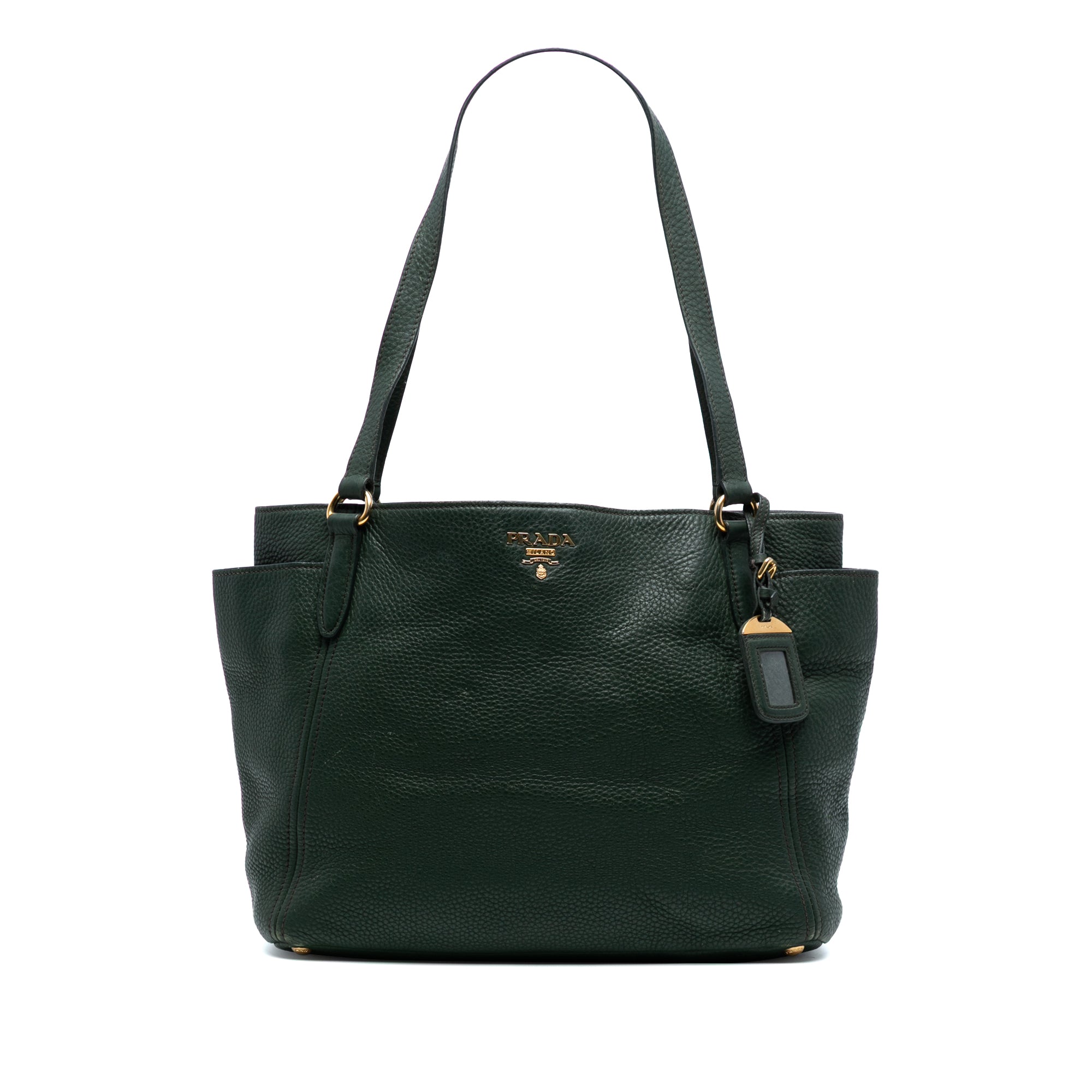 Product Details: Green Prada Vitello Daino Double Pocket Tote. This tote bag features a leather body, flat leather straps, an open top with magnetic closure, exterior side slip pockets, and interior zip and slip pockets. 11" L x 13.4" W x 5.5" D.