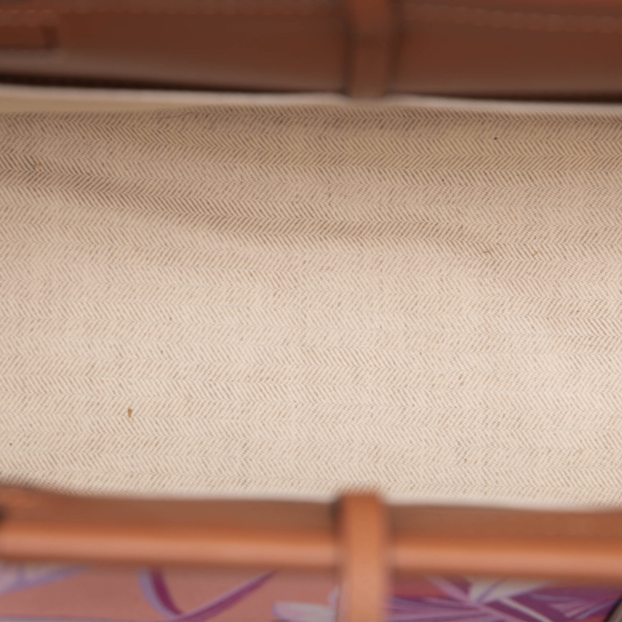 Product Details: Pink LOEWE Paulas Ibiza Small Canvas Waterlily Print Cushion Tote. The Cushion tote bag features a printed canvas body with leather top panel, flat leather straps, an open top with leather tie closure, and an interior slip pocket. 9.1" L x 12.4" W x 6.1" D, 9.8" drop. Serial number 702007.