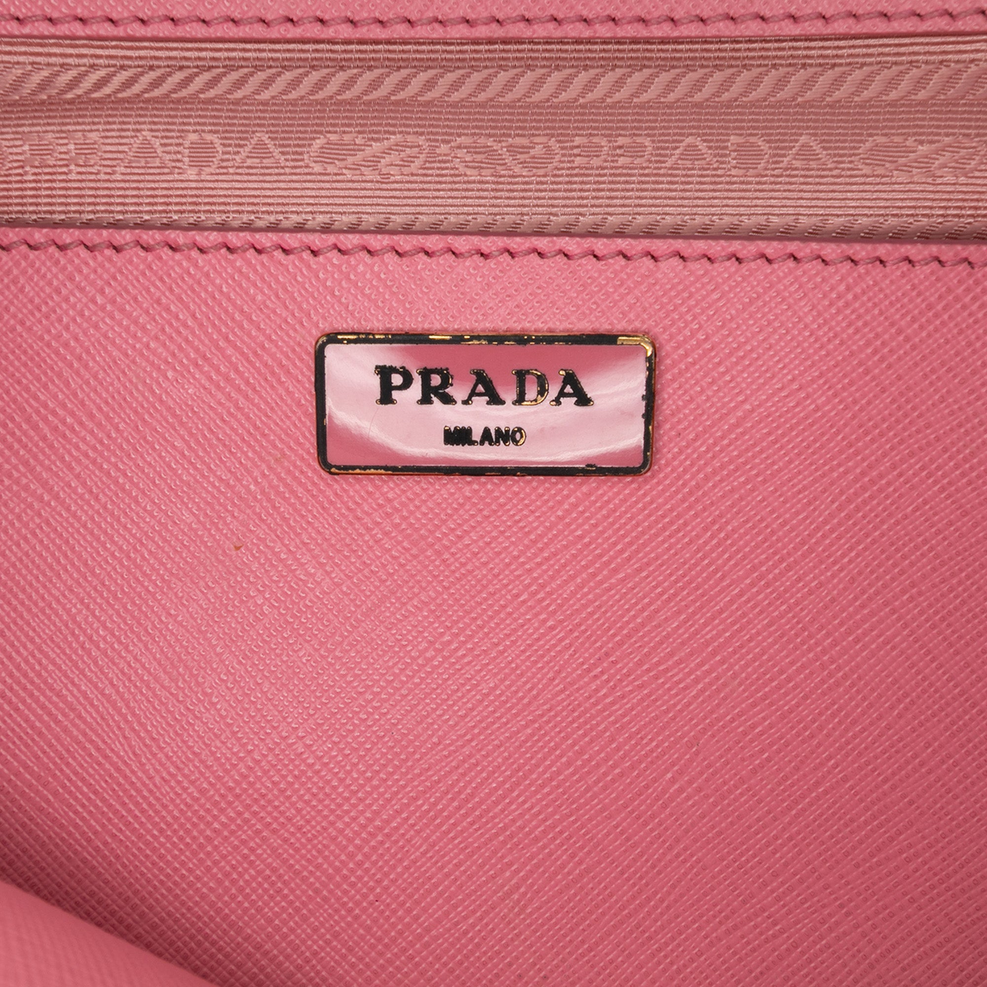 Product Details: Pink Prada Medium Saffiano Lux Galleria Double Zip Satchel. The Galleria features a saffiano leather body, rolled leather handles, a detachable flat strap, an open top, dual zip compartments, and interior zip and slip pockets. Corners has been repainted. 9.4" L x 13.4" W x 5.7" D, 5.1" drop.