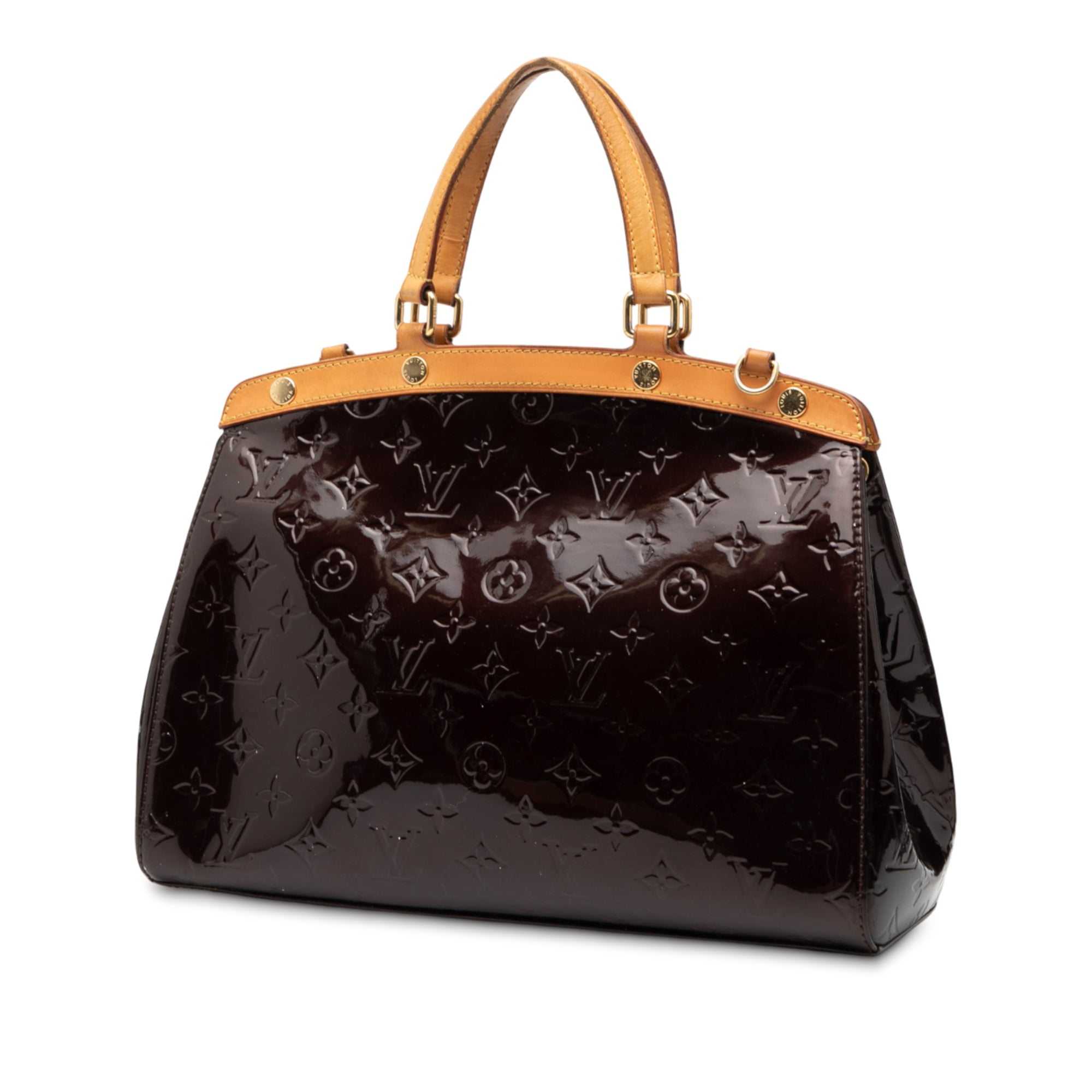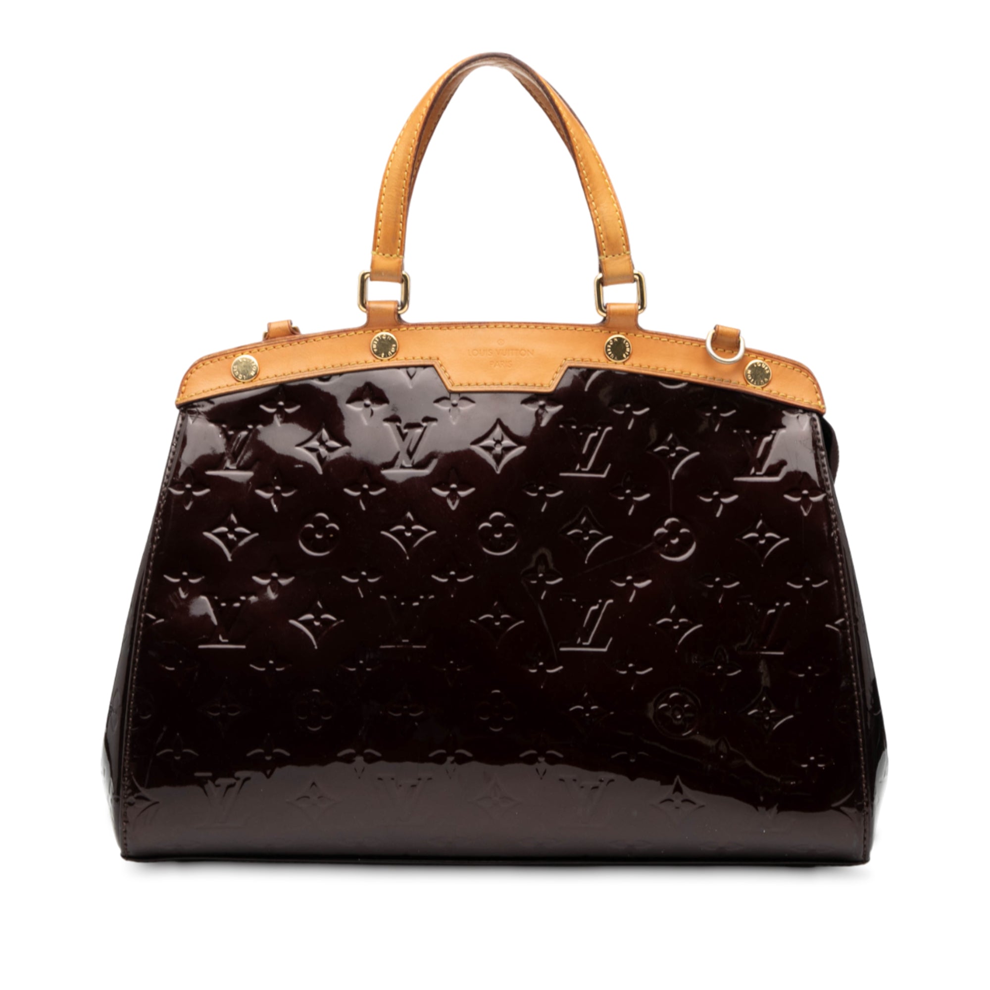 Product Details: Purple Louis Vuitton Monogram Vernis Brea MM Satchel. The Brea MM features a monogram vernis leather body with vachetta leather trim, flat vachetta leather handles, a top zip closure, and interior zip and slip pockets. 9.8" L x 13" W x 4.7" D, 4.7" drop. Serial number AA4134.