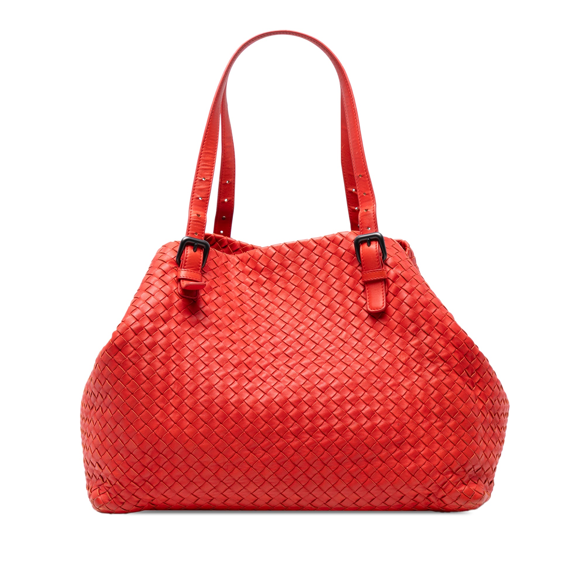 Product Details: Red Bottega Veneta Large Nappa Intrecciato Cesta Tote. The Cesta tote bag features a woven leather body, adjustable flat leather straps, an open top with a lobster clasp closure, and interior zip and slip pockets. 11.8" L x 15" W x 9.1" D. Serial number B00063135J.