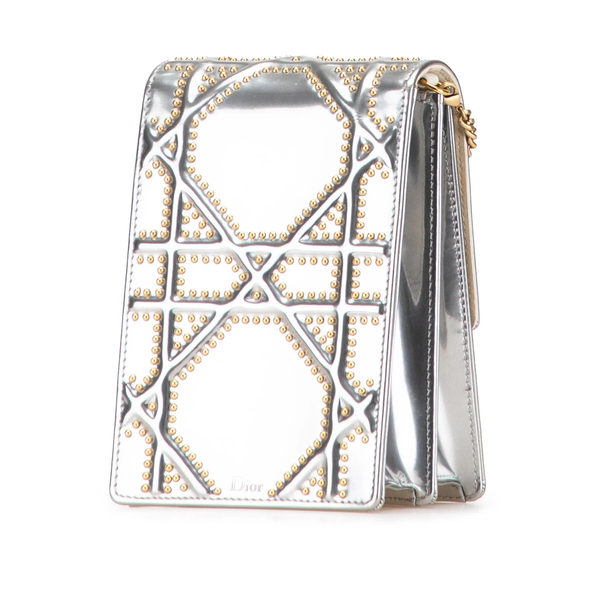 Product Details: Silver Dior Metallic Studded Calfskin Vertical Diorama Crossbody Bag. The Diorama features a studded leather body, a chain link strap with leather guard, a front flap with a metal push lock closure, and an interior slip pocket. 6.5" L x 4.3" W x 3.5" D. Serial number 08-BO-0178.