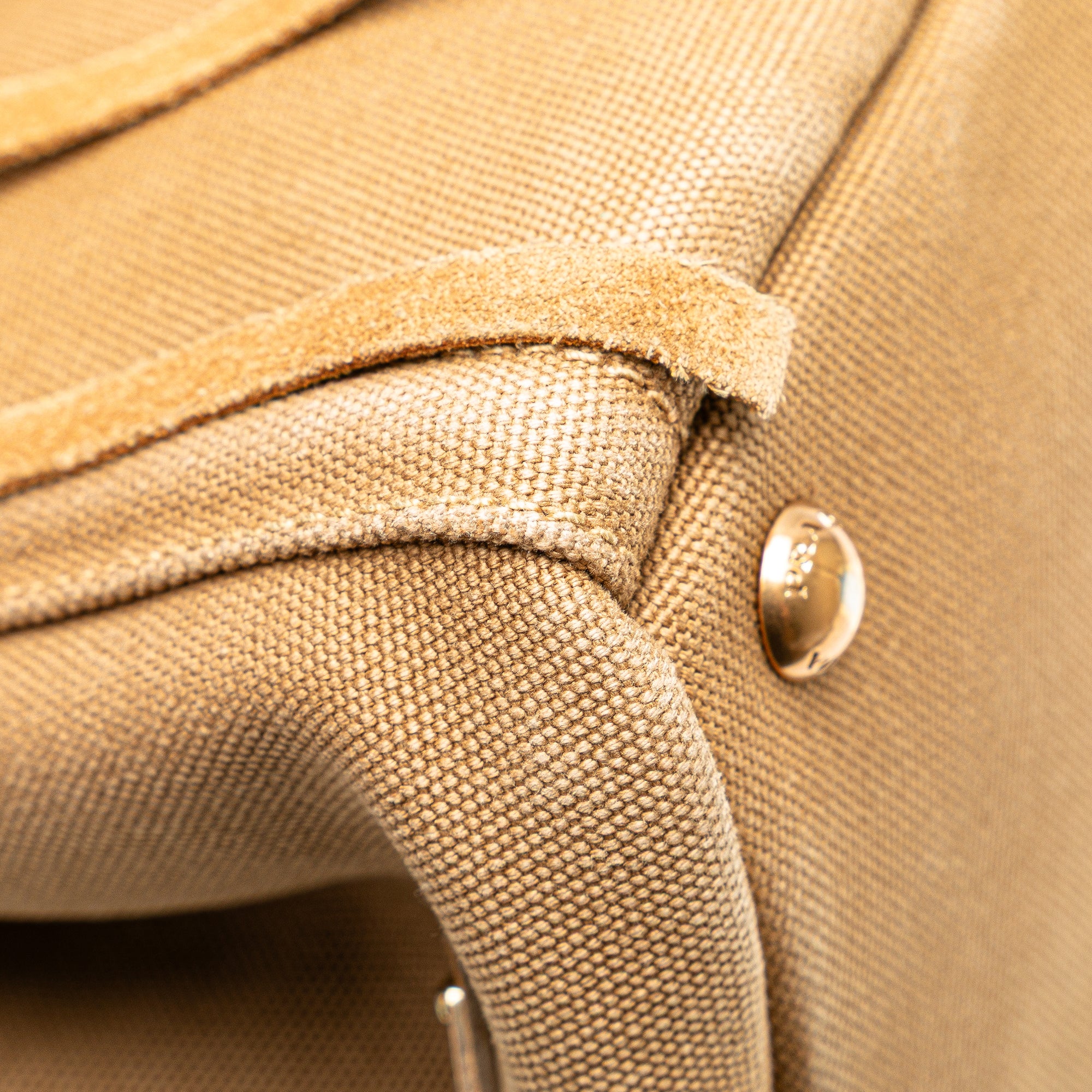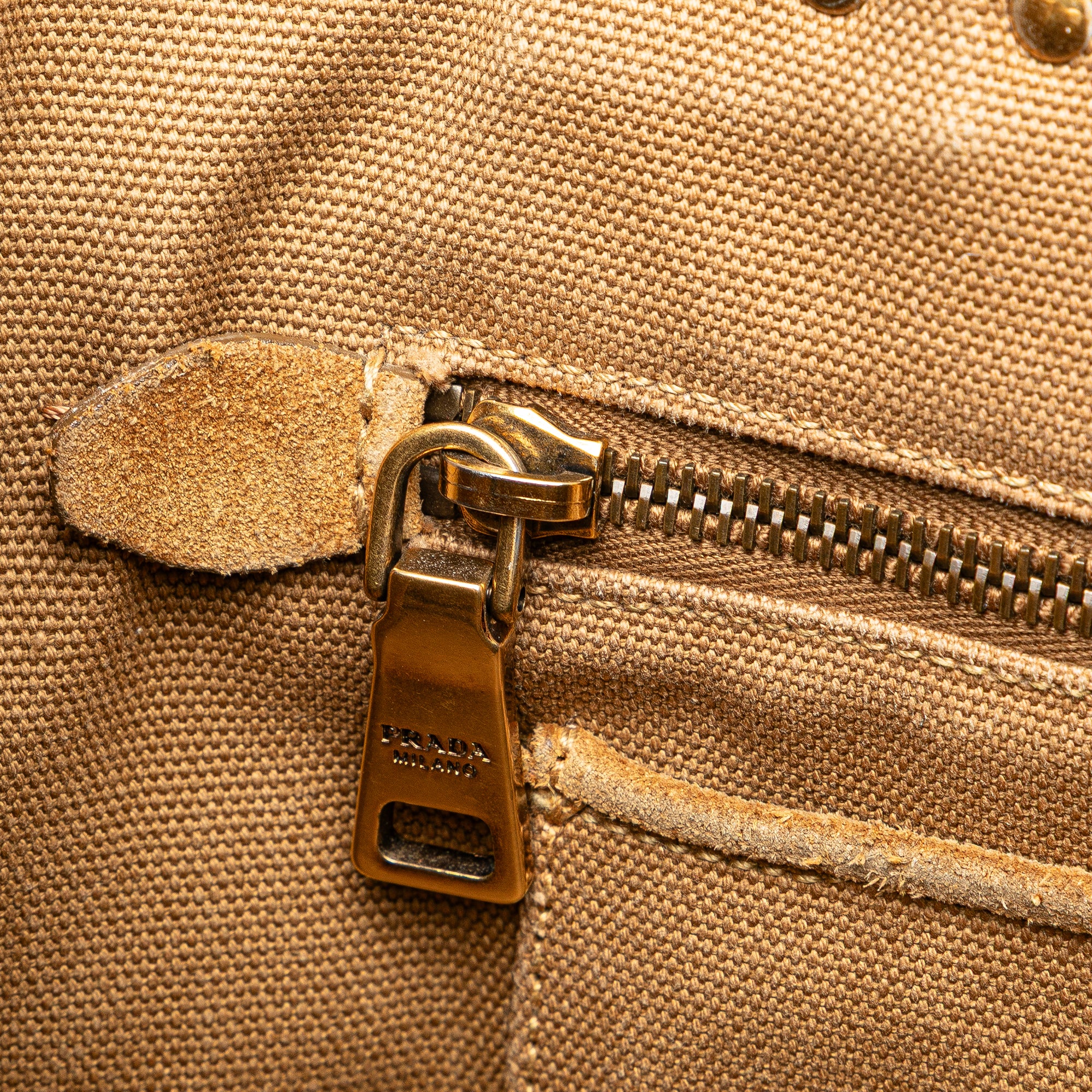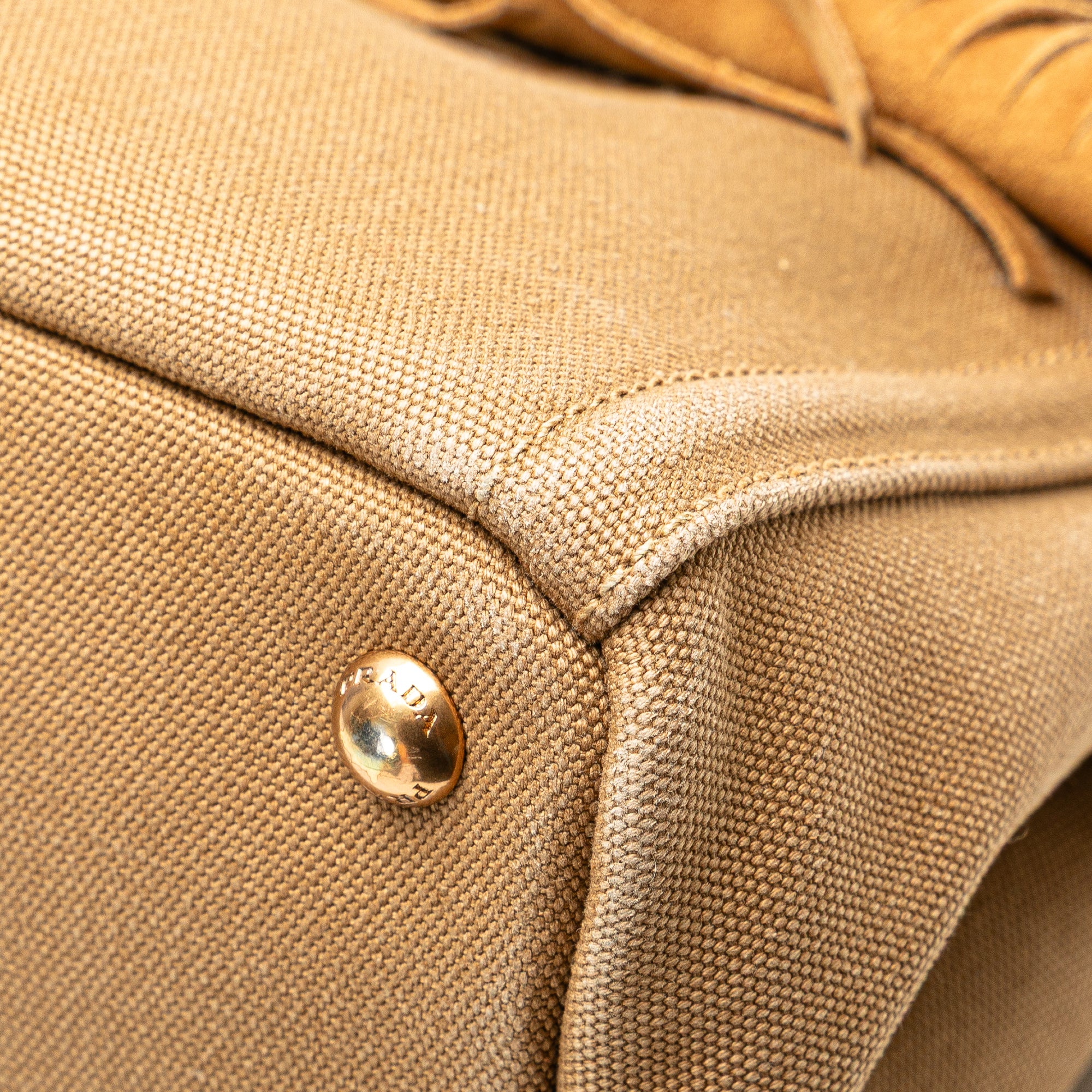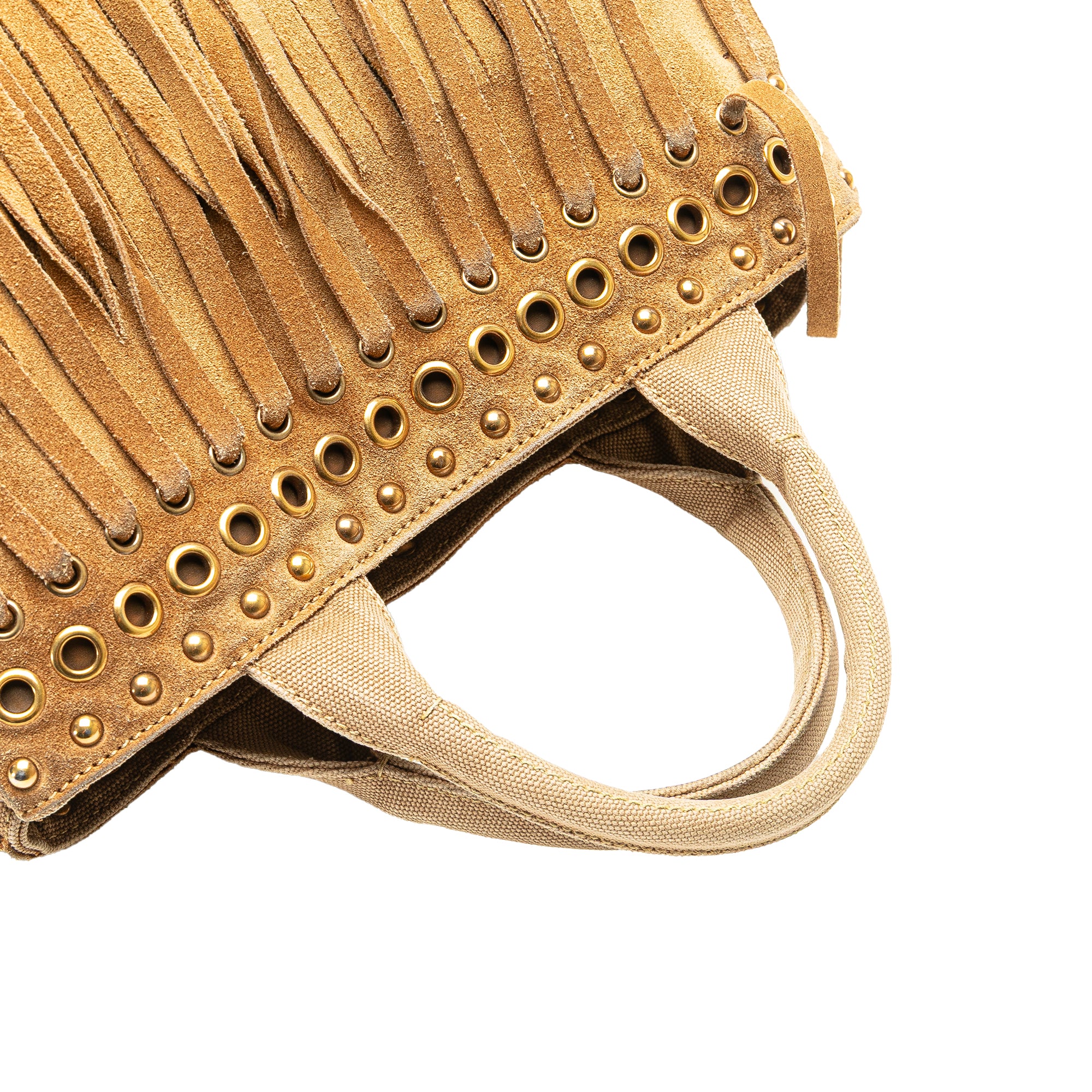 Product Details: Tan Prada Canvas and Suede Fringed Canapa Handbag. This handbag features a canvas body with suede fringes, grommet details, rolled handles, an open top, and interior zip and slip pockets. 7.5" L x 10.2" W x 5.9" D, 3.9" drop.