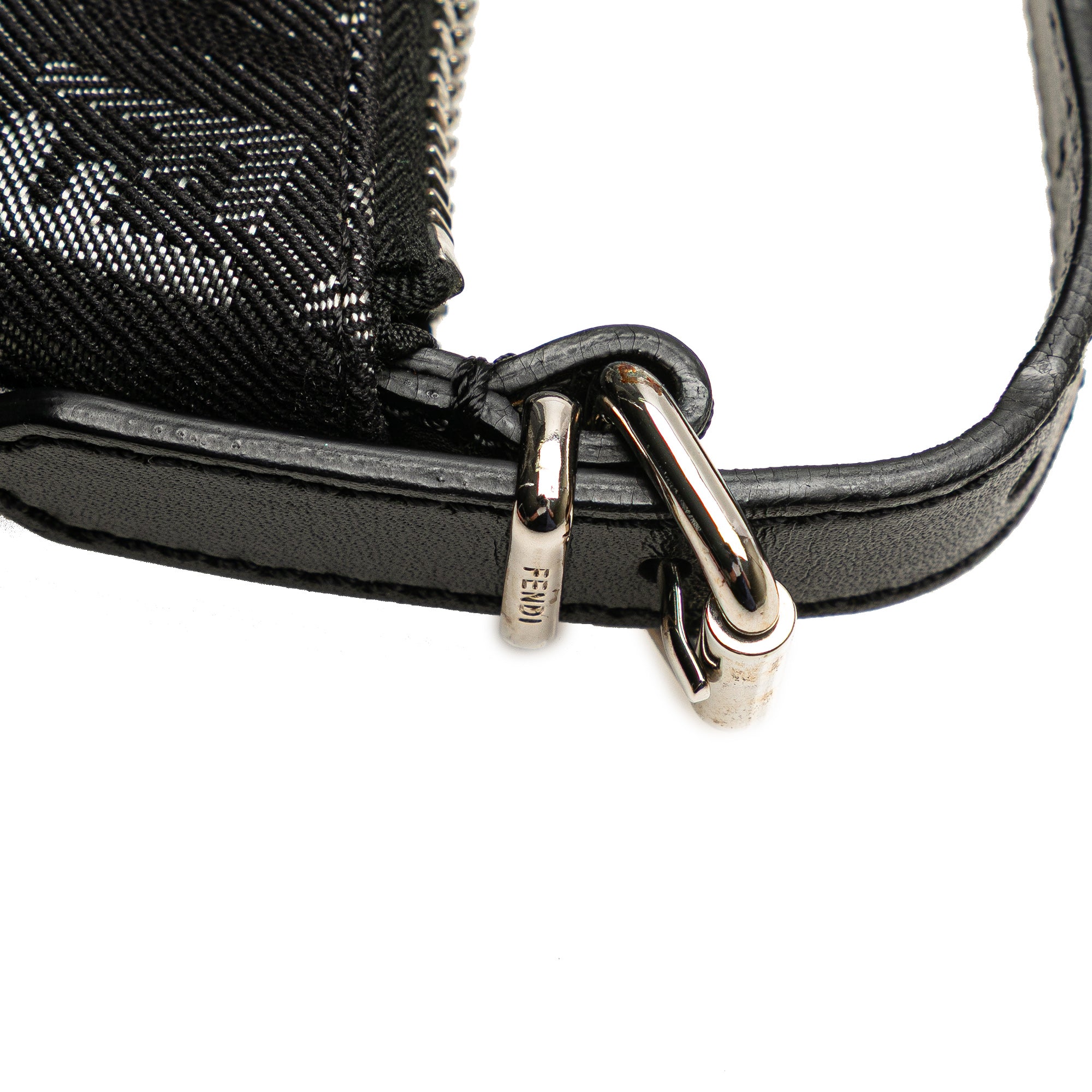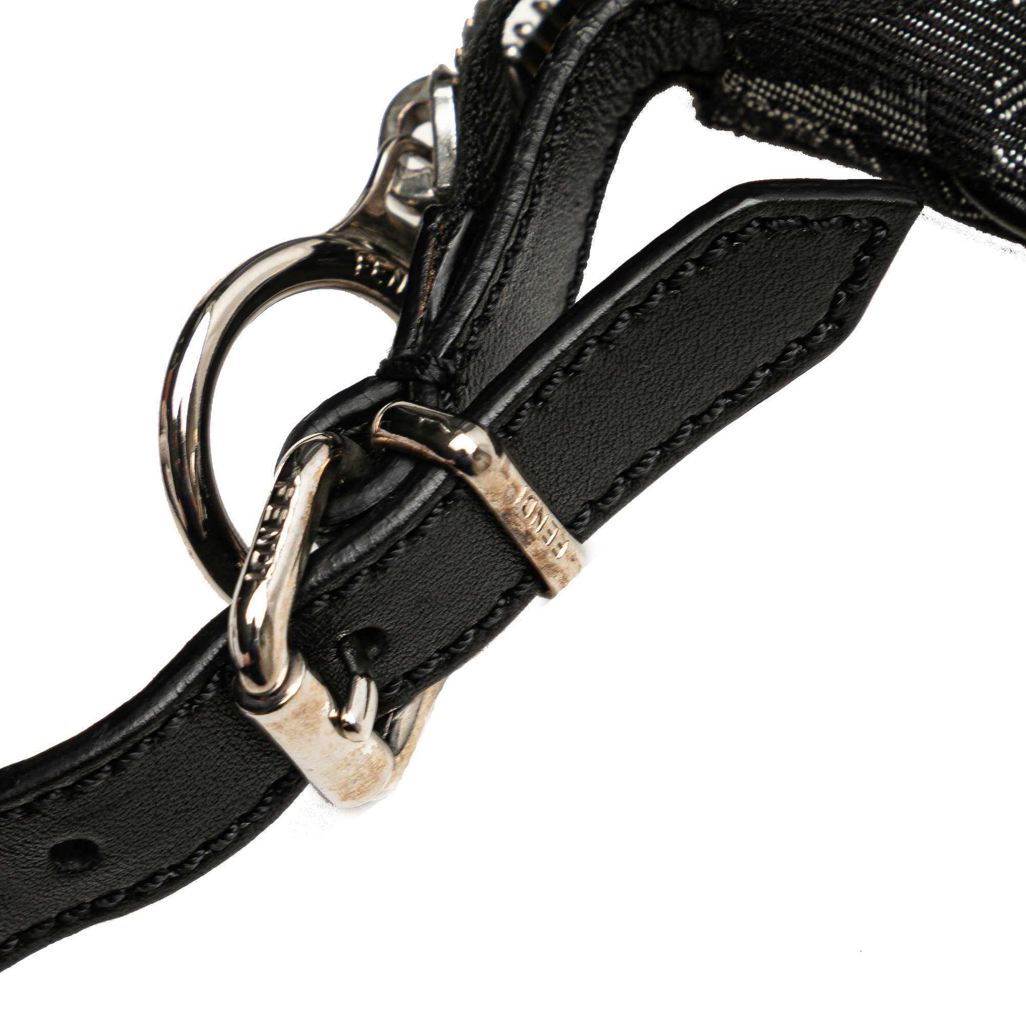 Product Details: Black Fendi Zucchino Denim Oyster Shoulder Bag. The Oyster bag features a denim body, flat leather strap, top zip closure, and interior slip pocket. 7.1" L x 9.4" W x 0.4" D, 9.1" drop. Serial number 2111 8BR248 JQX 039.