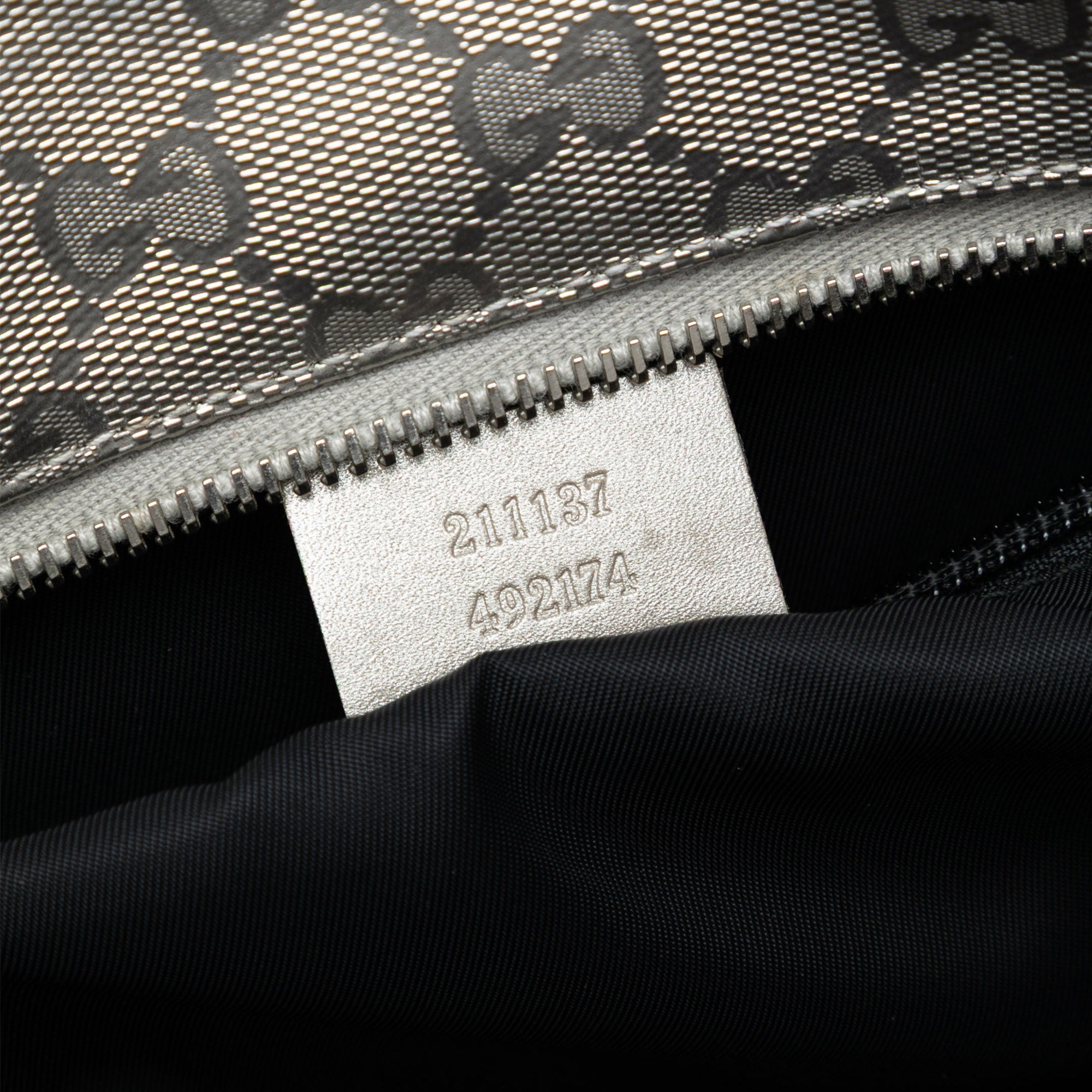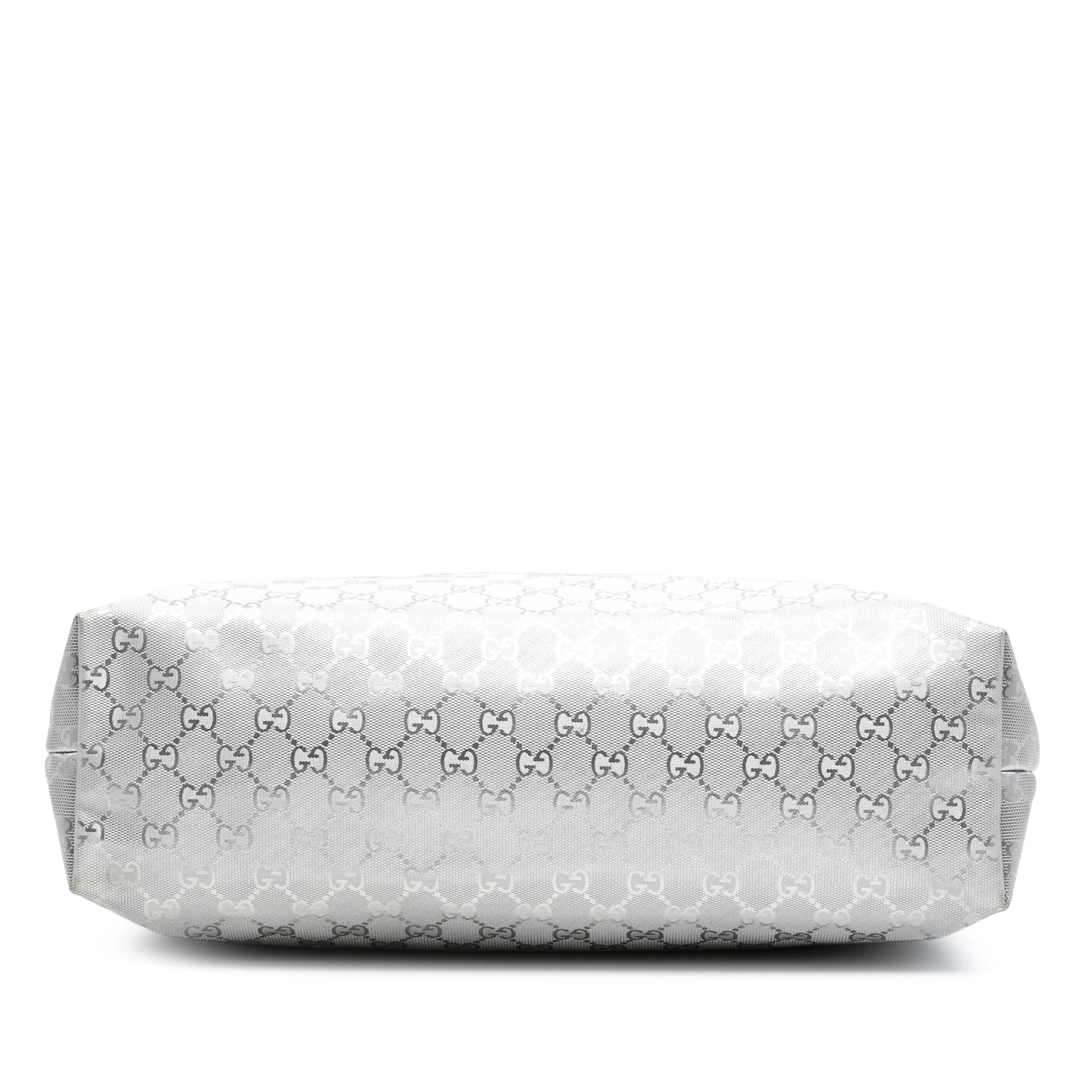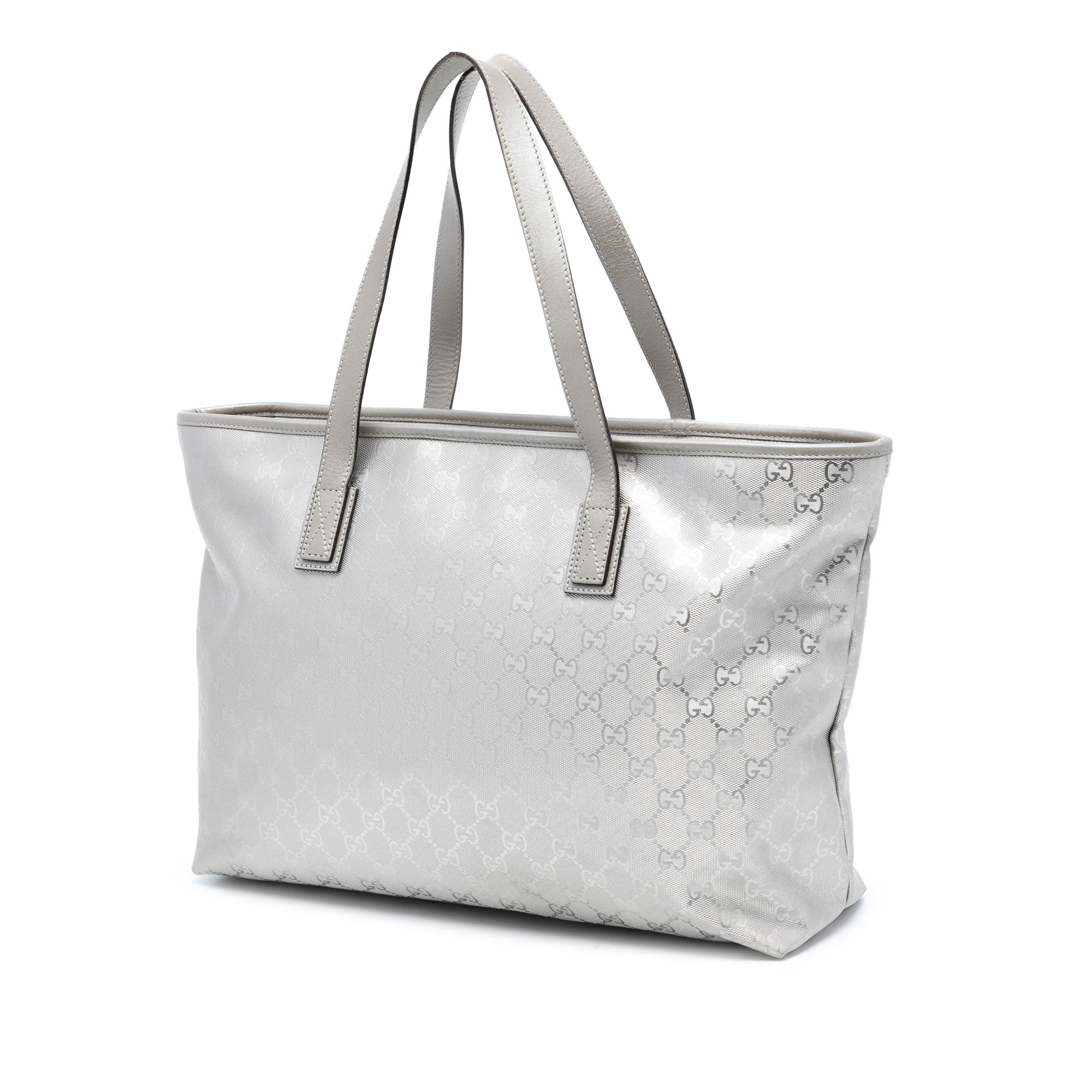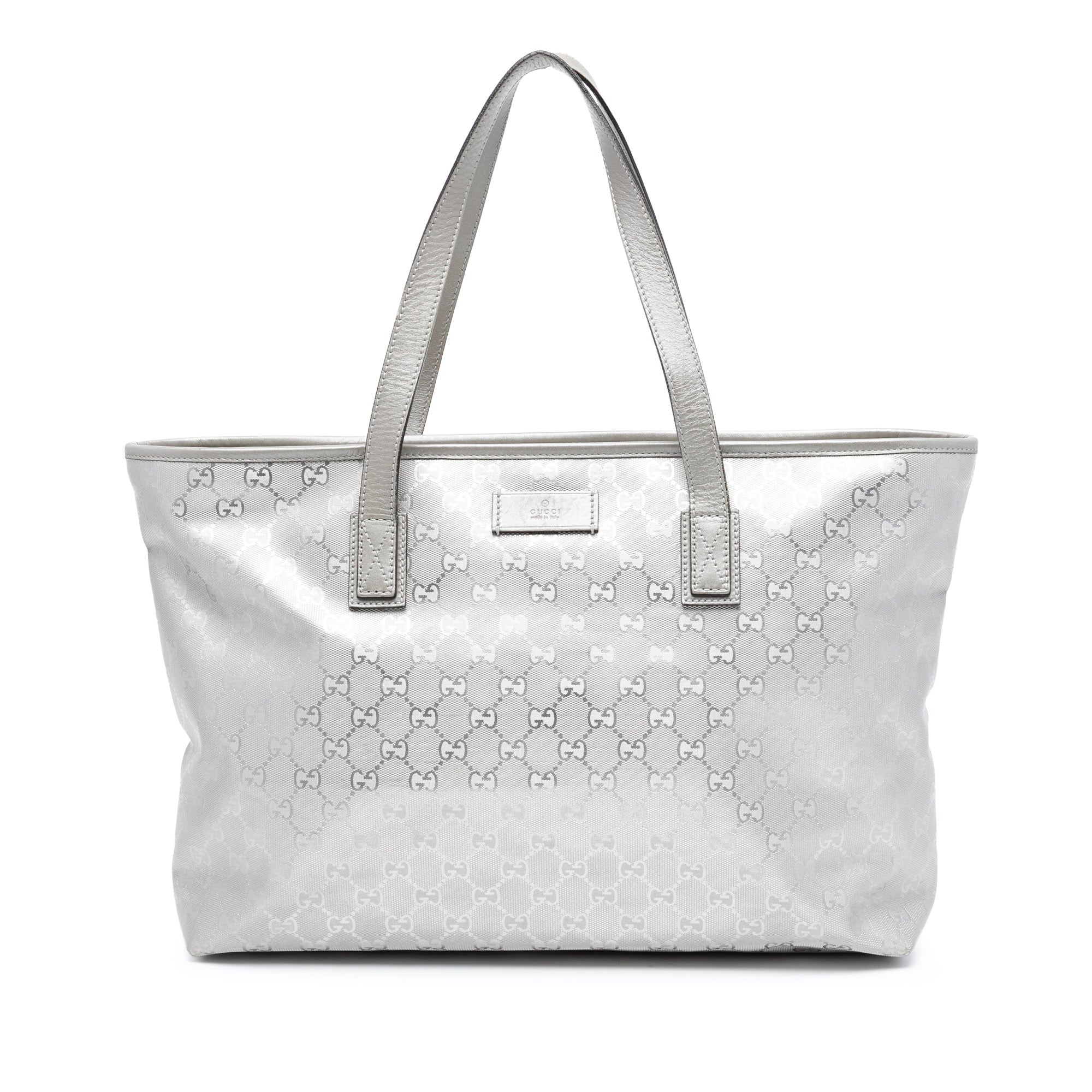 Product Details: Silver Gucci Medium GG Imprime Tote. This tote bag features a coated canvas body, flat leather straps, a top zip closure, and interior slip and zip pockets. 11" L x 14.8" W x 4.3" D. Serial number 211137 492174.