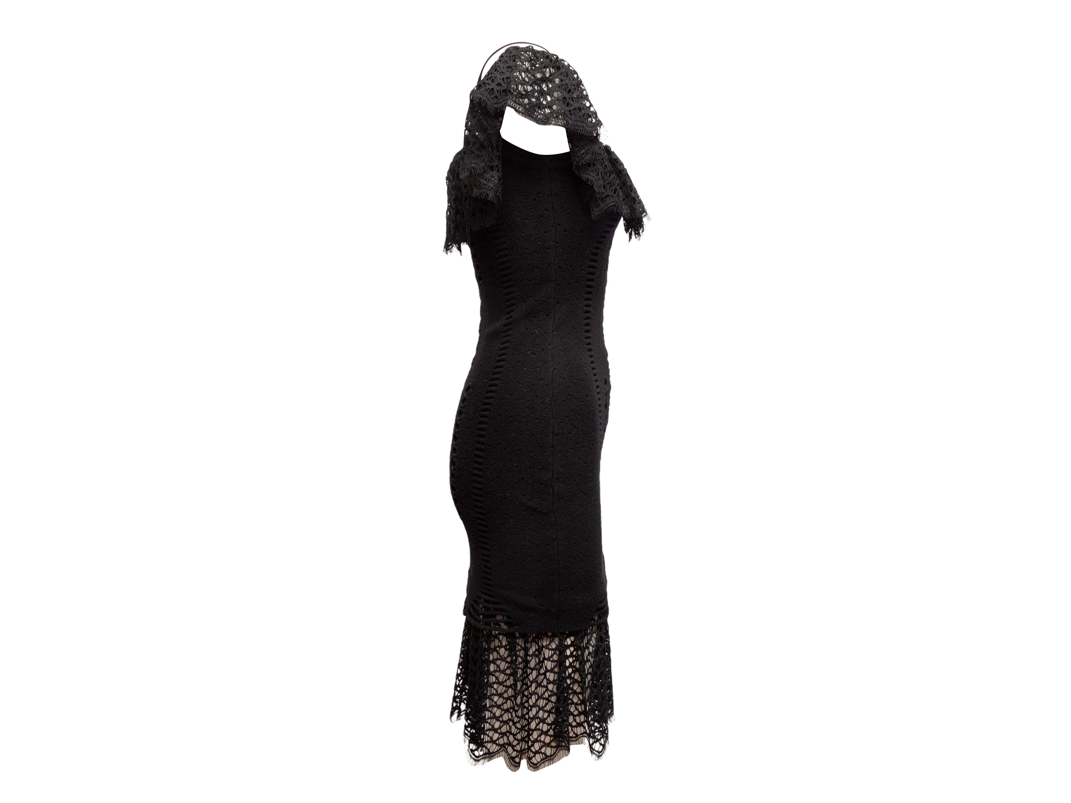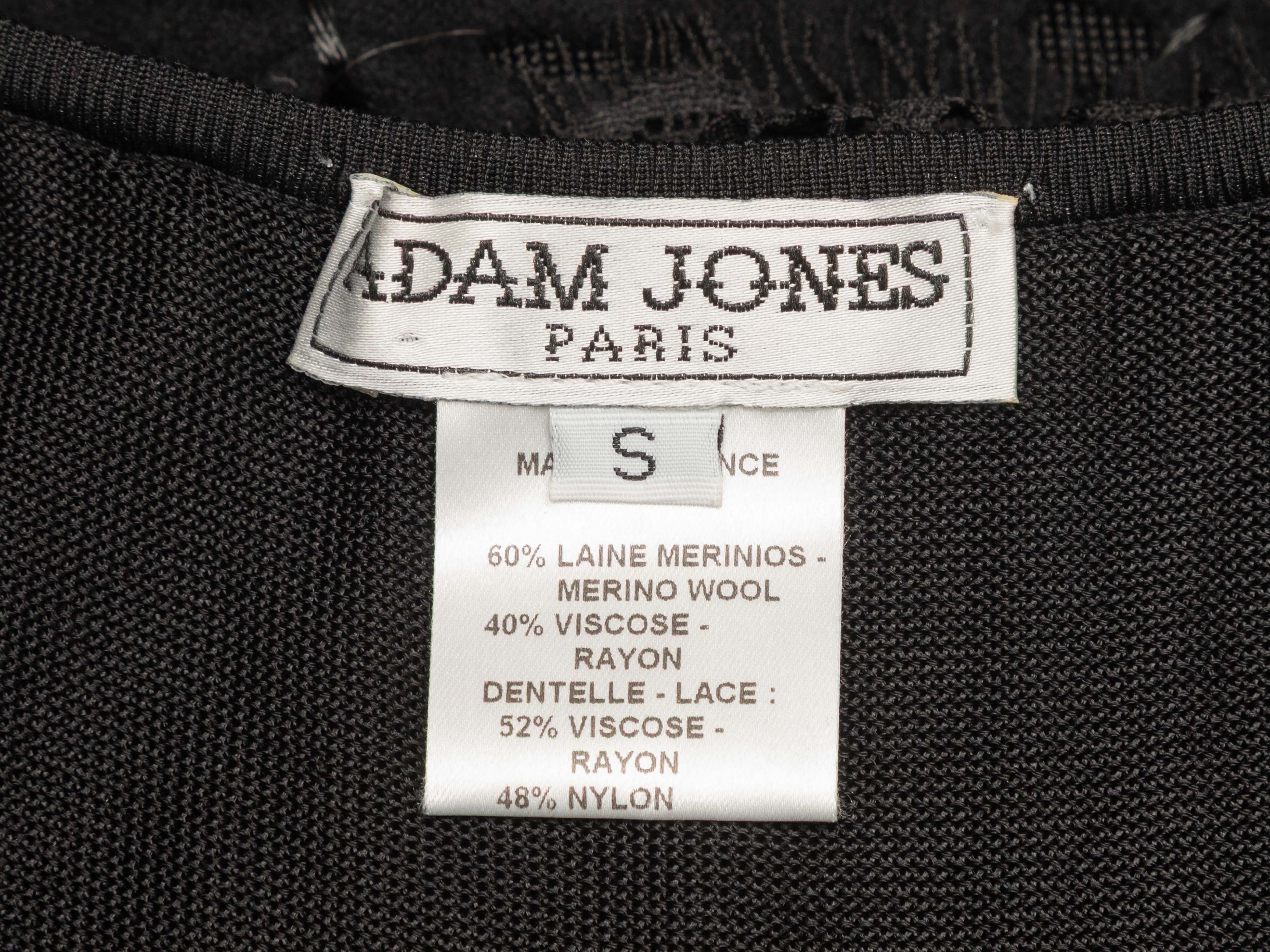 Product Details: Black merino wool-blend knit bodycon dress by Adam Jones. Round ruffle-trimmed neckline. 27.5" bust, 26" waist, 32.5" length, 18" shoulder width.