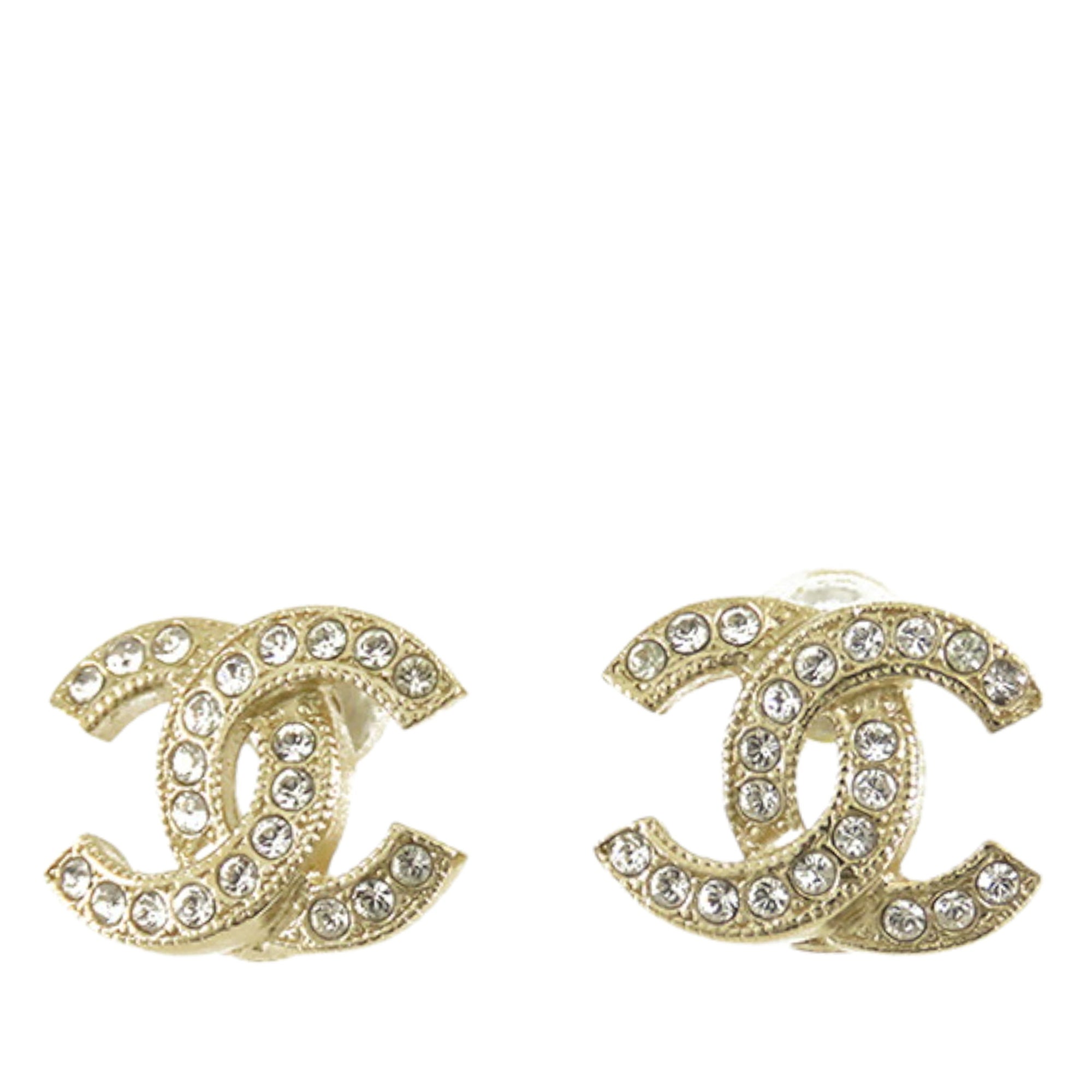 Product Details: Gold Chanel Gold Plated CC Crystal Push Back Earrings. These earrings feature a gold-plated body with crystal details, and a push-back closure. 0.4" L x 0.5" W x 0" D. Serial number F19V.