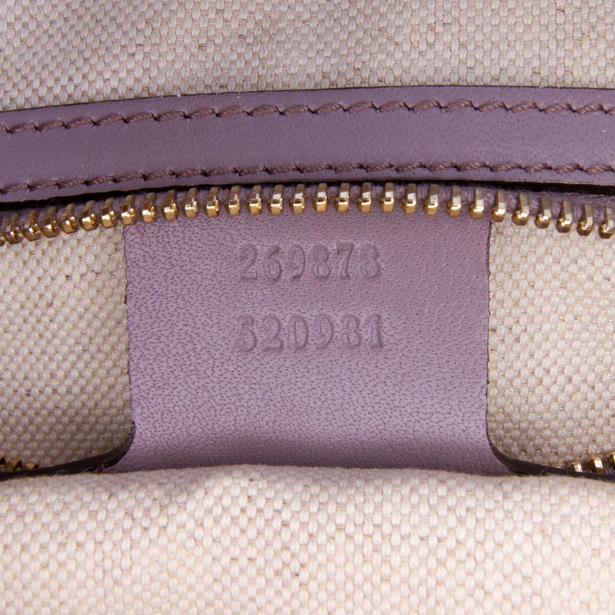 Product Details: Purple Gucci Guccissima Craft Tote. The Craft tote bag features a leather body, flat leather handles, an open top with a lobster claw clasp closure, and interior zip and slip pockets. 7.7" L x 10.4" W x 4.3" D, 7.1" drop. Serial number 269878 520981.