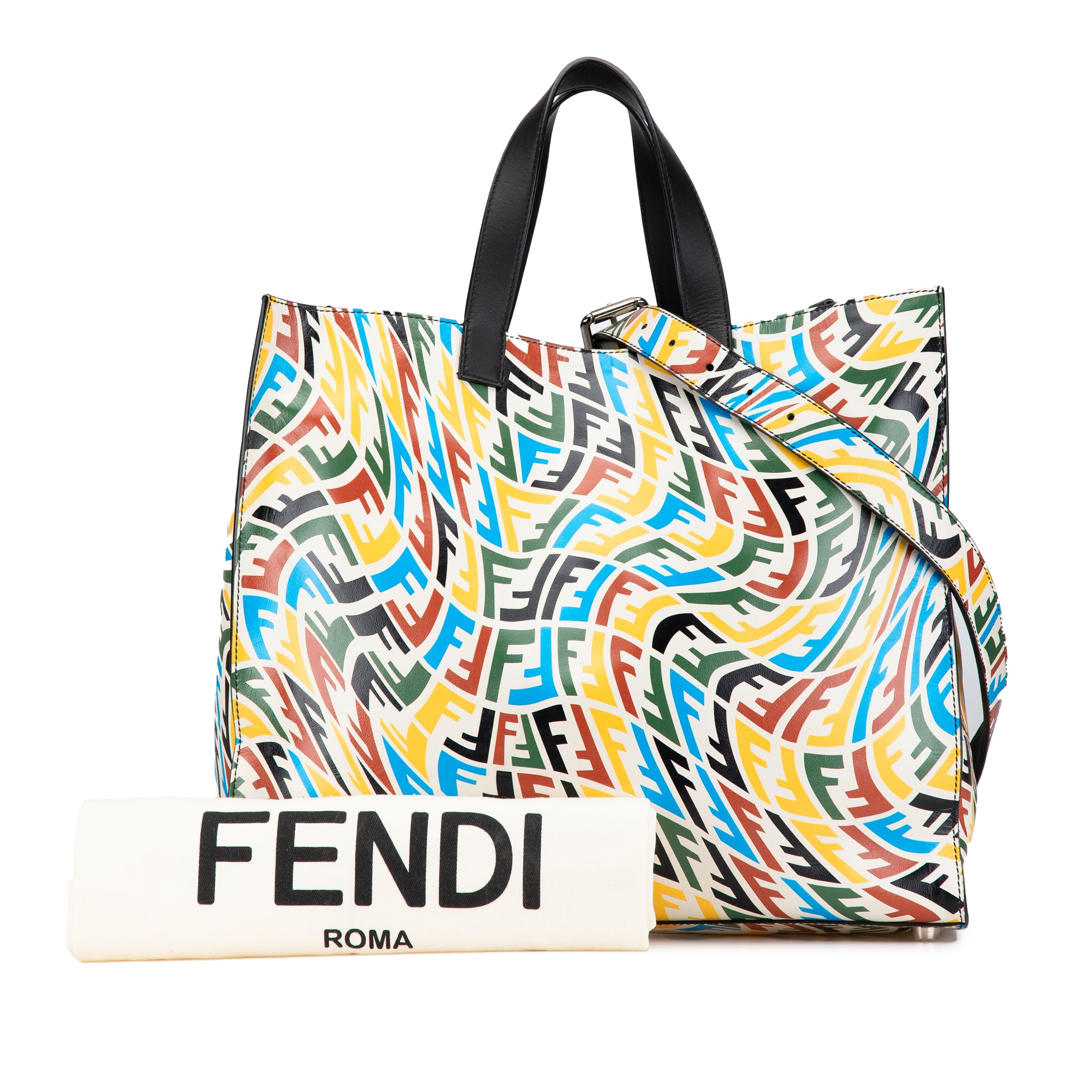 Product Details: White Fendi Sarah Coleman Leather Vertigo Shopper Tote Satchel. This satchel features a printed leather body, flat leather handles, an adjustable and detachable flat leather strap, an open top, and an interior zip pocket. 13.8" L x 15.7" W x 7.1" D, 6.3" drop. Serial number 7VA390 AFSU 218 8241.