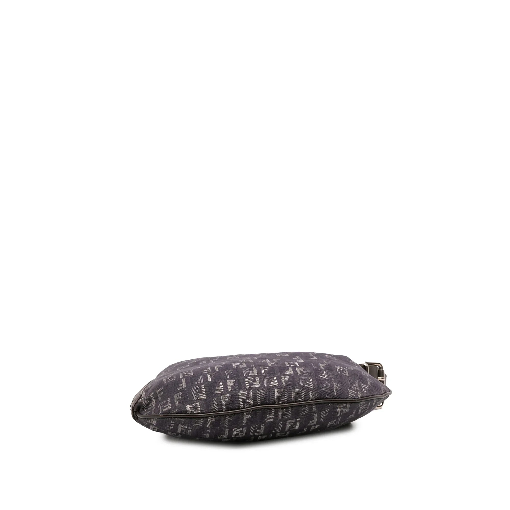 Product Details: Black Fendi Zucchino Denim Oyster Shoulder Bag. The Oyster bag features a denim body, a flat leather strap, a top zip closure, and an exterior size zip pocket. 9.3" L x 10.6" W x 0.6" D.
