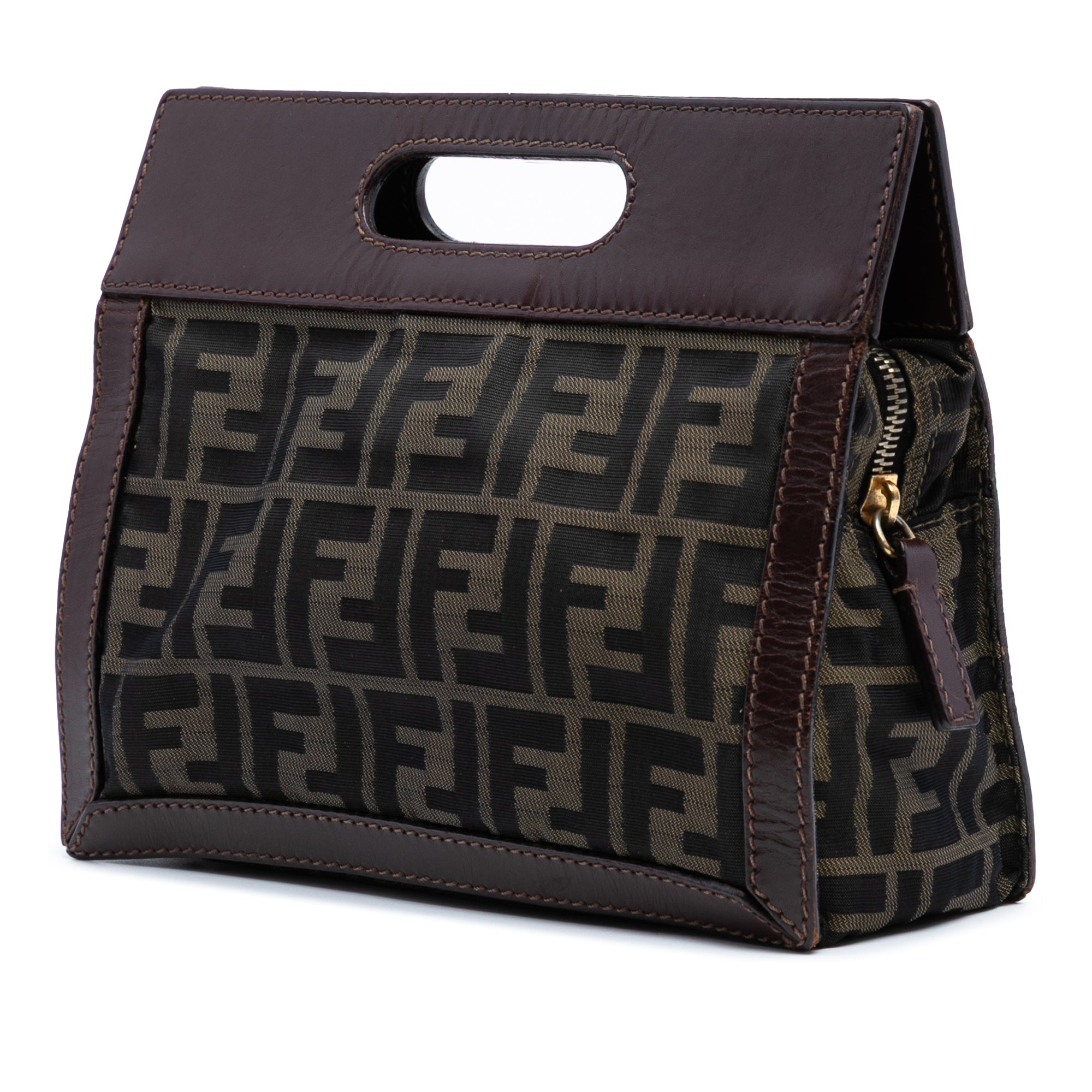 Product Details: Brown Fendi Mini Zucca Canvas Peekaboo Defender Handbag. The Peekaboo Defender features a canvas body with leather trim, cut-out handles, a top zip closure and interior pocket. 6.1" L x 9.4" W x 3.1" D, 0.8" drop. Serial number 2288-266000-89.