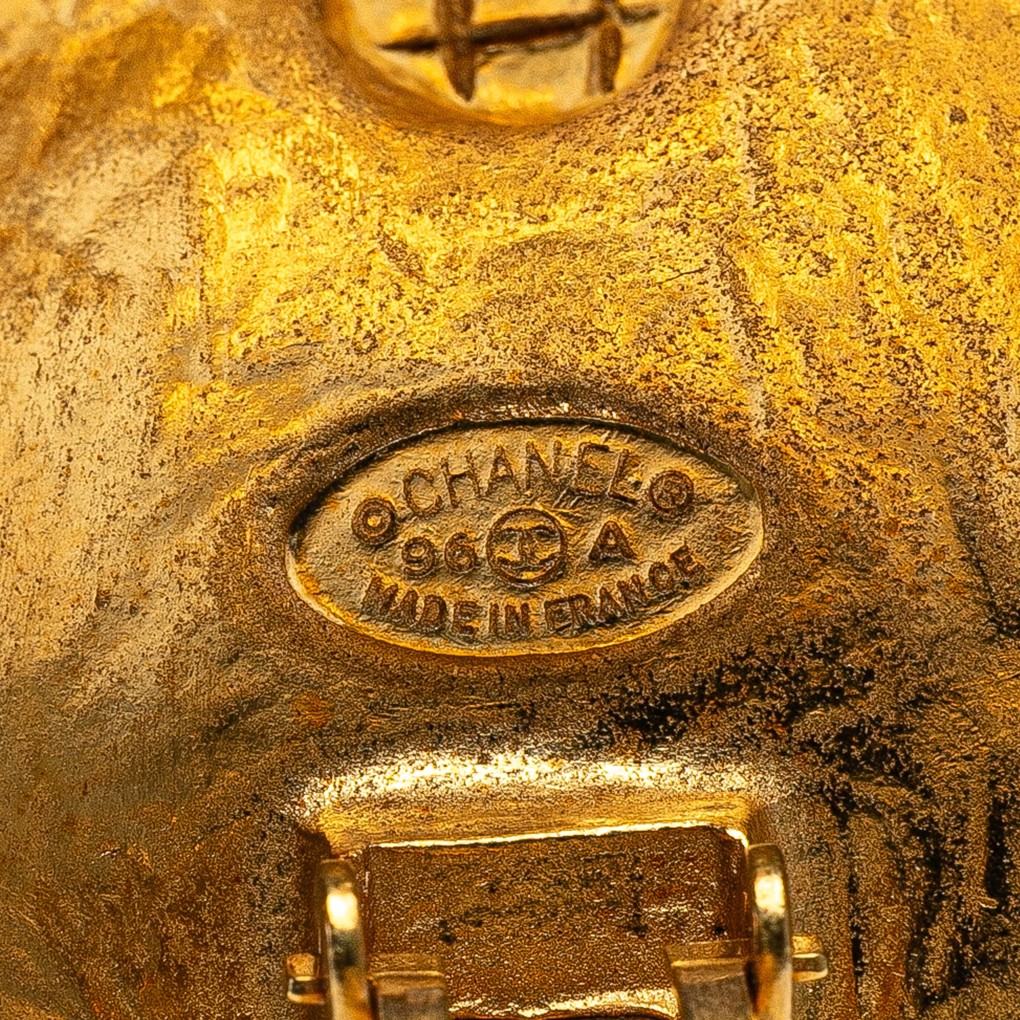 Product Details: Gold Chanel Gold Plated CC Grapevine Round Clip on Earrings. These earrings feature a gold-plated metal body and clip-on closures. 1.2" L x 1.2" W x 0" D. Serial number 96A.