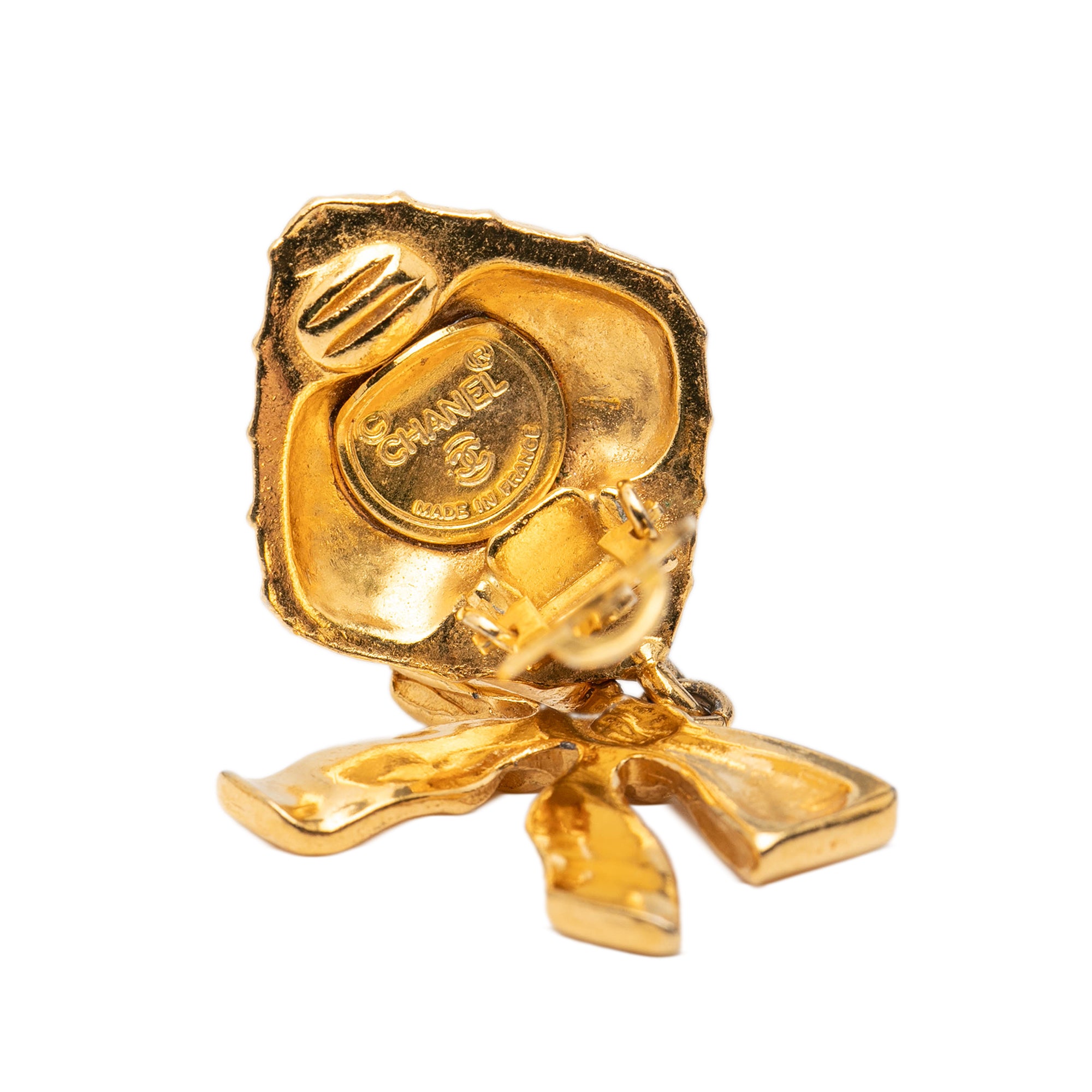 Product Details: Gold Chanel Gold Plated Quilted Diamond Ribbon Clip on Earrings. These earrings features a gold plated metal body and push back closure. 1.8" L x 1" W x 0" D.