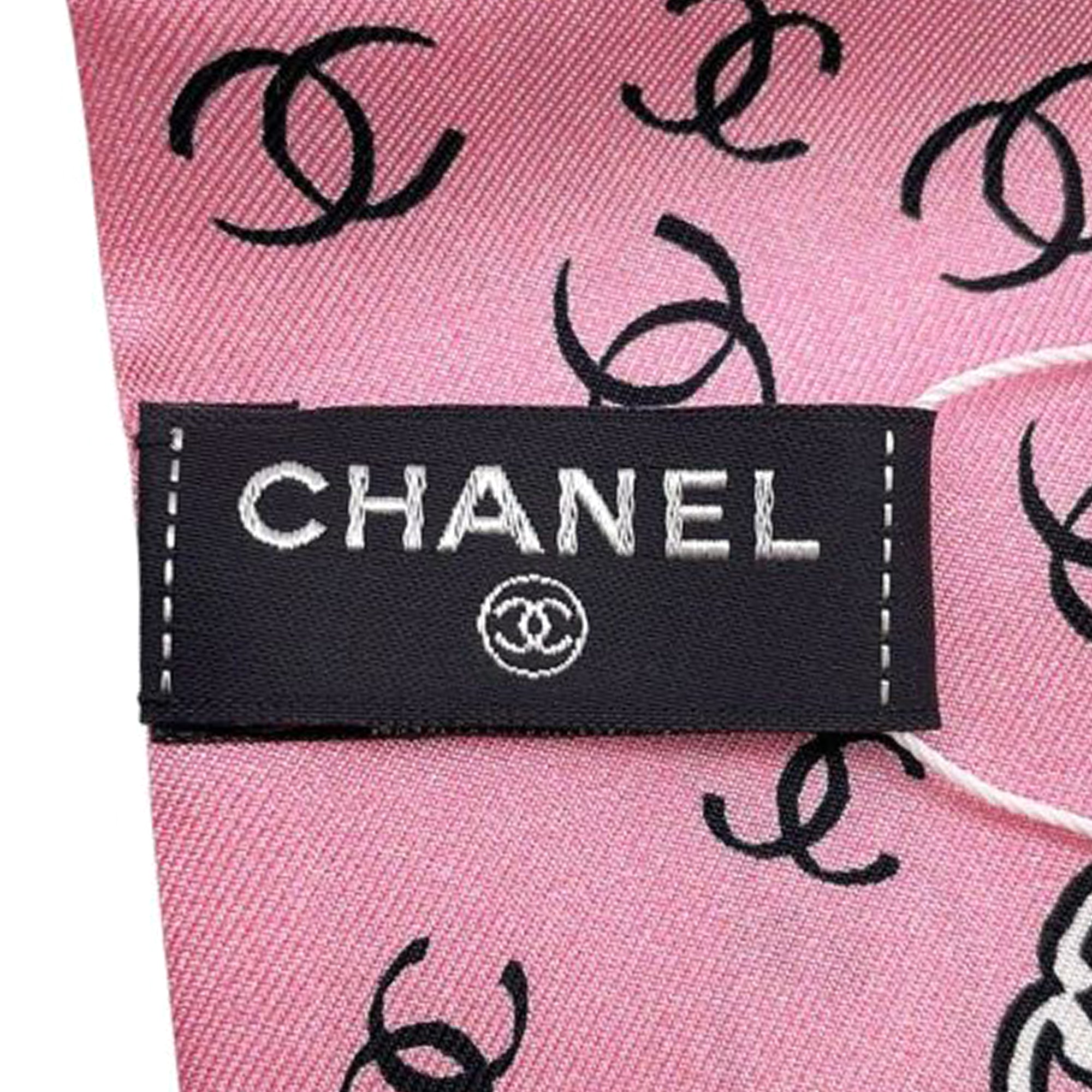 Product Details: Pink Chanel CC Printed Silk Slim Bandeau Scarf Scarves. This bandeau scarf features a print in 100% silk. 2.4" L x 47.6" W x 0" D.
