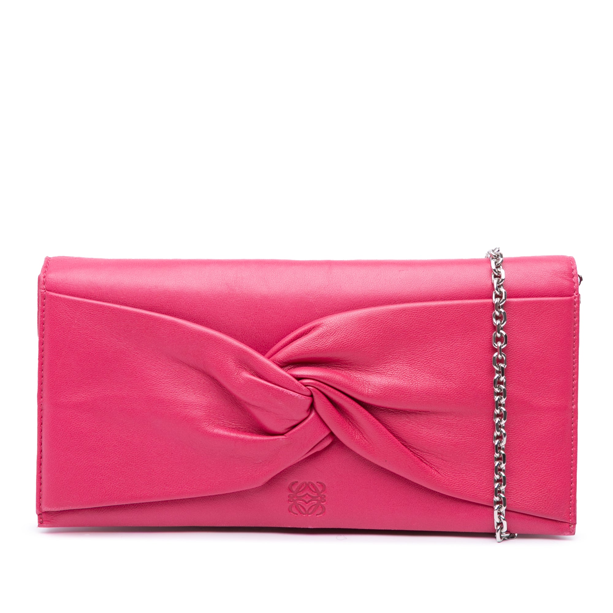 Please note this is a pre-owned item that may display signs of wear consistent with the condition listed above and shown in photos. Designer Revival guarantees this is an authentic Pink LOEWE Anagram Nappa Bow Tie Clutch with Chain Crossbody Bag or 100% of your money back. Learn more about our authentication process.