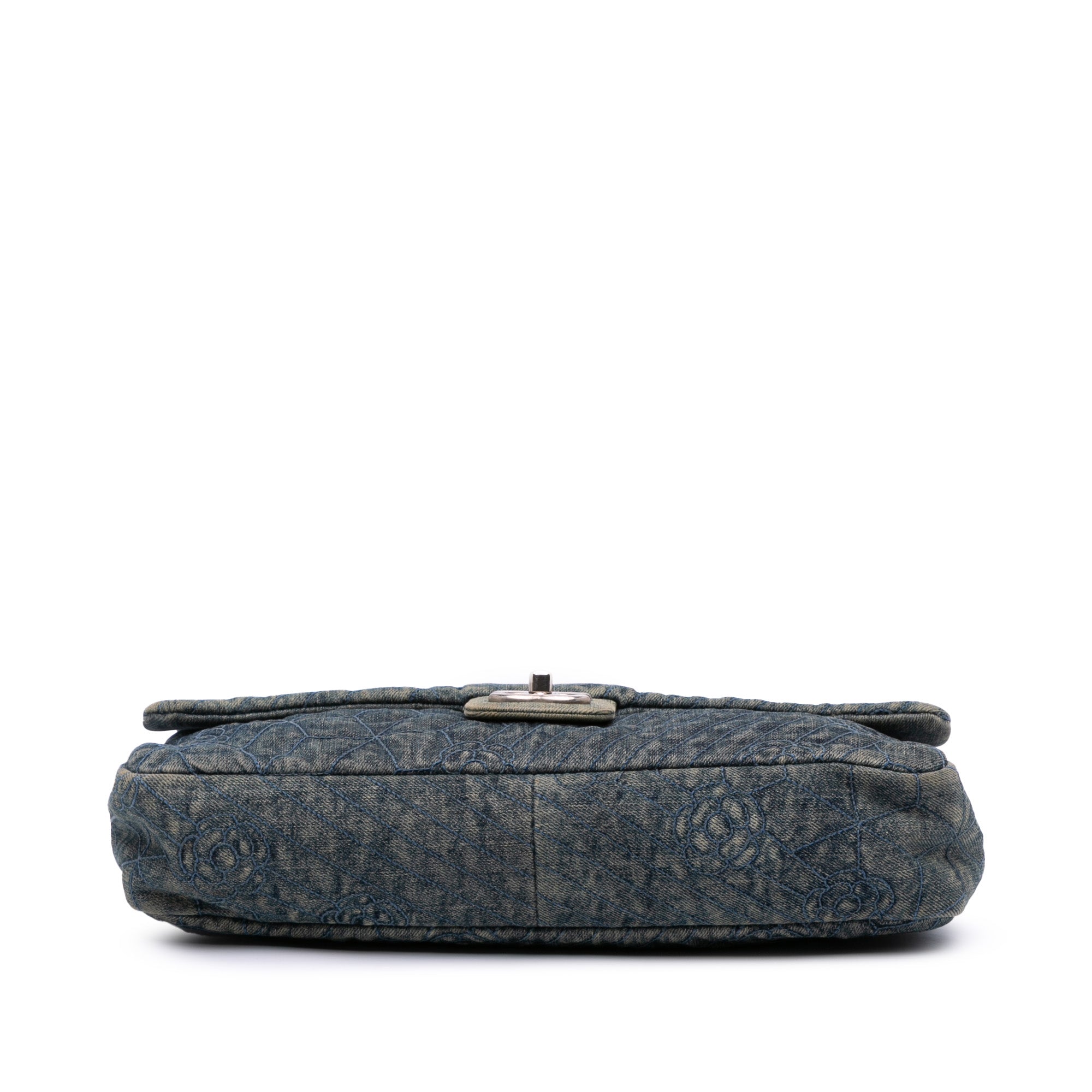 Product Details: Blue Chanel Large Embroidered Denim Camellia Flap Crossbody Bag. This flap bag features an embroidered denim body, a leather-woven chain strap with leather shoulder guard, a flap with CC turn lock closure, and interior zip and slip pockets. 7.1" L x 11.8" W x 238.2" D. Serial number 16107275.