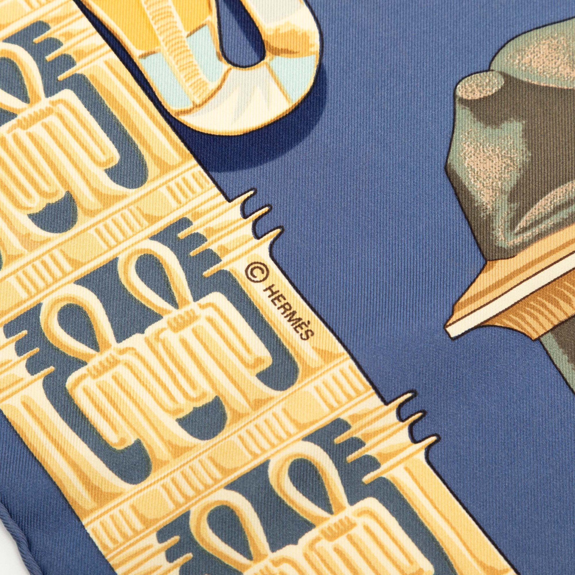 Product Details: Blue Hermès Tutankhamun Silk Scarf 90 Scarves. This scarf features the Tutankhamun print on 100% silk. 35" L x 35.4" W x 0" D.