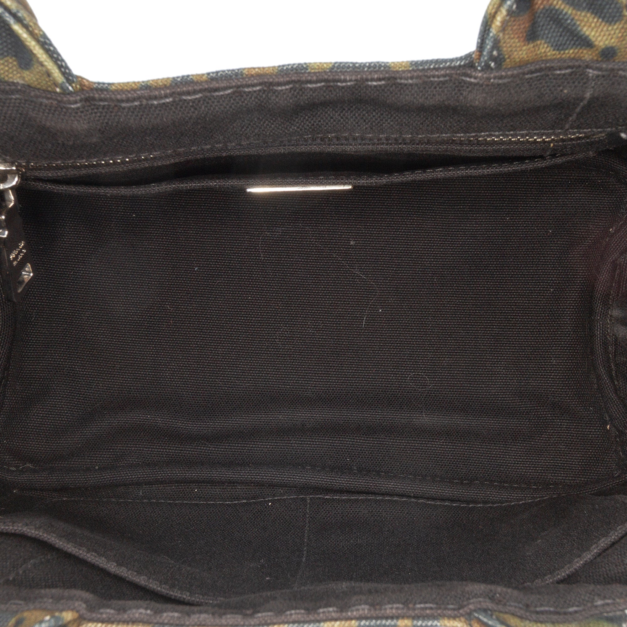 Product Details: Brown Prada Small Leopard Print Canvas Canapa Satchel. This satchel features a printed canvas body, rolled leather top handles, a detachable shoulder strap, an open top, and interior zip and slip pockets. 7.5" L x 10.6" W x 6.1" D, 5.3" drop.
