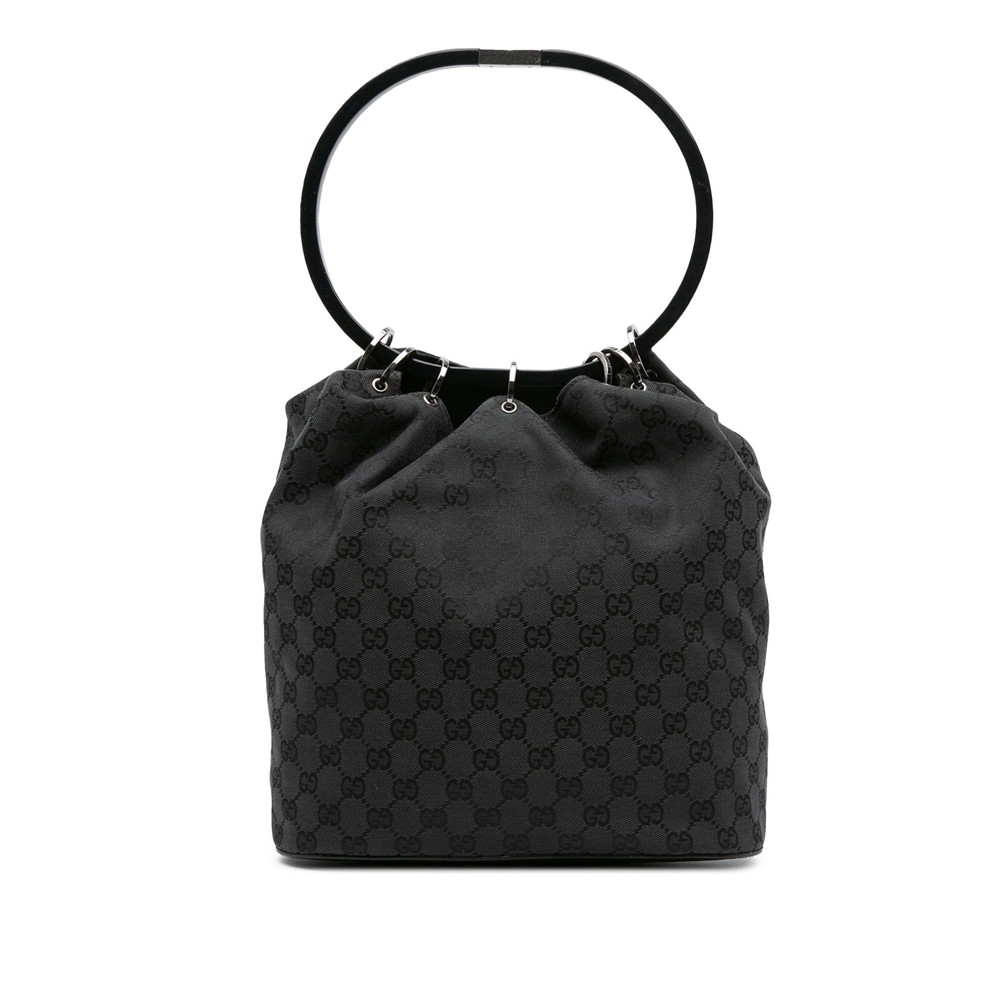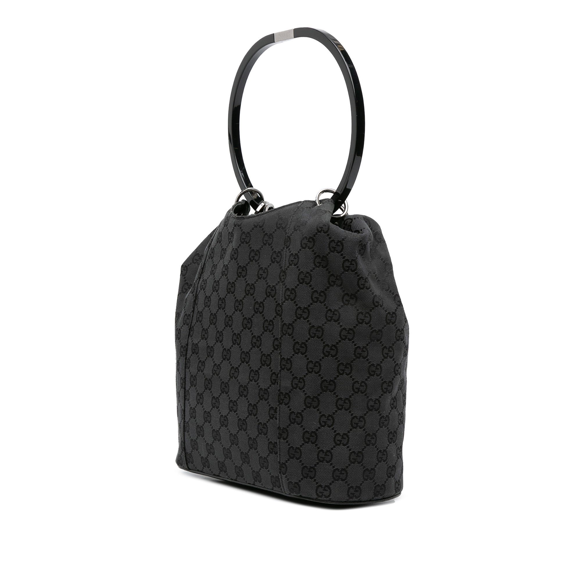 Product Details: Black Gucci GG Canvas Ring Handbag. This handbag features a canvas body, a resin hoop handle, an open top, and an interior zip pocket. 11" L x 10.8" W x 4.9" D, 7.9" drop. Serial number 001 3738 3754.