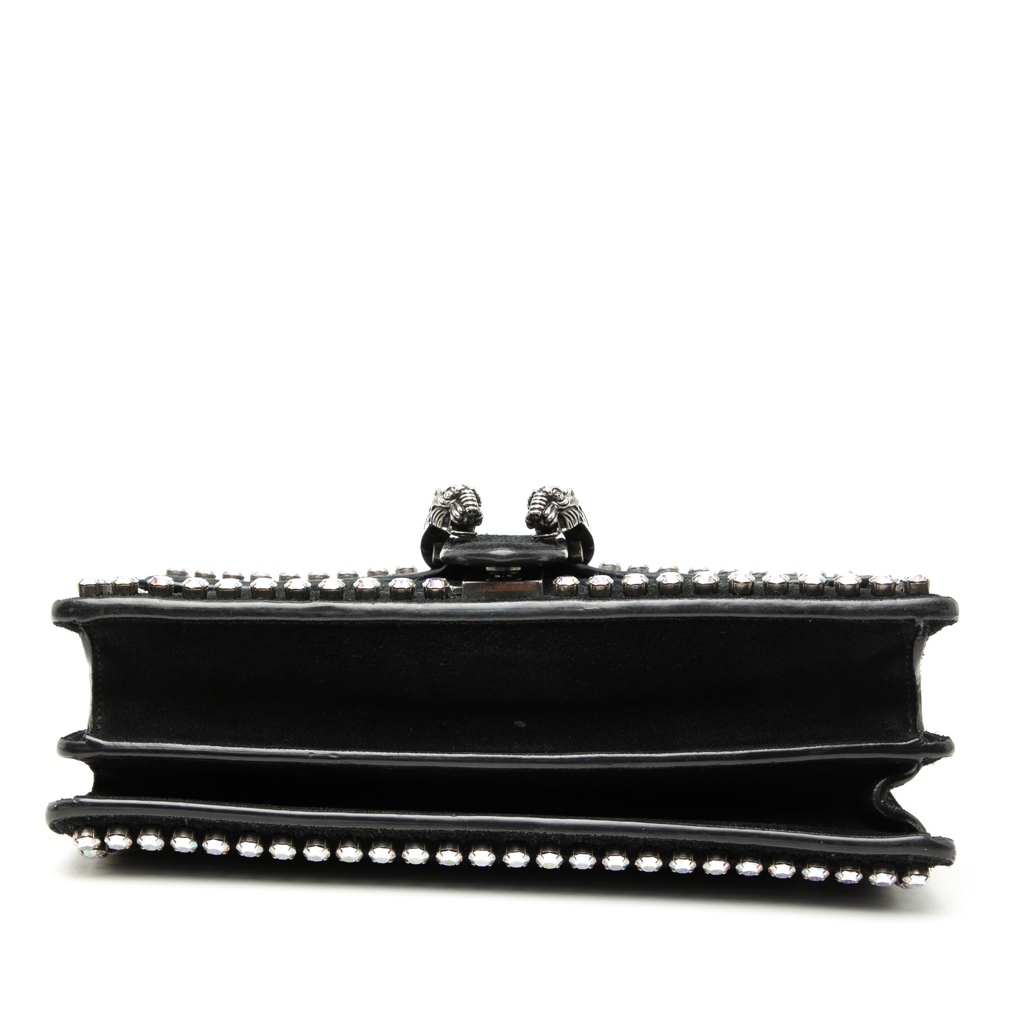 Product Details: Black Gucci Small Suede Crystal Embellished Dionysus Shoulder Bag. This shoulder bag features a suede body with crystal embellishments, curb chain link straps, a front flap with a magnetic snap button closure, and an interior zip compartment. 6.3" L x 10.6" W x 3.5" D. Serial number 400249 493075.