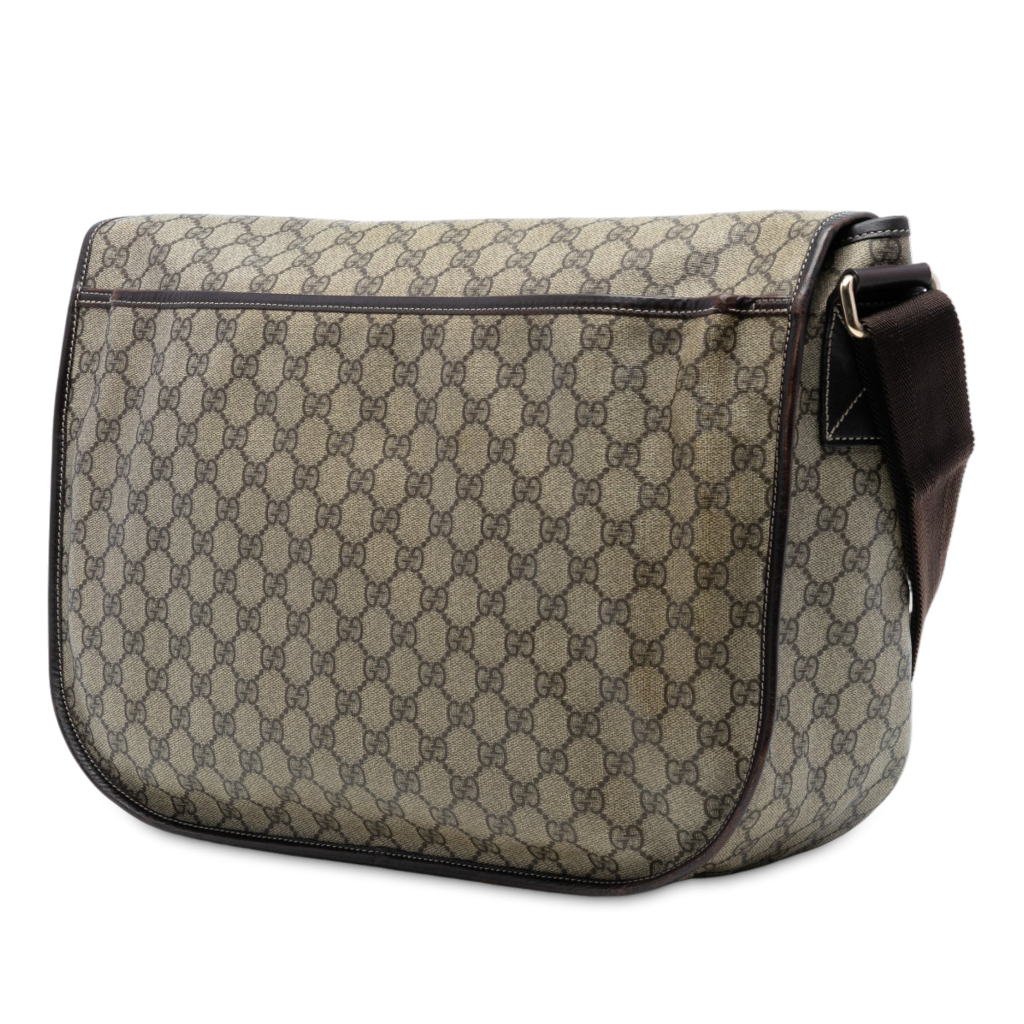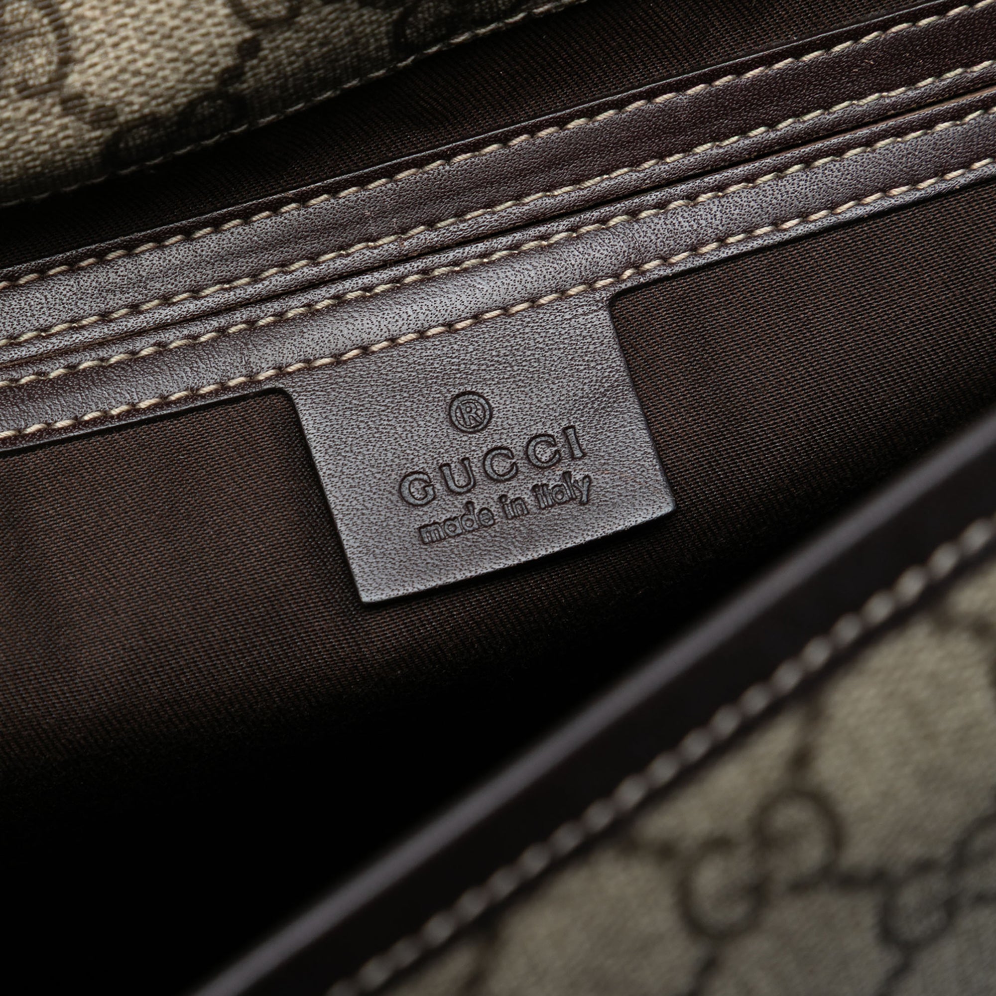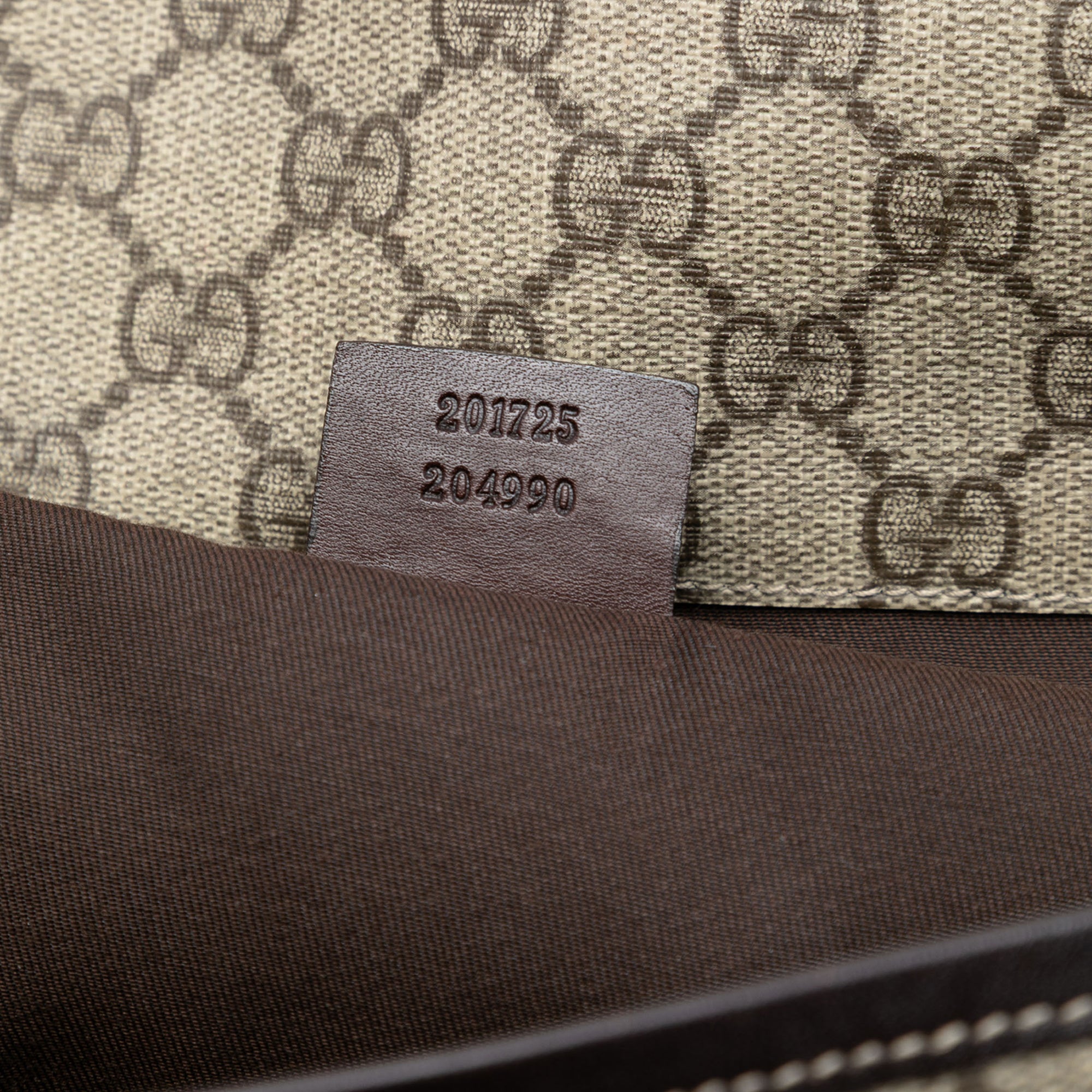 Product Details: Brown Gucci GG Supreme Messenger Bag. This crossbody bag features a coated canvas body with leather trim, an adjustable flat strap, a top flap with dual buckle closures, and interior zip and slip pockets. 12.8" L x 16.1" W x 5.3" D. Serial number 201725 204990.