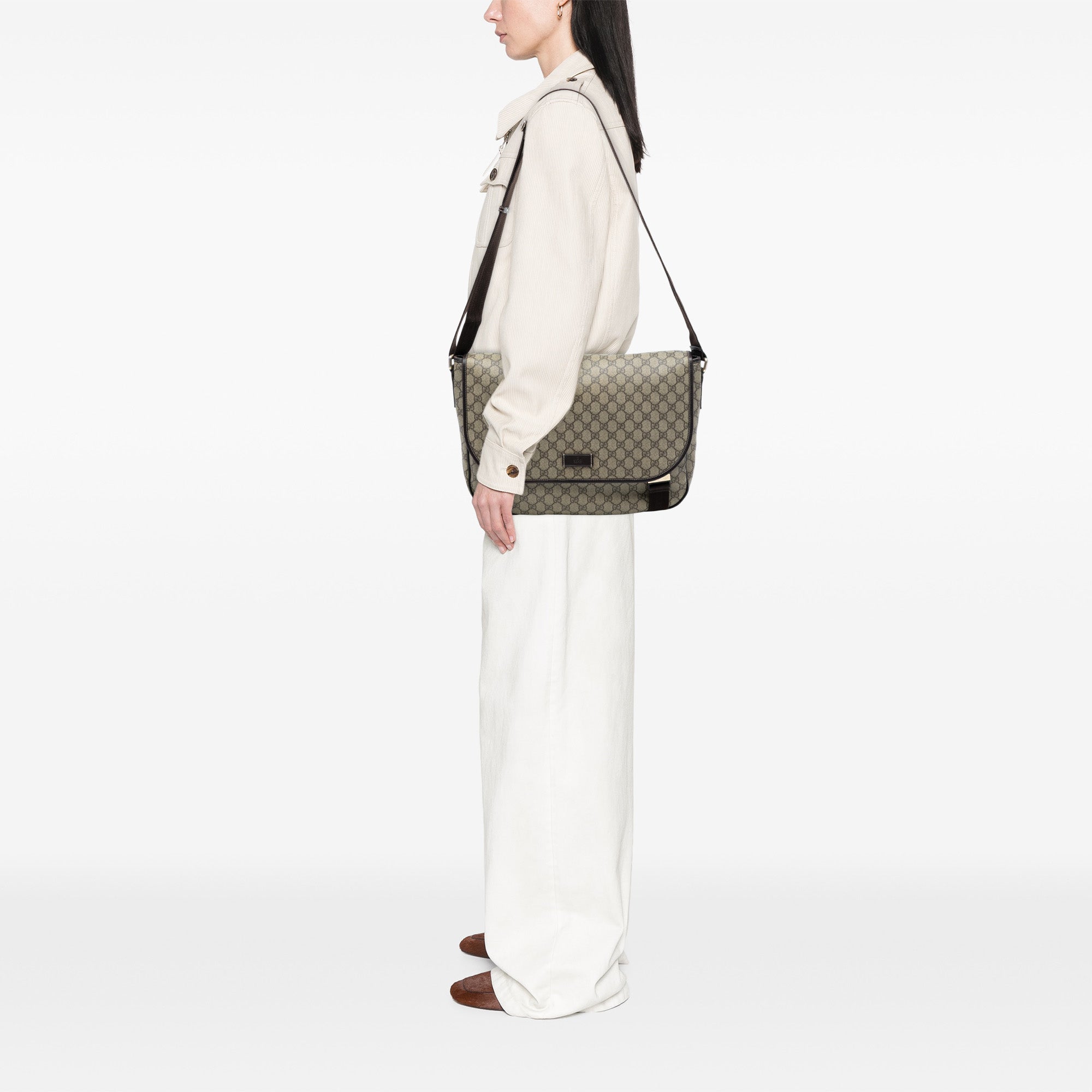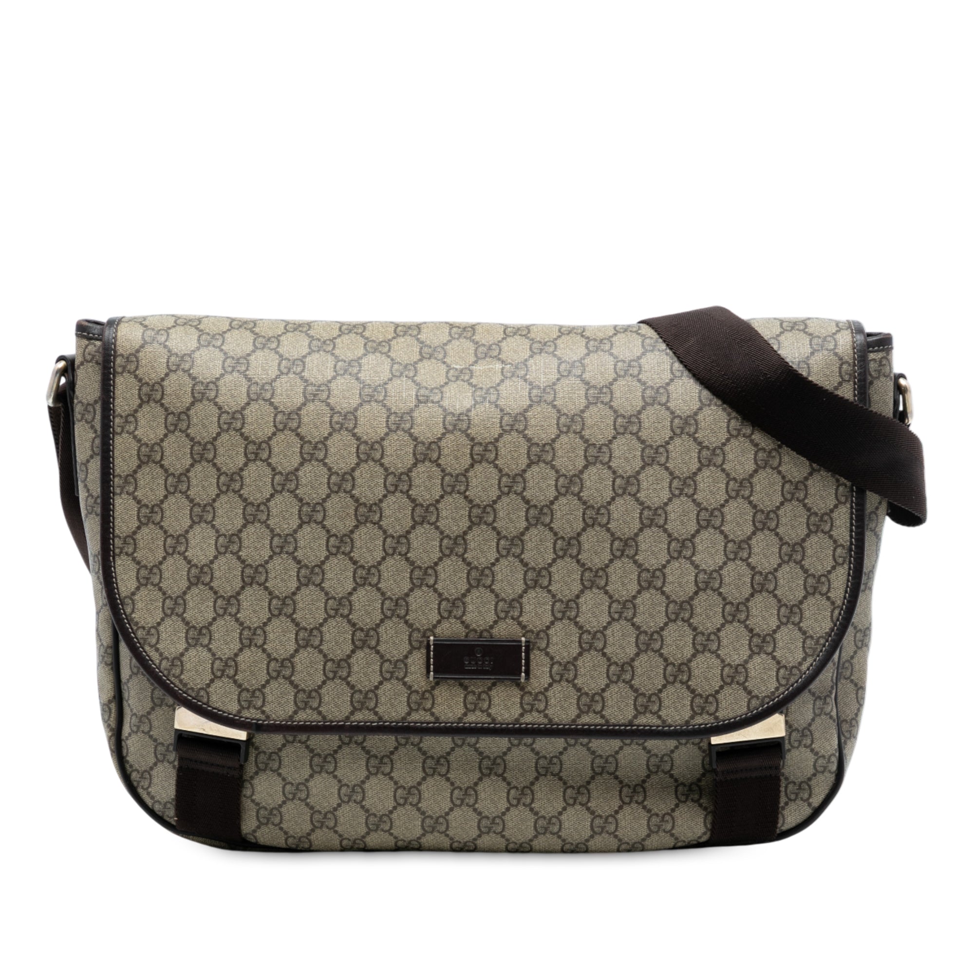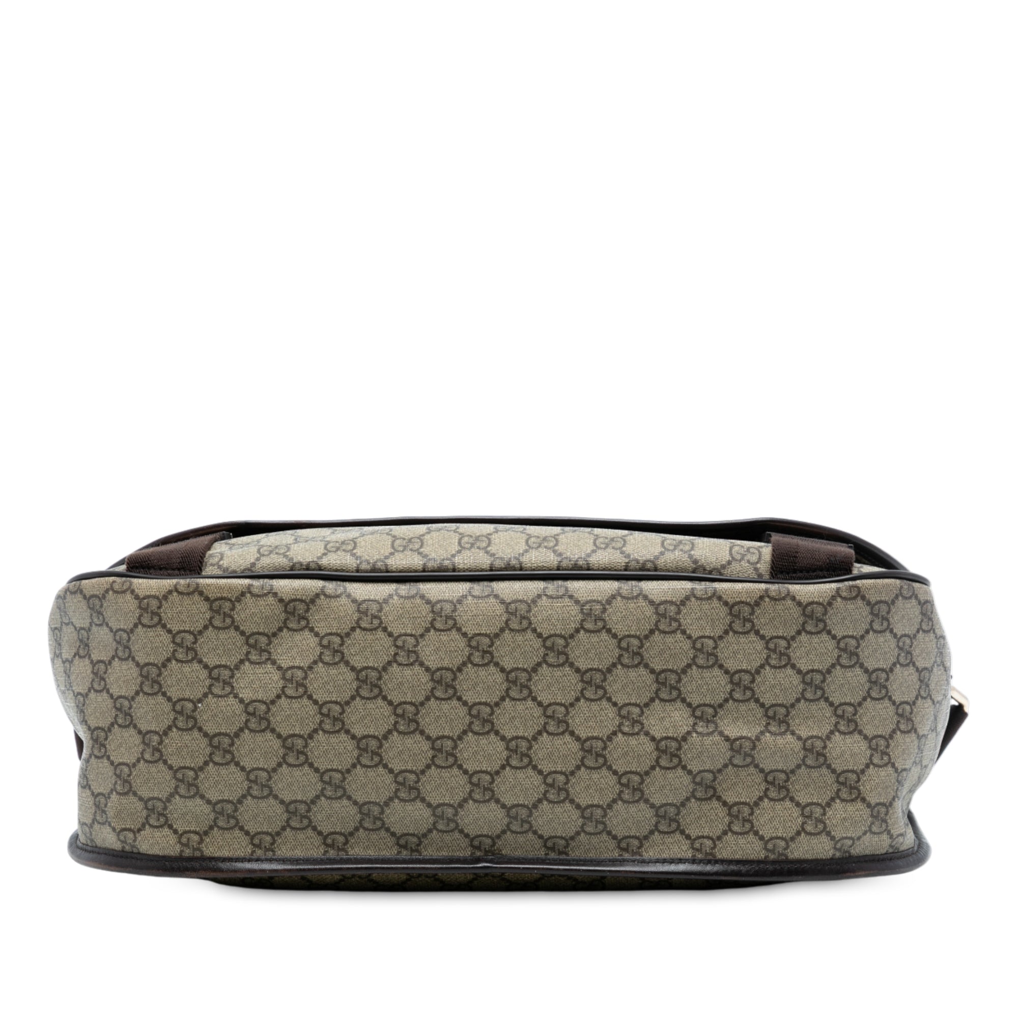 Product Details: Brown Gucci GG Supreme Messenger Bag. This crossbody bag features a coated canvas body with leather trim, an adjustable flat strap, a top flap with dual buckle closures, and interior zip and slip pockets. 12.8" L x 16.1" W x 5.3" D. Serial number 201725 204990.