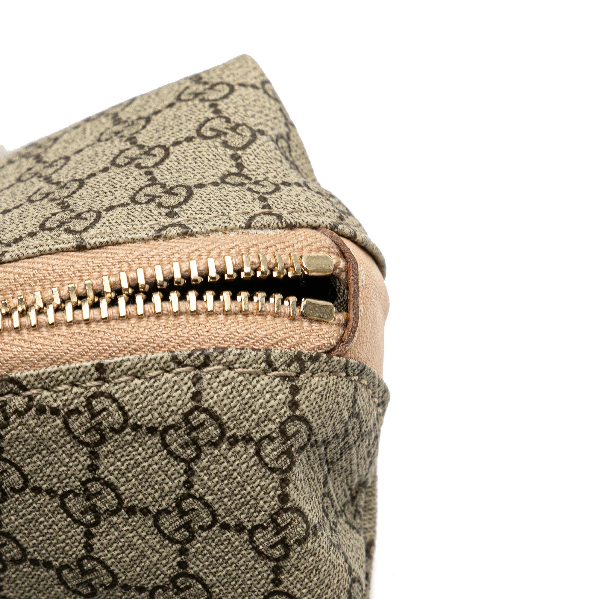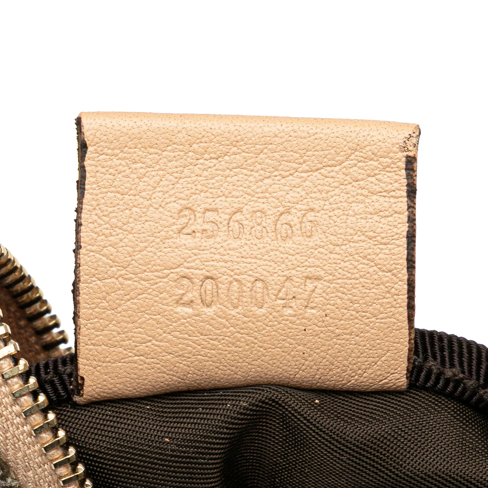 Product Details: Brown Gucci GG Supreme Pig Pouch. This pouch features a coated canvas and leather body, and a top zip closure. 3" L x 5.5" W x 3.3" D. Serial number 256866 200047.