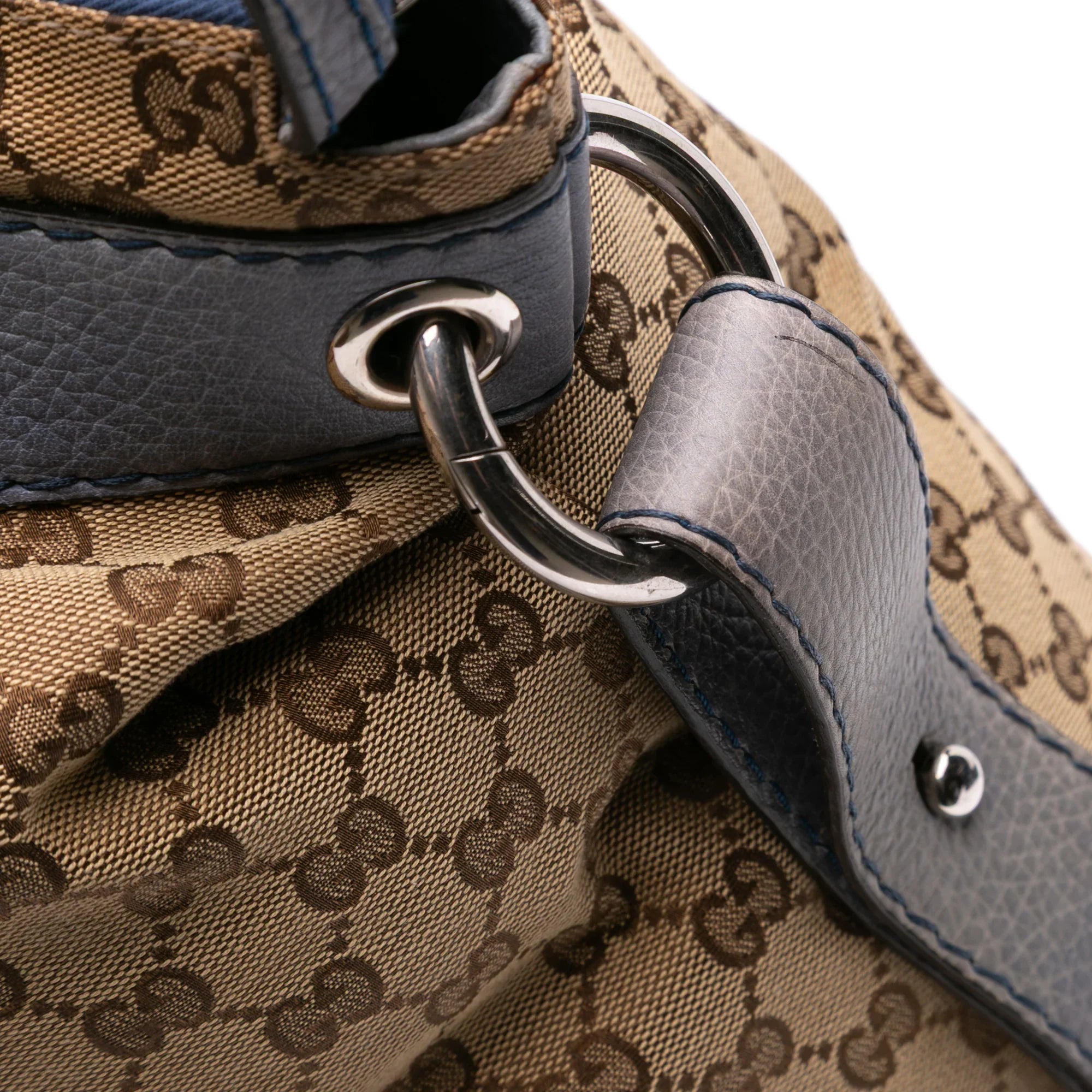 Product Details: Brown Gucci Large GG Canvas Bamboo Bar Tote. This tote bag features a canvas body with leather trim, braided leather shoulder straps, a top zip closure, and interior zip and slip pockets. 15.4" L x 16.3" W x 6.3" D, 6.3" drop. Serial number 232927 002123.