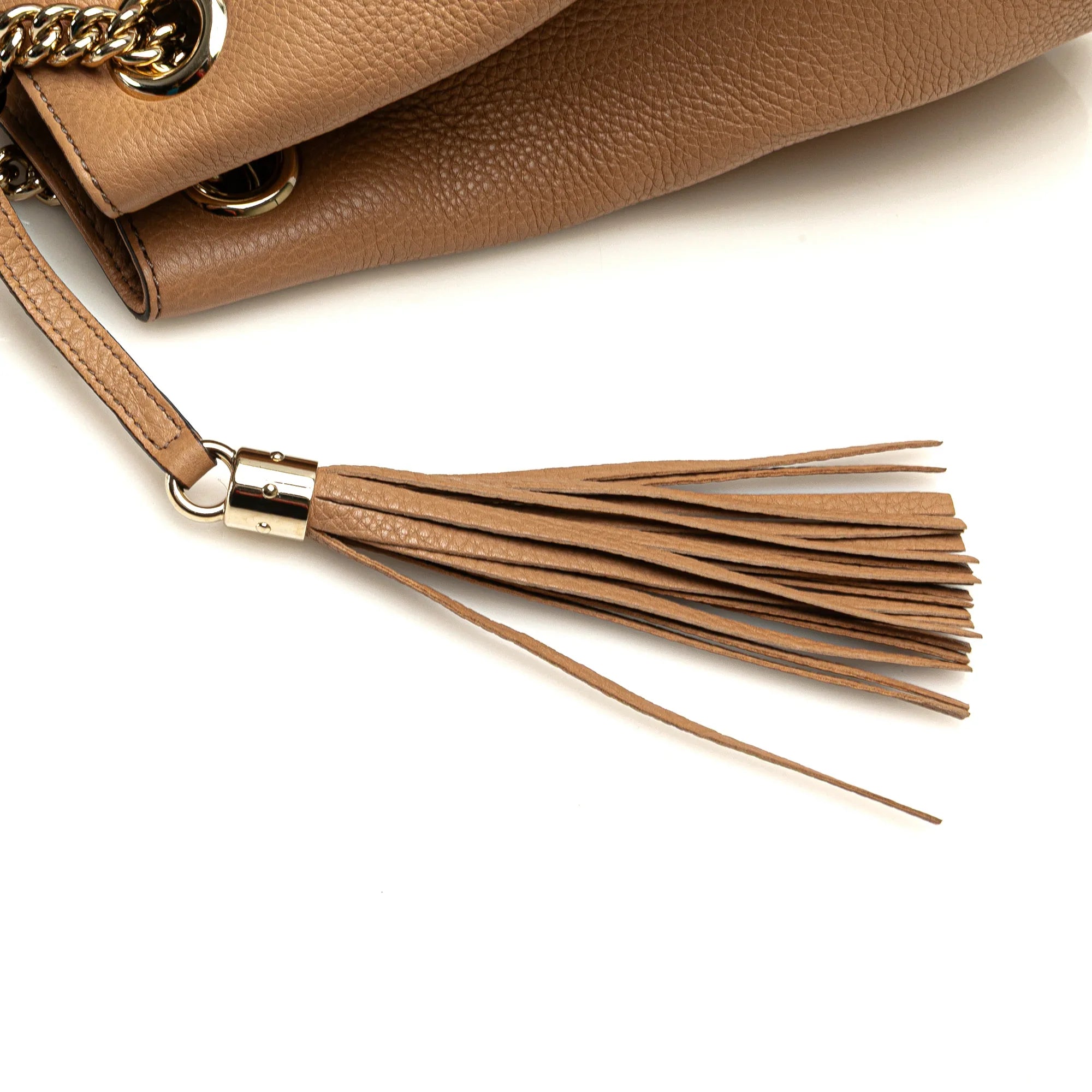 Product Details: Brown Gucci Medium Leather Soho Chain Tote. The Soho Chain tote bag features a leather body, chain link straps with leather guard, a tassel detail, an open top with hook closure, and interior zip and slip pockets. 9.8" L x 14.8" W x 5.9" D, 9.4" drop. Serial number 308982 502752.