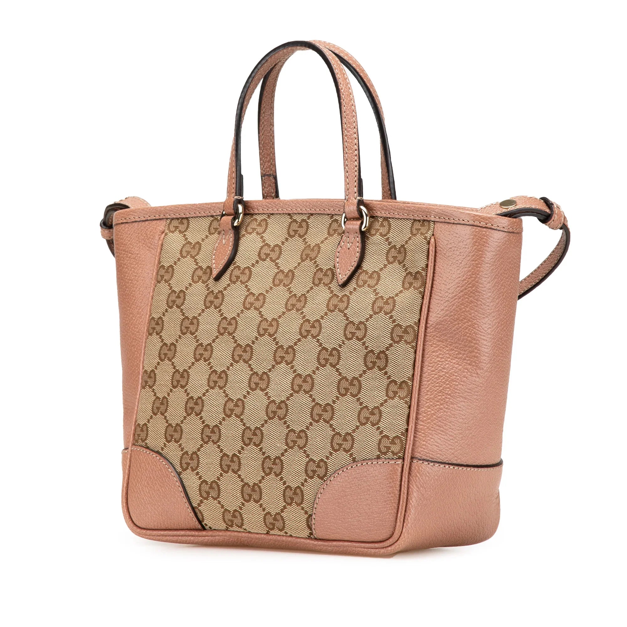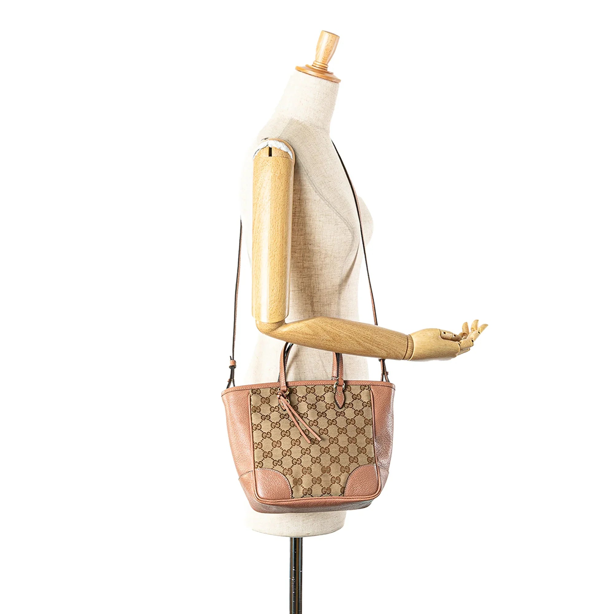 Product Details: Brown Gucci Small GG Canvas Bree Satchel. The Bree features a canvas body, flat leather handles, a detachable flat leather shoulder strap, a top zip closure, and interior zip and slip pockets. 8.1" L x 7.7" W x 3.9" D, 3.5" drop. Serial number 353121.200047.
