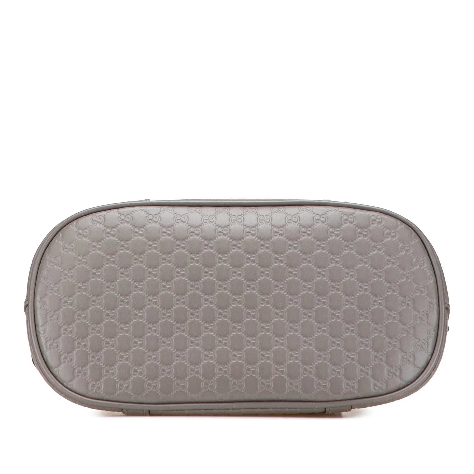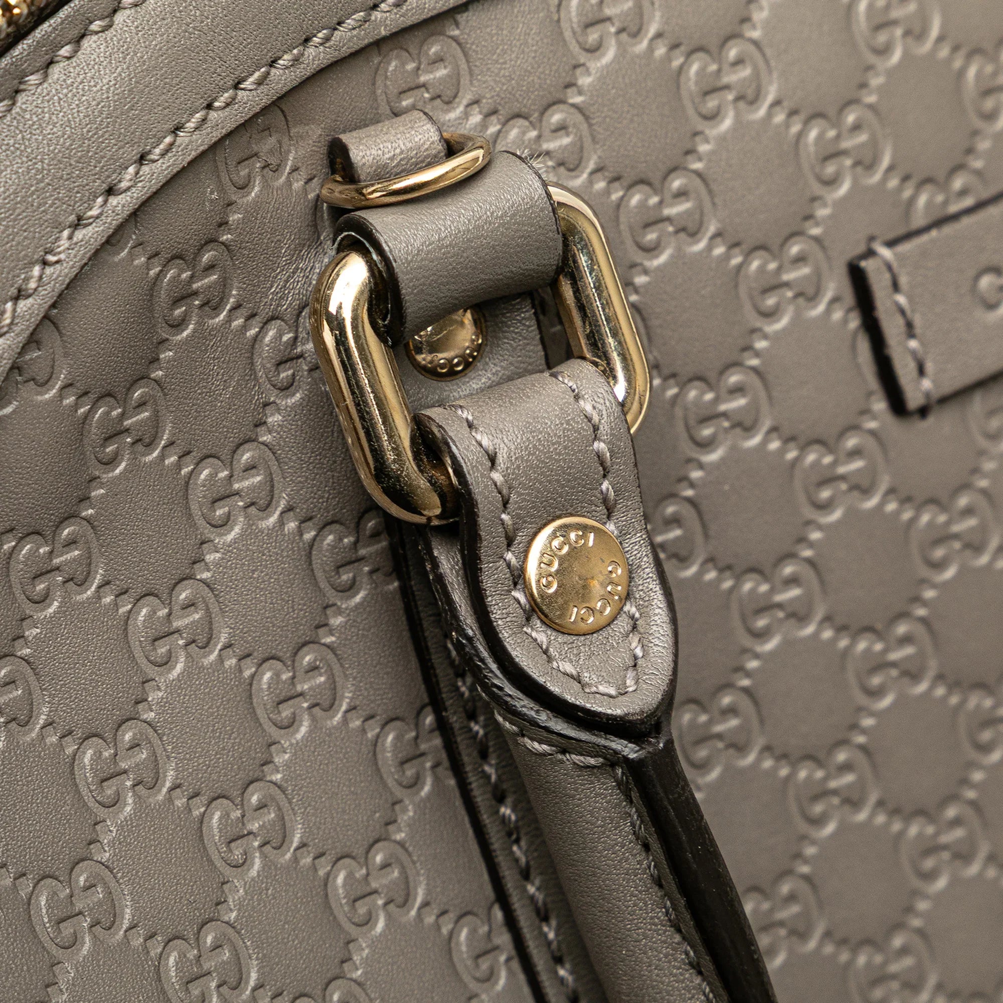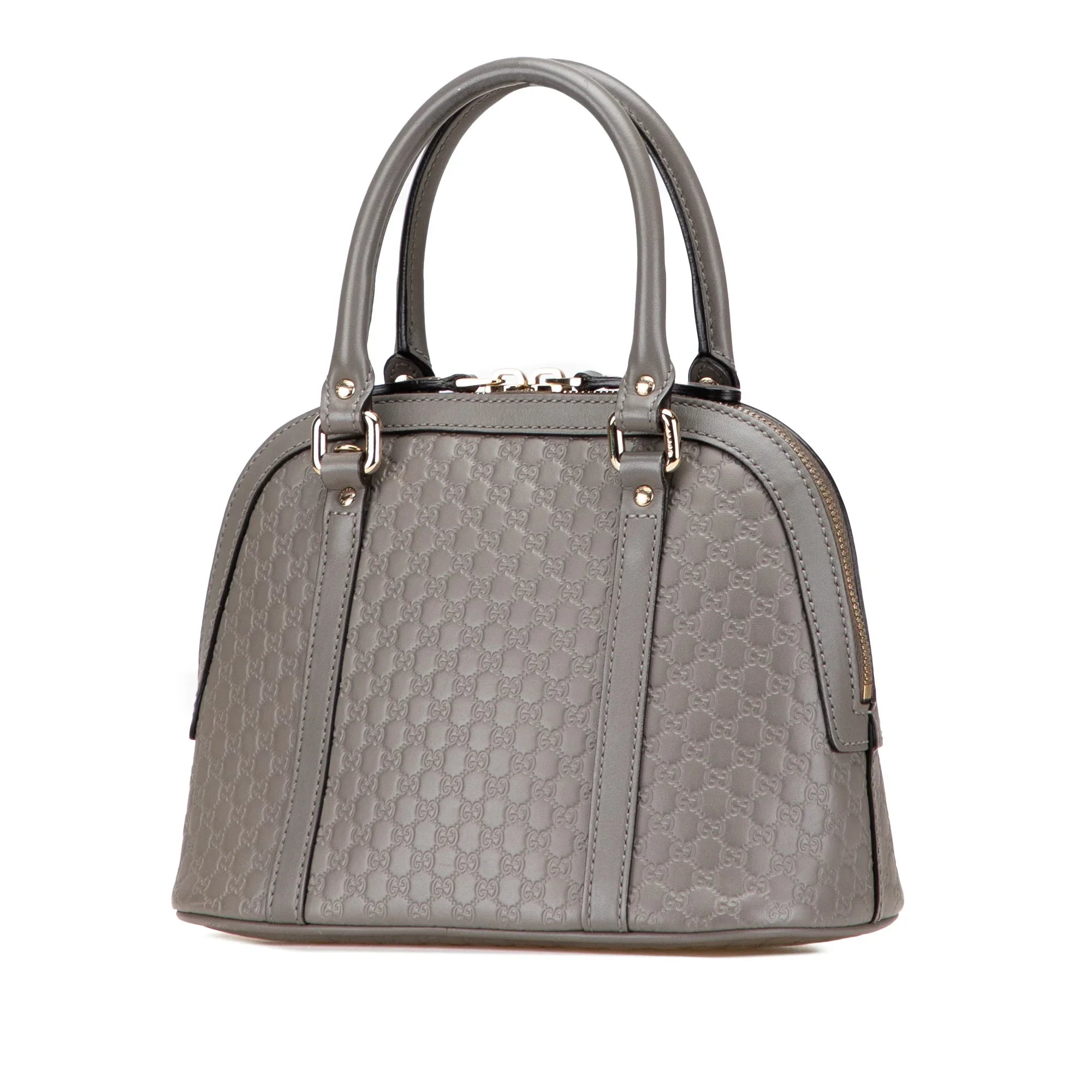 Product Details: Gray Gucci Mini Microguccissima Dome Satchel. The Mini Dome satchel features an embossed leather body, rolled leather handles, a detachable flat strap, a top zip closure, and an interior slip pocket. 7.1" L x 9.4" W x 4.7" D, 3.9" drop. Serial number 449654 520981.