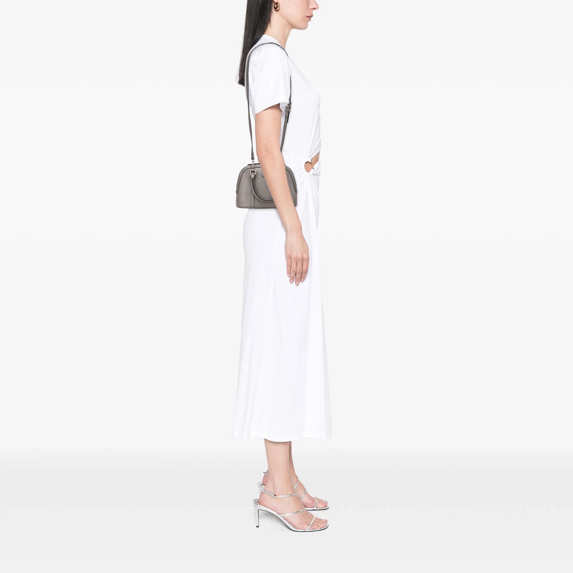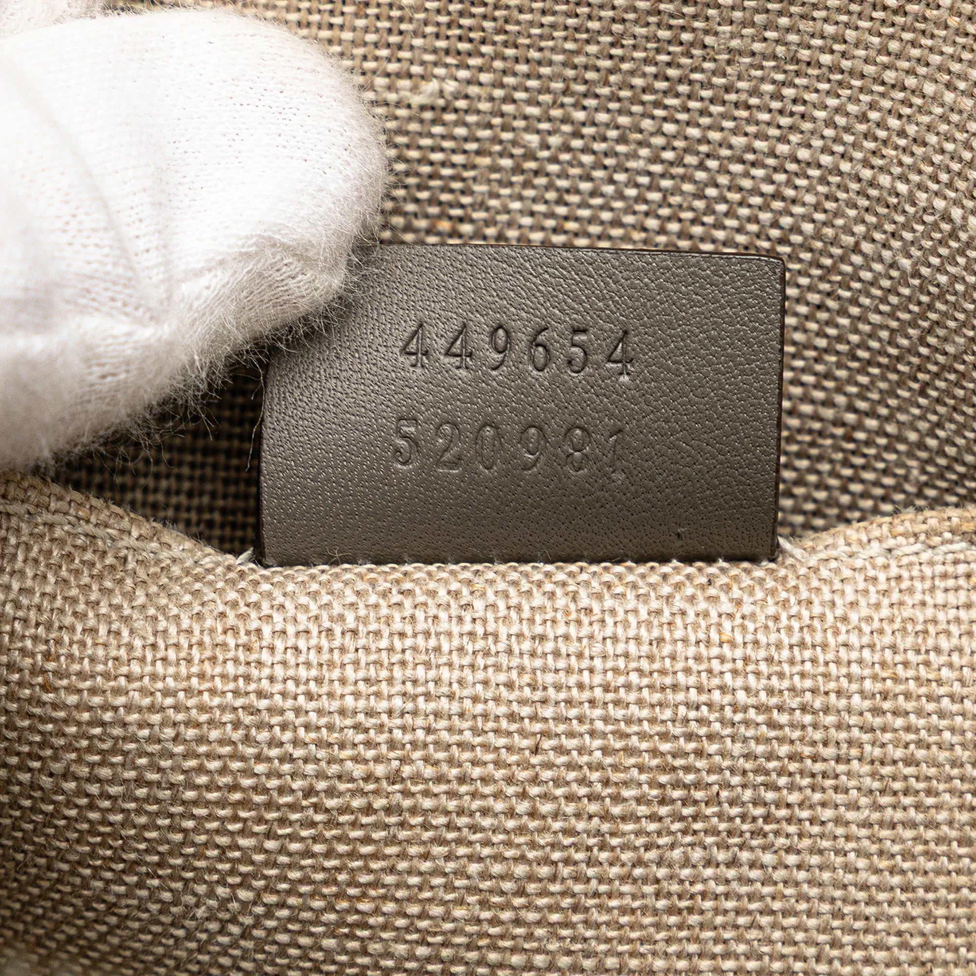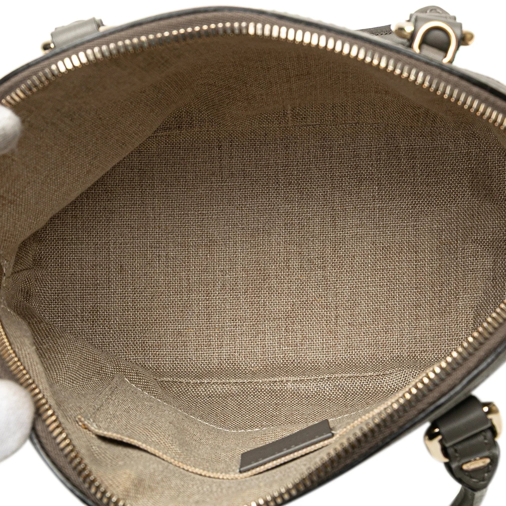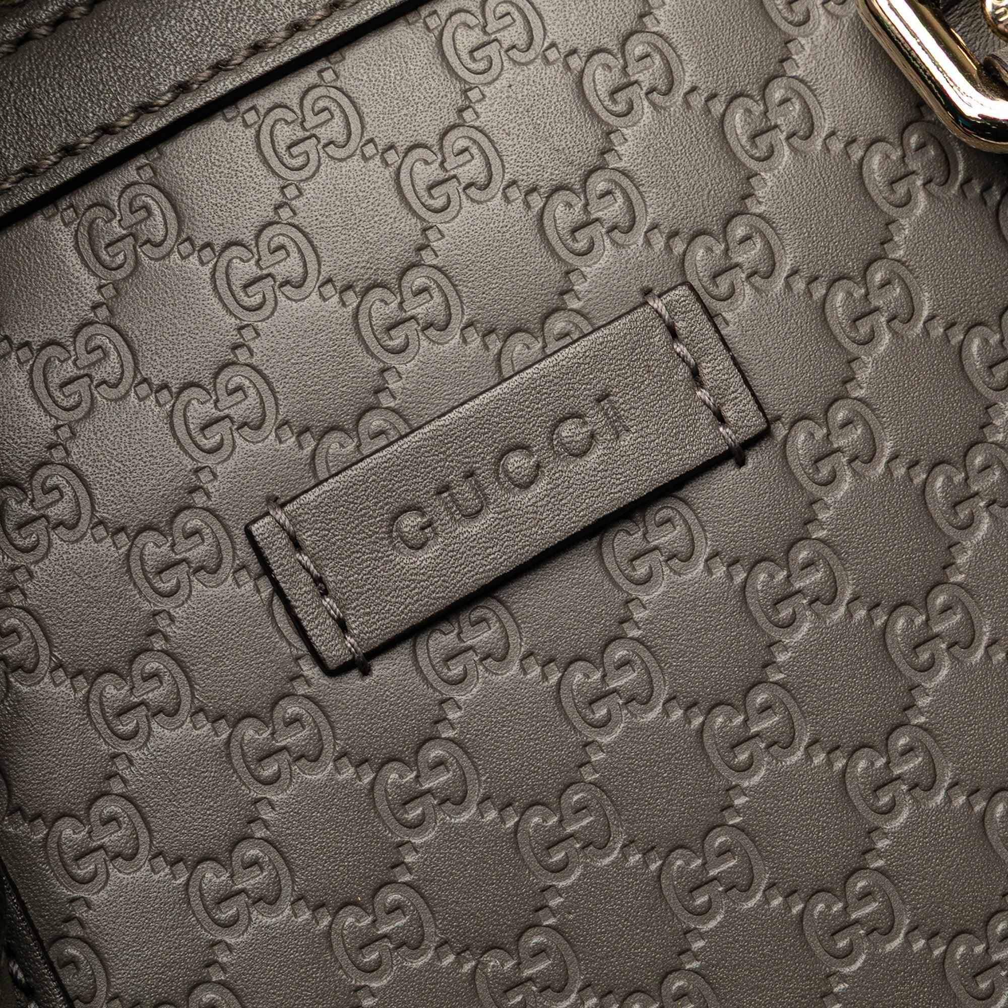 Product Details: Gray Gucci Mini Microguccissima Dome Satchel. The Mini Dome satchel features an embossed leather body, rolled leather handles, a detachable flat strap, a top zip closure, and an interior slip pocket. 7.1" L x 9.4" W x 4.7" D, 3.9" drop. Serial number 449654 520981.