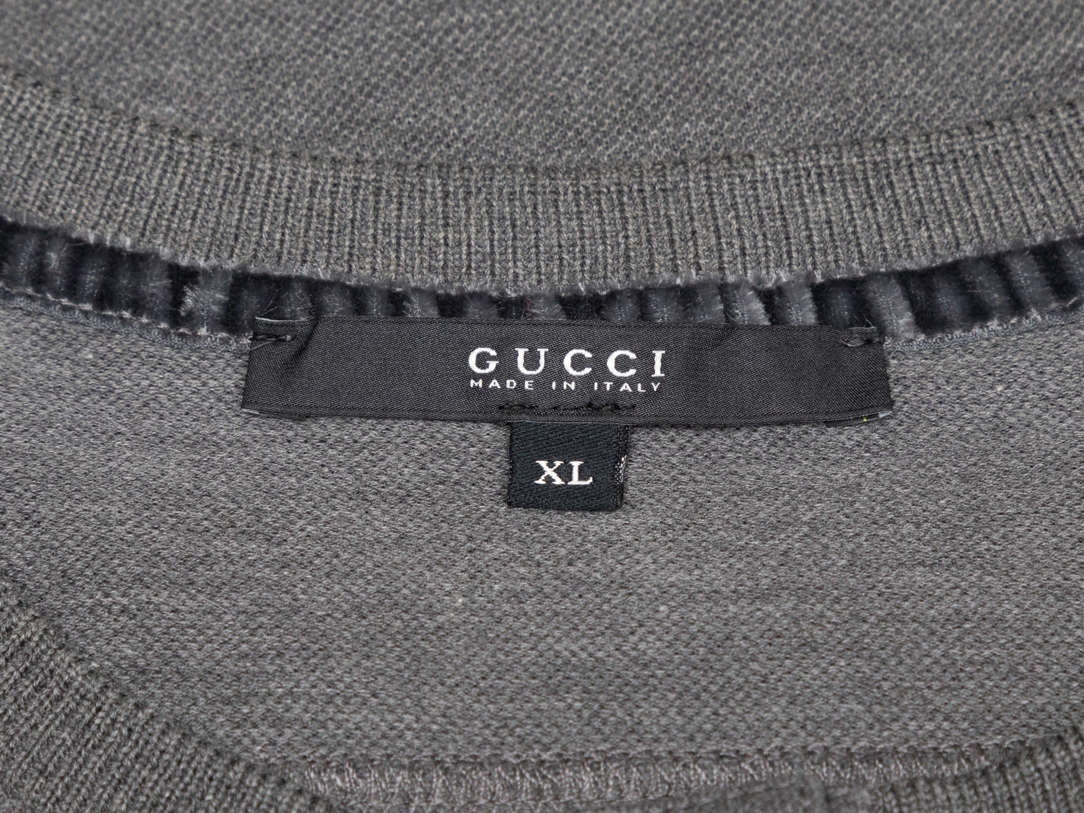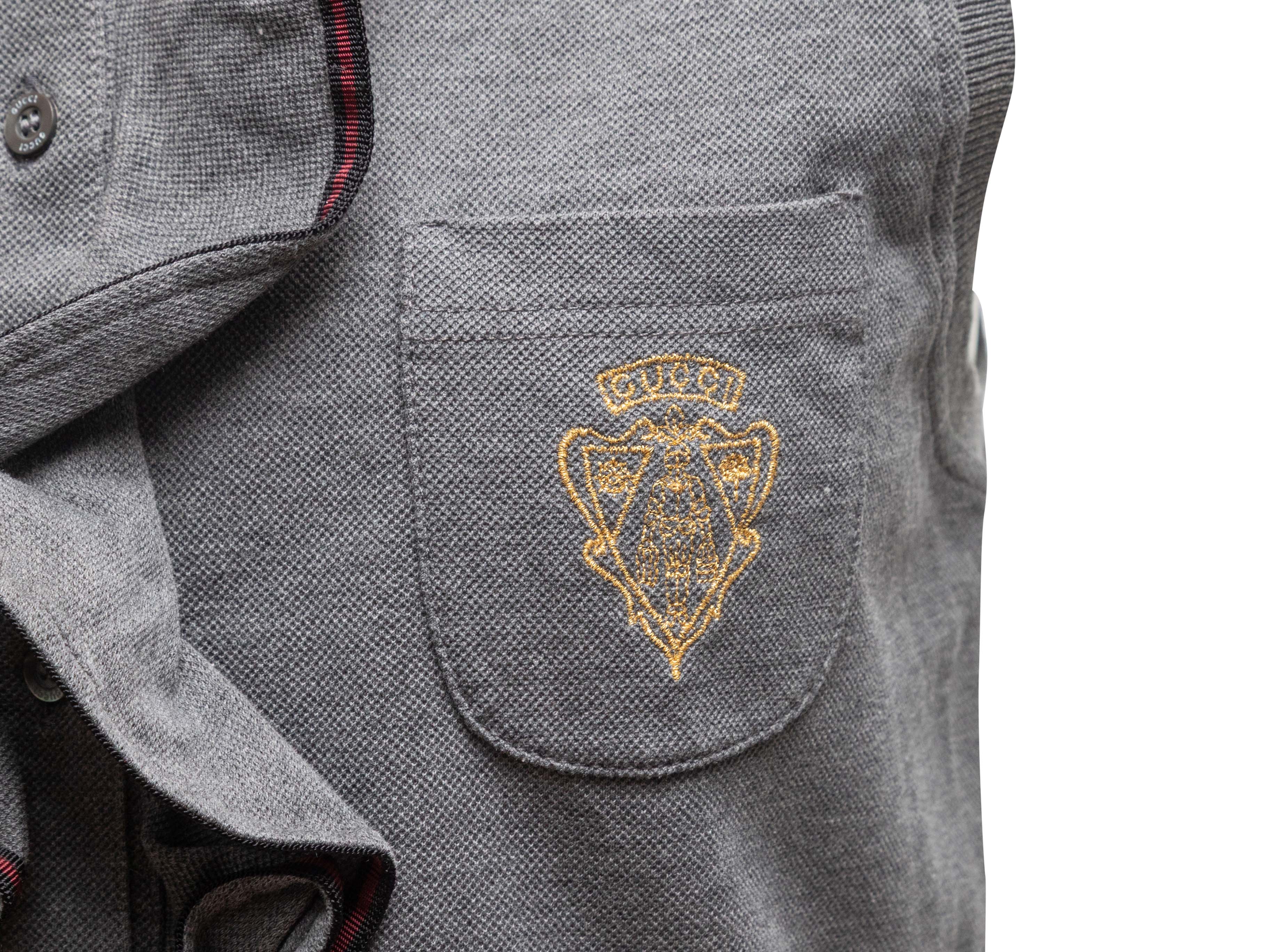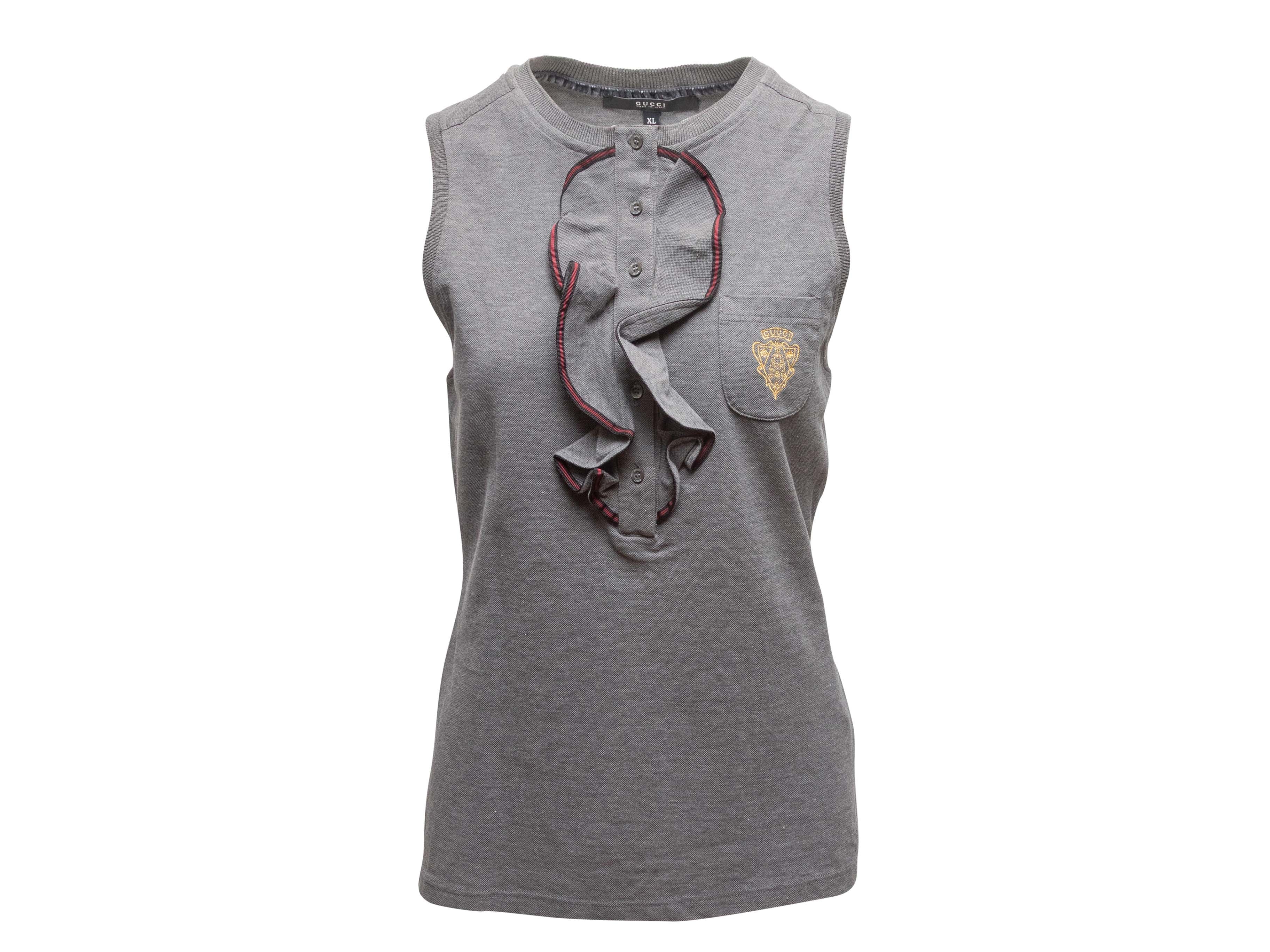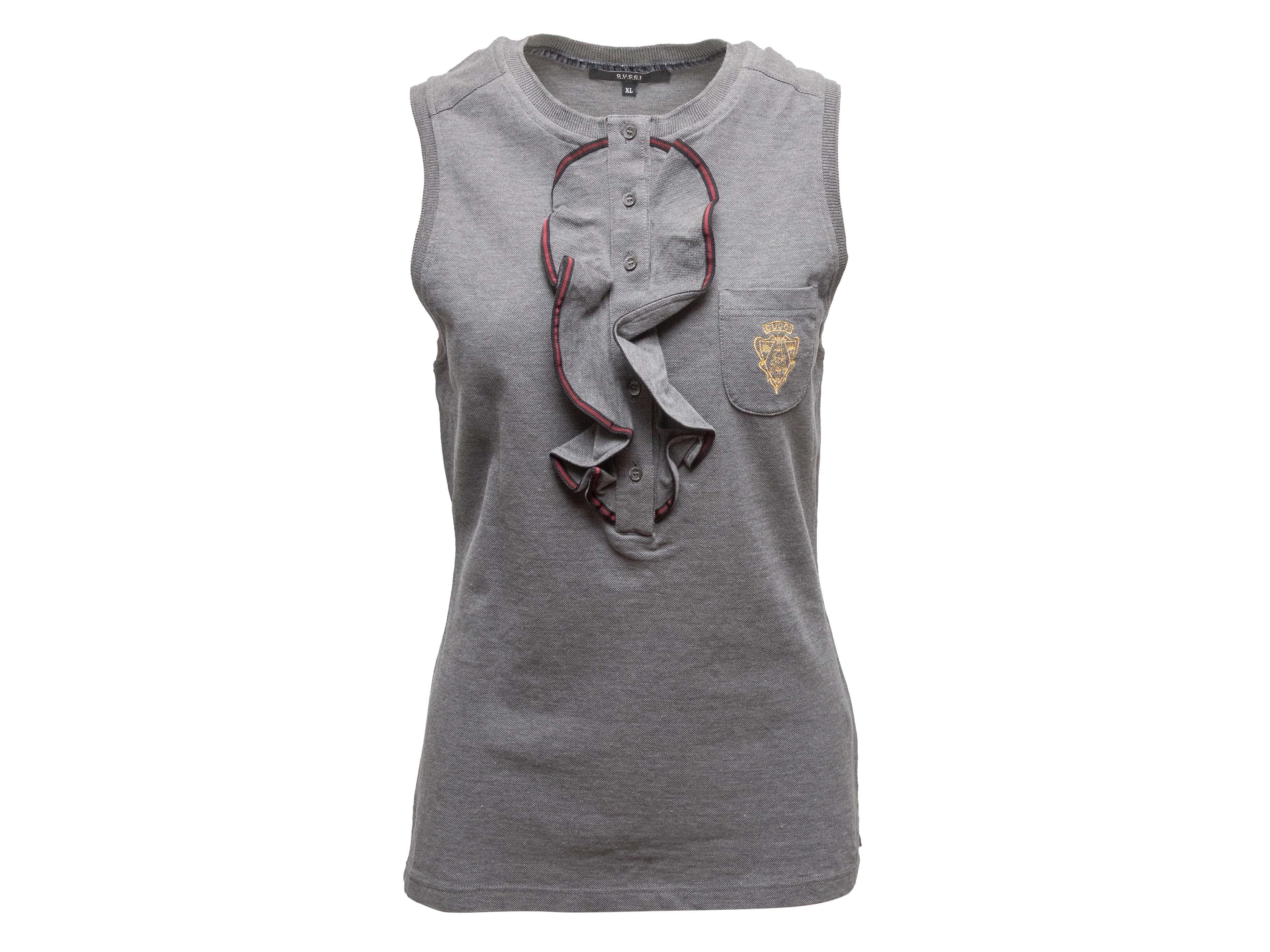 Product Details: Grey sleeveless knit top by Gucci. Crew neck. Logo crest at bust pocket. Ruffle trim at button-up front. 34" bust, 13" shoulder width, 23.5" length.