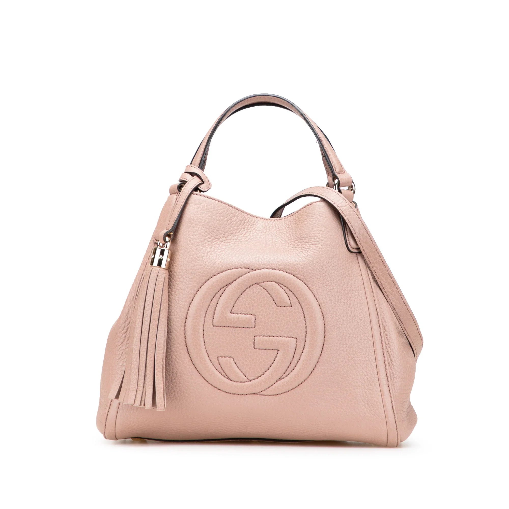 Product Details: Pink Gucci Small Leather Soho Satchel. The Small Soho satchel features a leather body, flat leather handles, a detachable leather strap, an open top with a lobster claw closure, and interior zip and slip pockets. 8.7" L x 10" W x 5.1" D, 3.9" drop. Serial number 336751 525040.