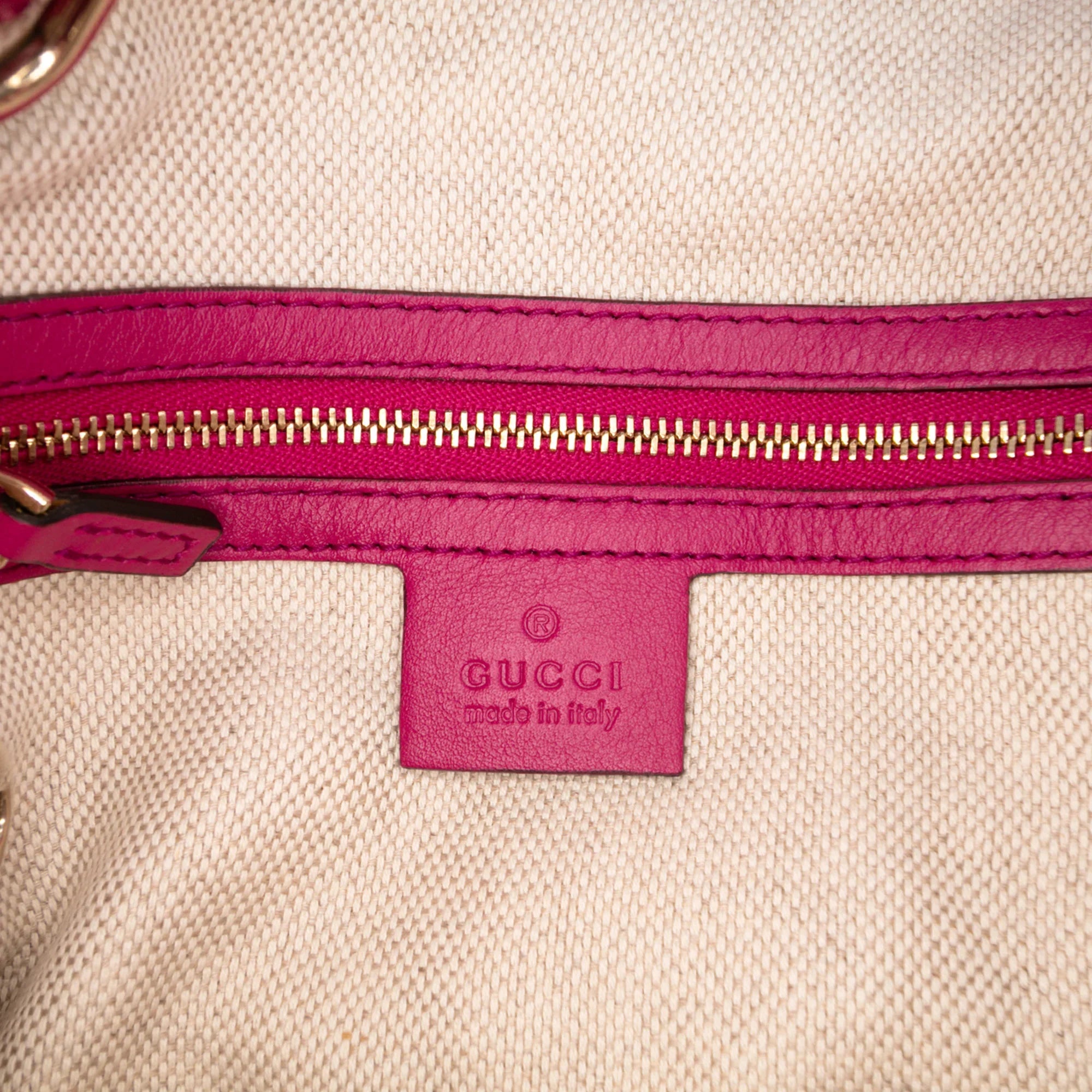 Product Details: Pink Gucci Small Patent Soho Satchel. This tote bag features a patent leather body, flat leather handles with tassel details, a detachable flat strap, an open top with lobster claw closure, and interior zip and slip pockets. 8.5" L x 10" W x 5.3" D, 3.5" drop. Serial number 336751 525040.