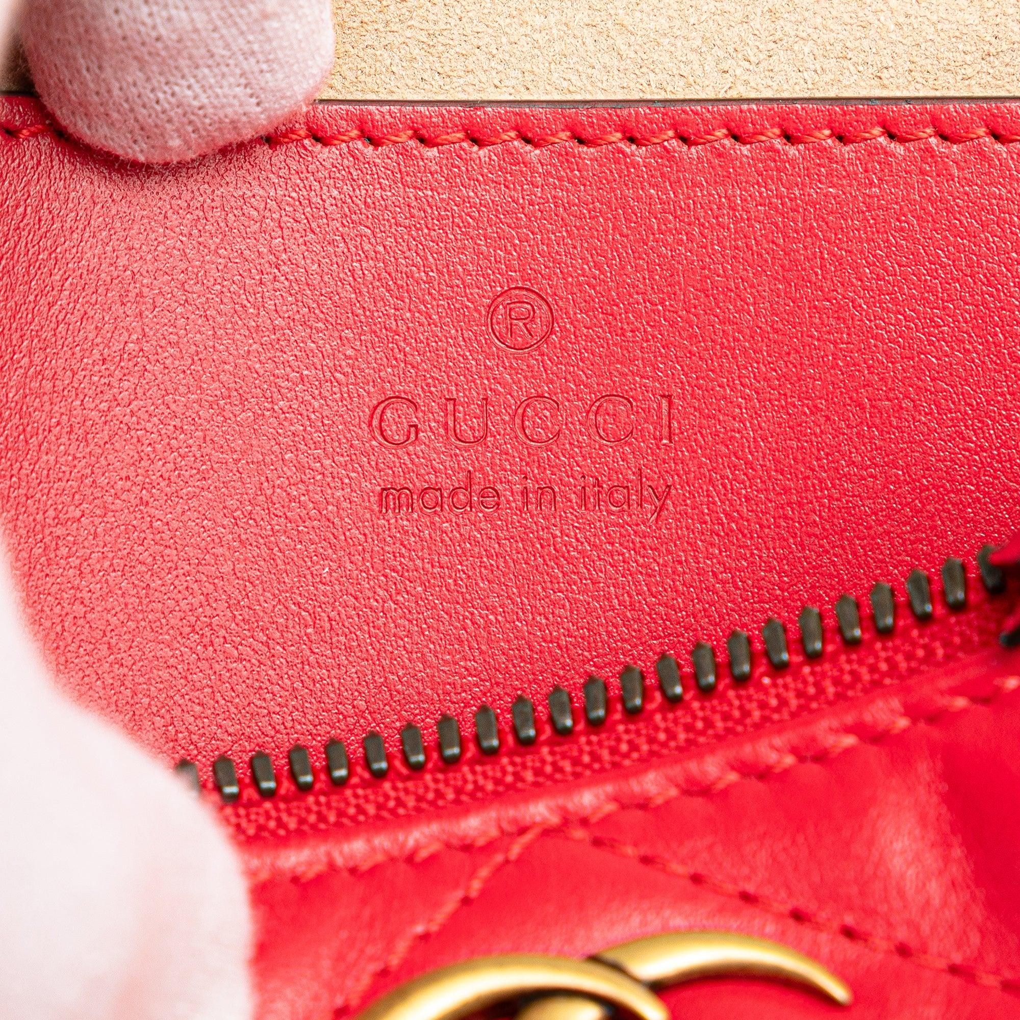 Product Details: Red Gucci GG Marmont Matelasse Leather Shoulder Bag. This shoulder bag features a quilted leather body, an adjustable flat leather shoulder strap, a top zip closure, and an interior slip pocket. 4.1" L x 8.7" W x 3.5" D, 6.5" drop. Serial number 739166 520981.
