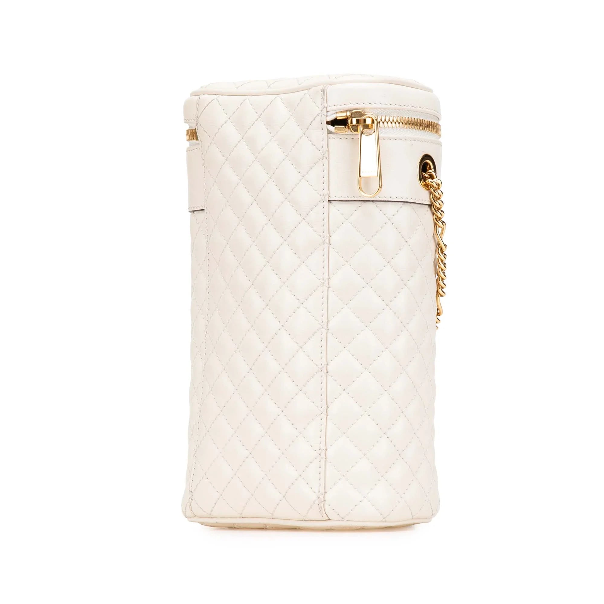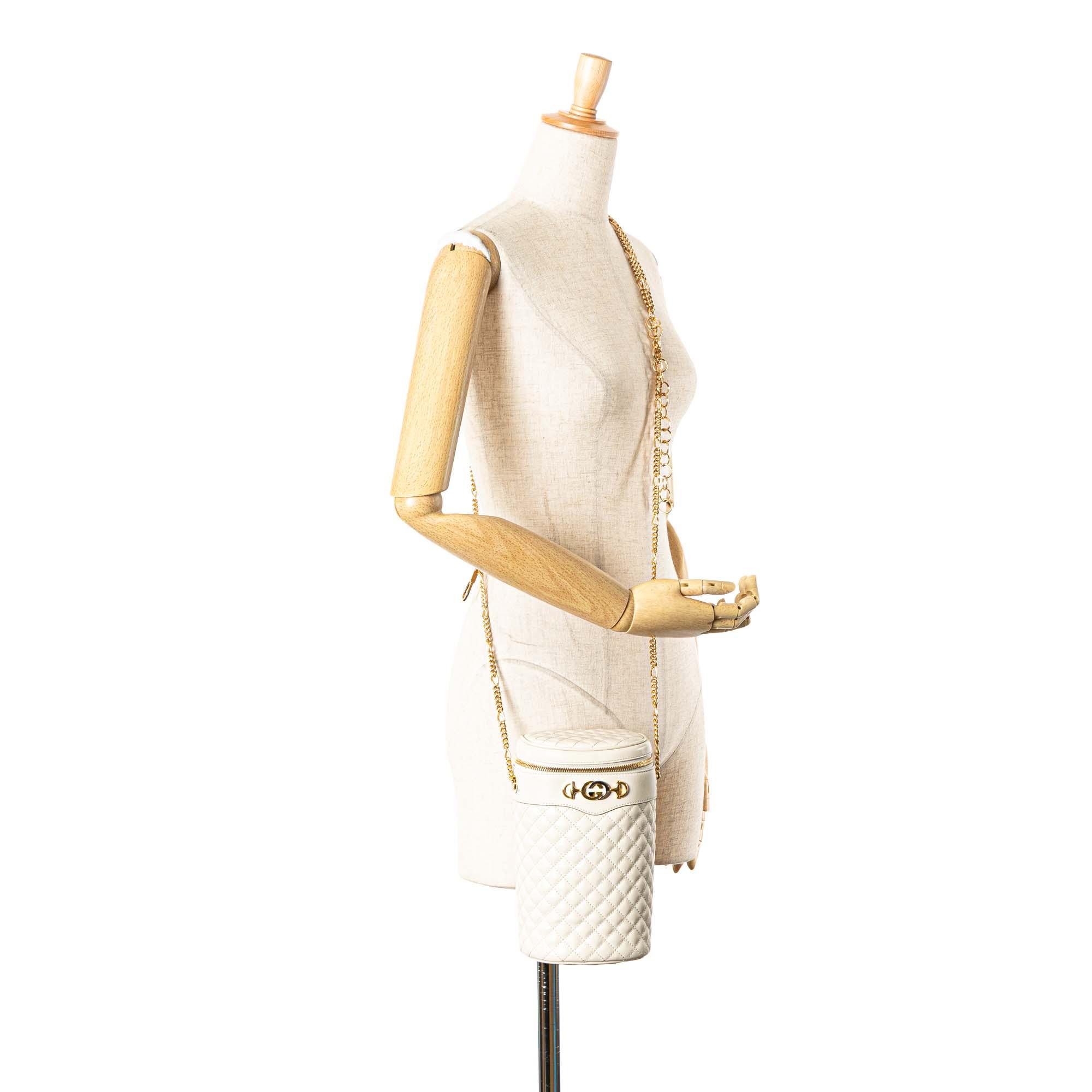Product Details: White Gucci Calfskin Trapuntata Zumi Convertible Bag. The Zumi features a quilted leather body, a detachable chain link strap, and top zip-around closure. 8.5" L x 4.7" W x 3.5" D. Serial number 572298 562600.