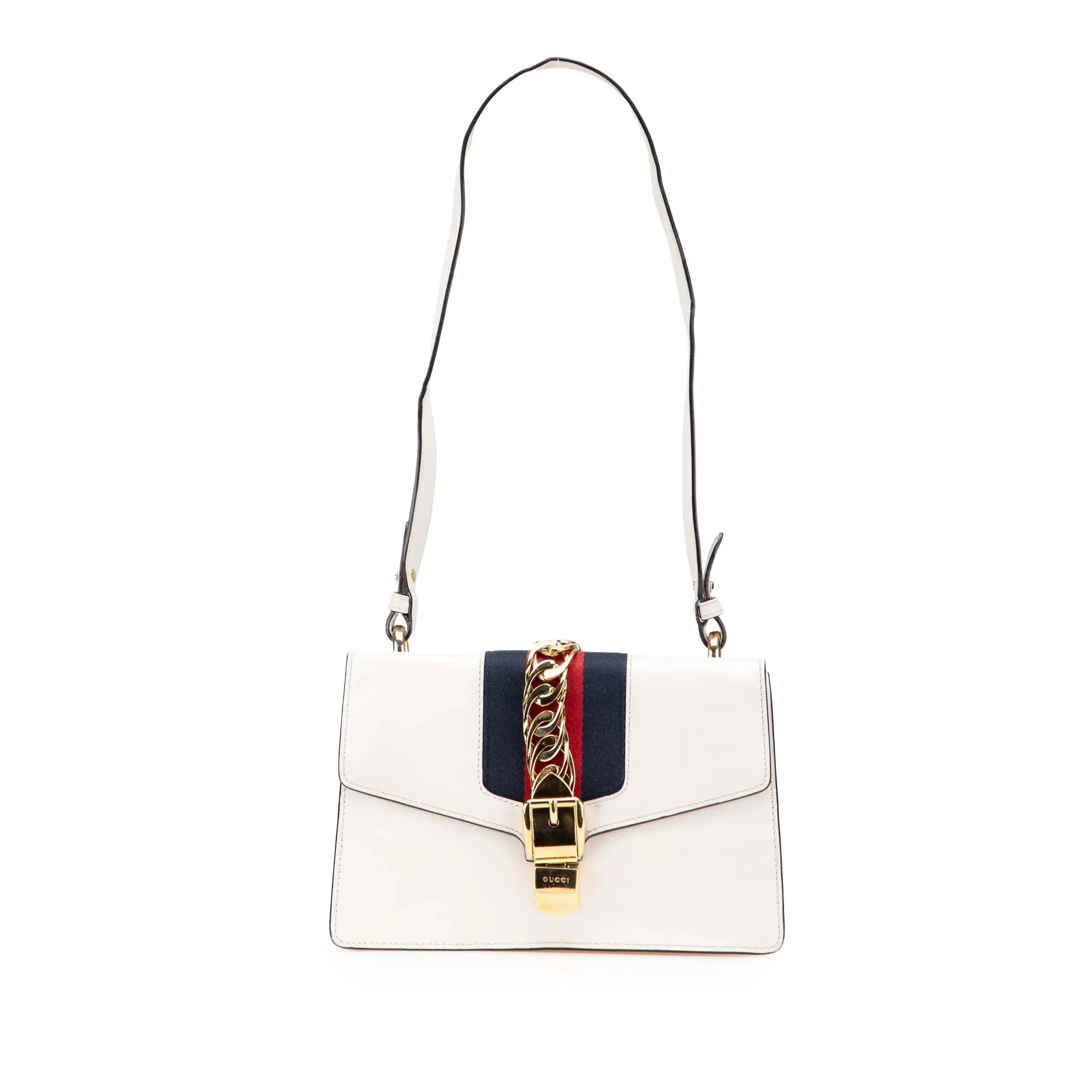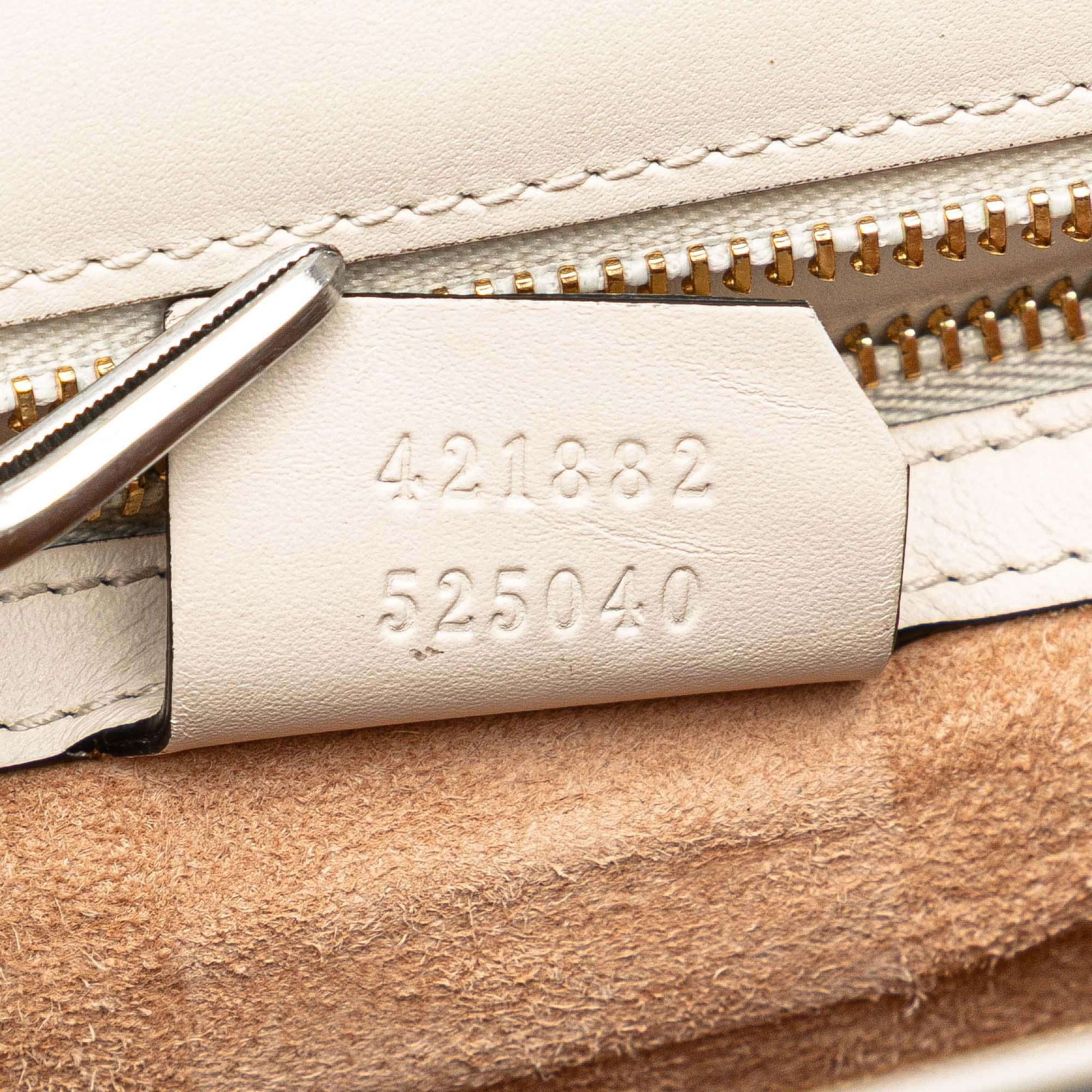 Product Details: White Gucci Small Leather Sylvie Satchel. The Sylvie features a leather body, a flat leather handle, a front flap with push lock closure, and an interior slip pocket. 6.7" L x 10" W x 2.4" D. Serial number 421882 525040.