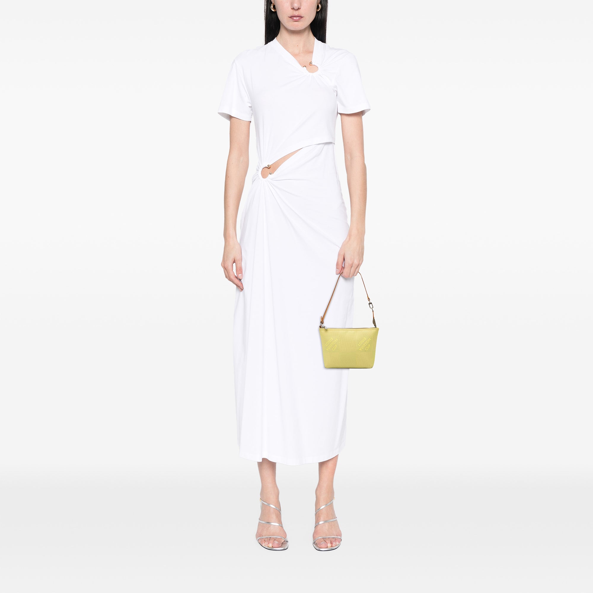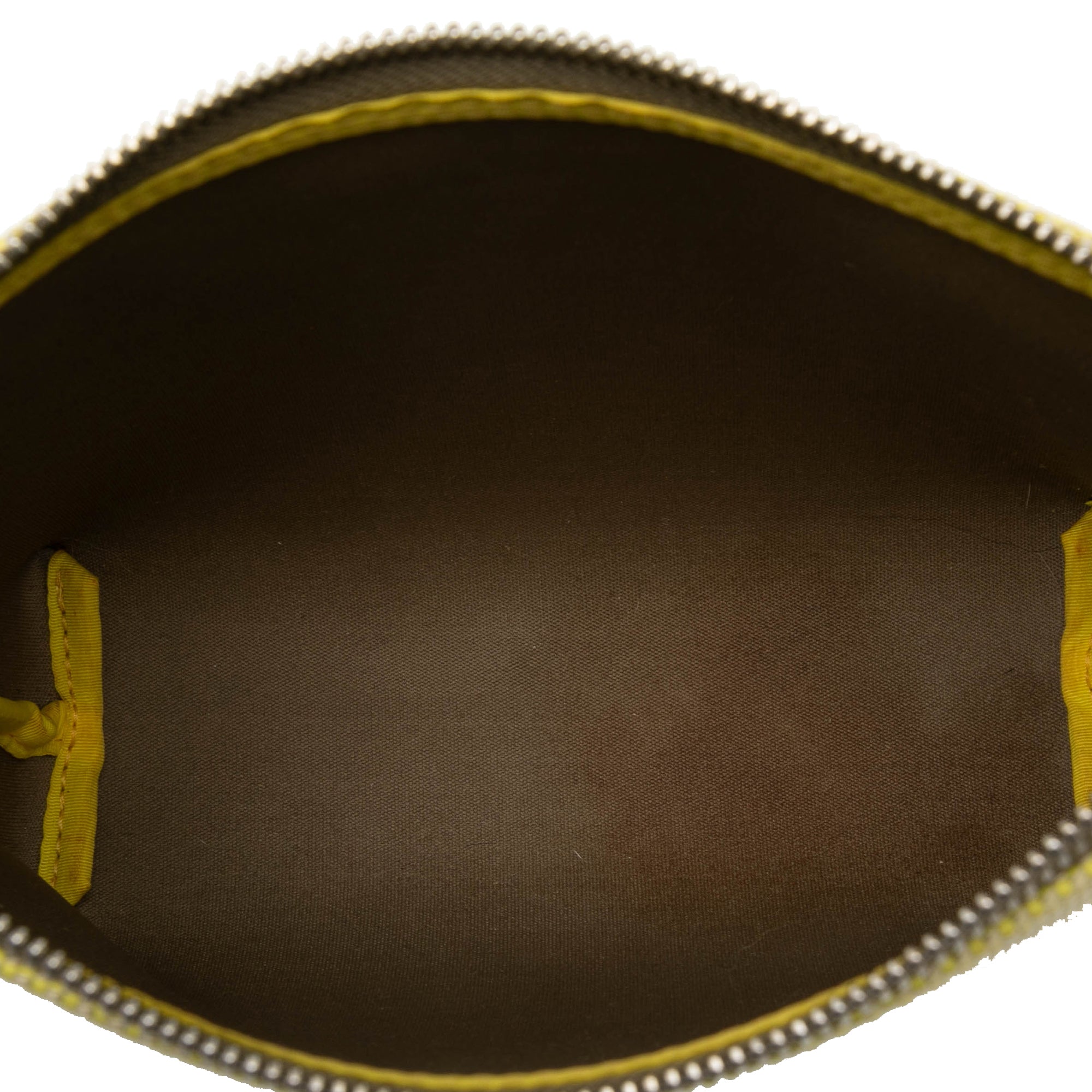 Product Details: Green Louis Vuitton Damier Geant LV Cup Volunteer Pochette Shoulder Bag. The LV Cup Volunteer Pochette features a canvas body, a flat vachetta leather strap, and a top zip closure. 5.7" L x 6.7" W x 2.4" D, 8.7" drop. Serial number SP0062.