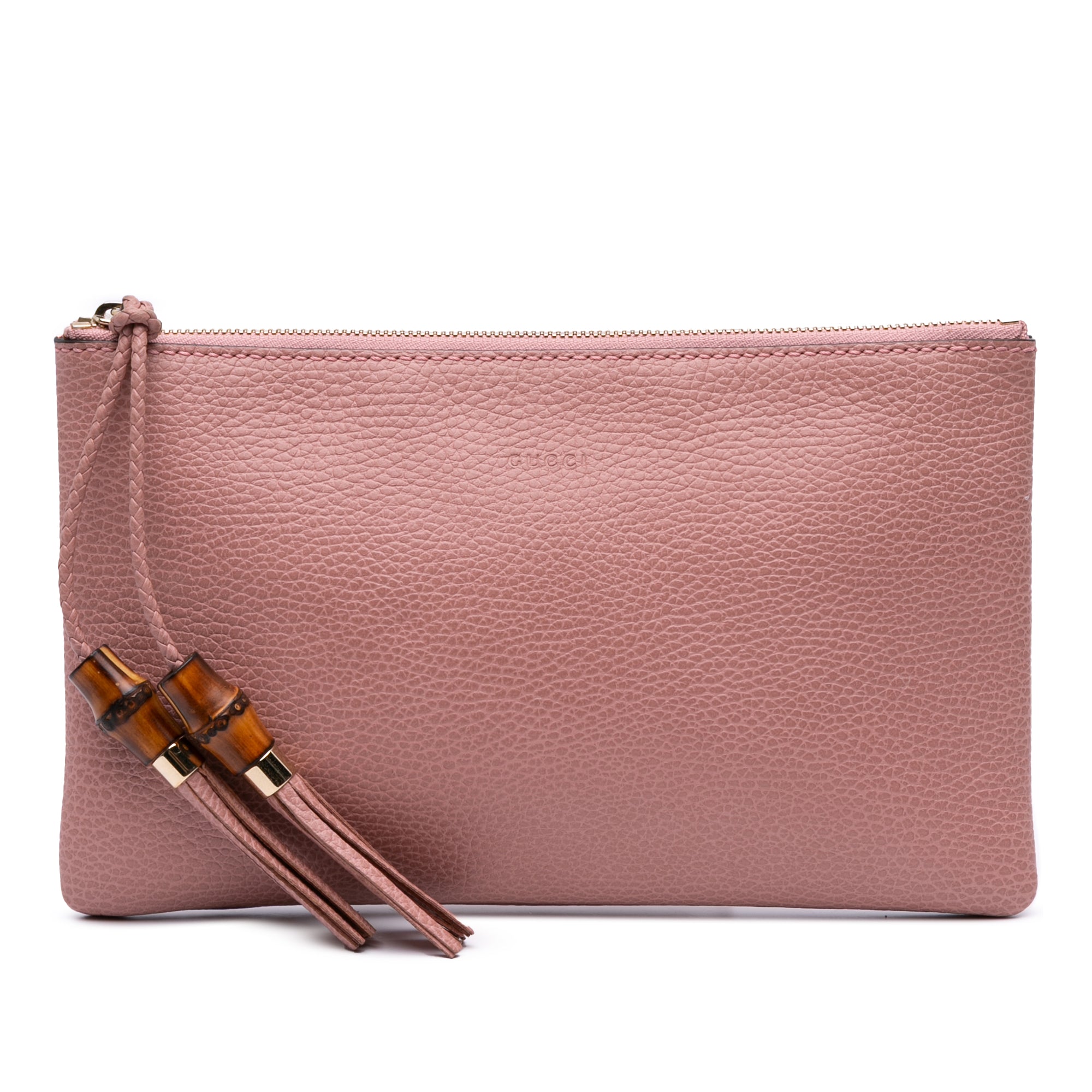 Product Details: Pink Gucci Calfskin Bamboo Clutch. This clutch bag features a leather body, a top zip closure with bamboo and tassel details, and an interior slip pocket. 6.3" L x 10.2" W x 0.2" D. Serial number 449652 493075.
