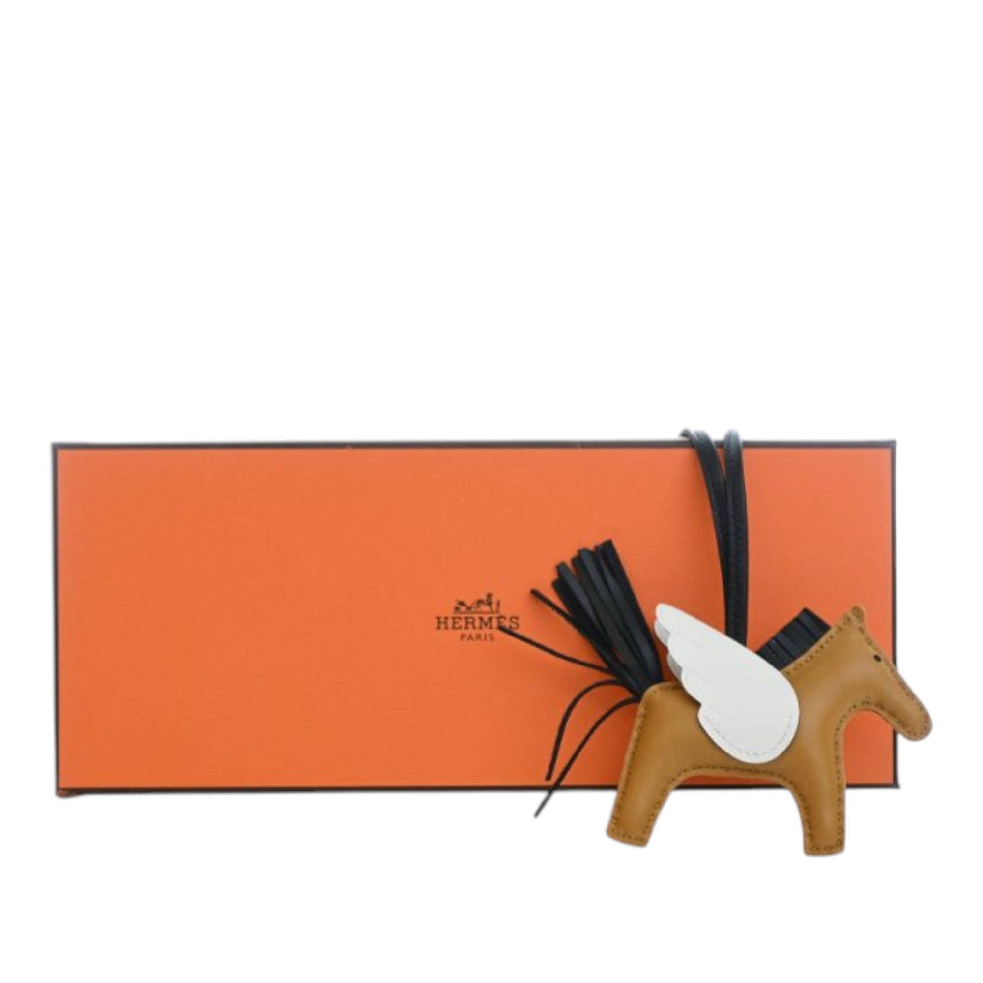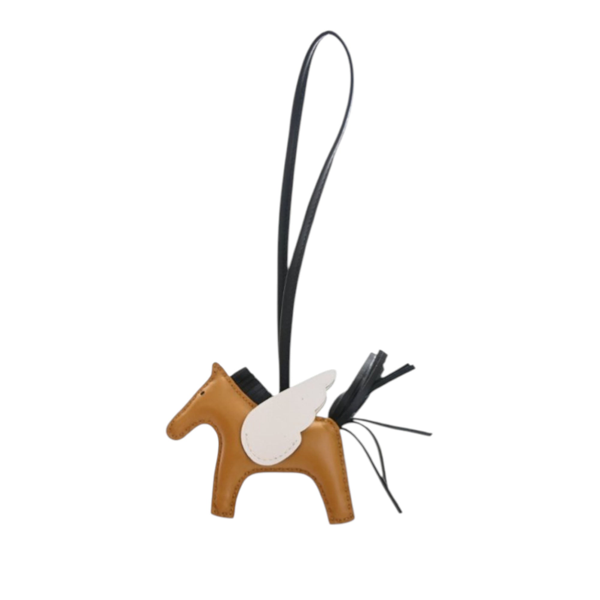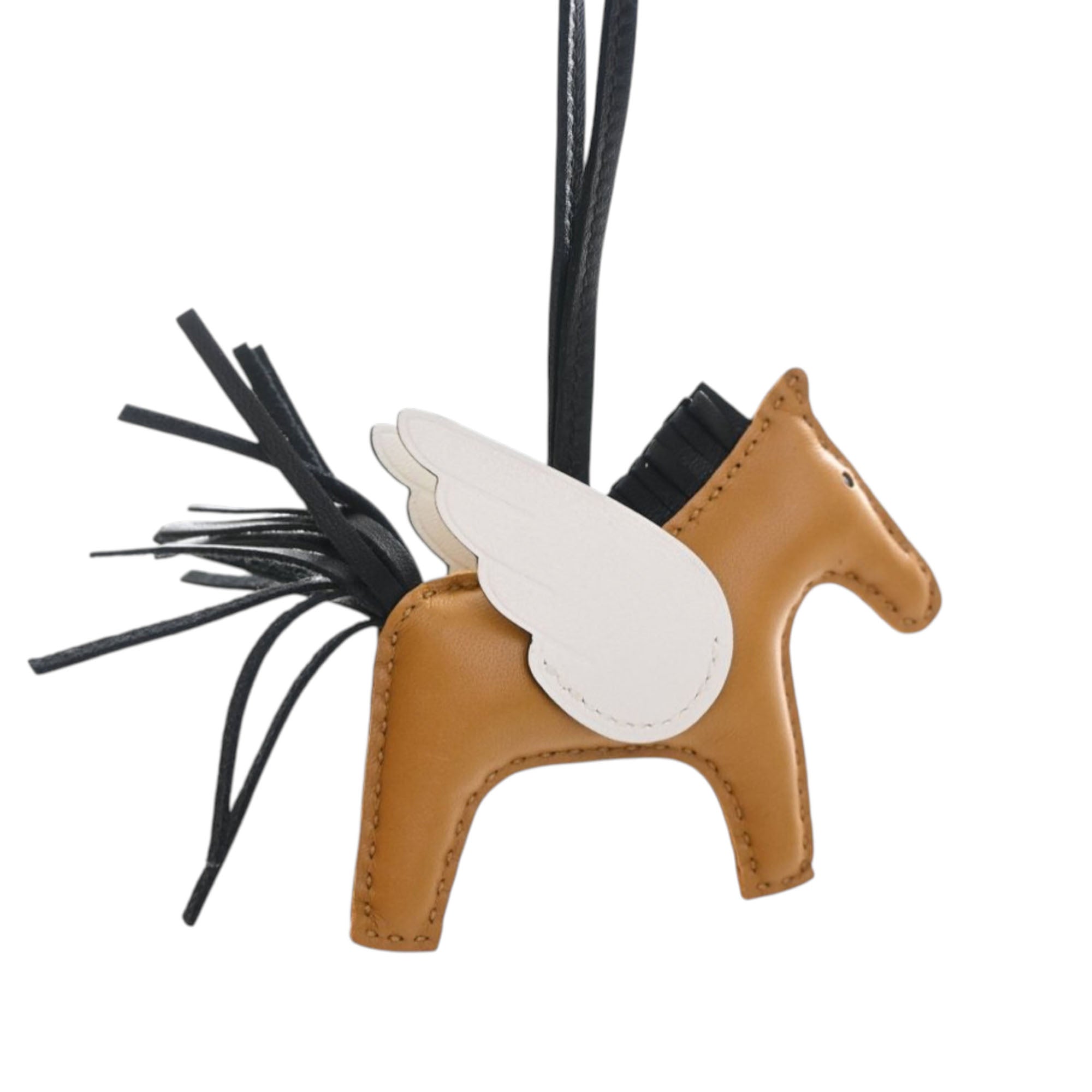 Product Details: Brown Hermès Milo Lambskin and Swift Grigri Rodeo Pegase Bag Charm PM Key Chain. This Rodeo Pegase bag charm features a Milo lambskin and Swift leather body in Chai, Noir and Nata color, and a flat leather strap. 2.8" L x 3.5" W x 0.6" D. Serial number B.